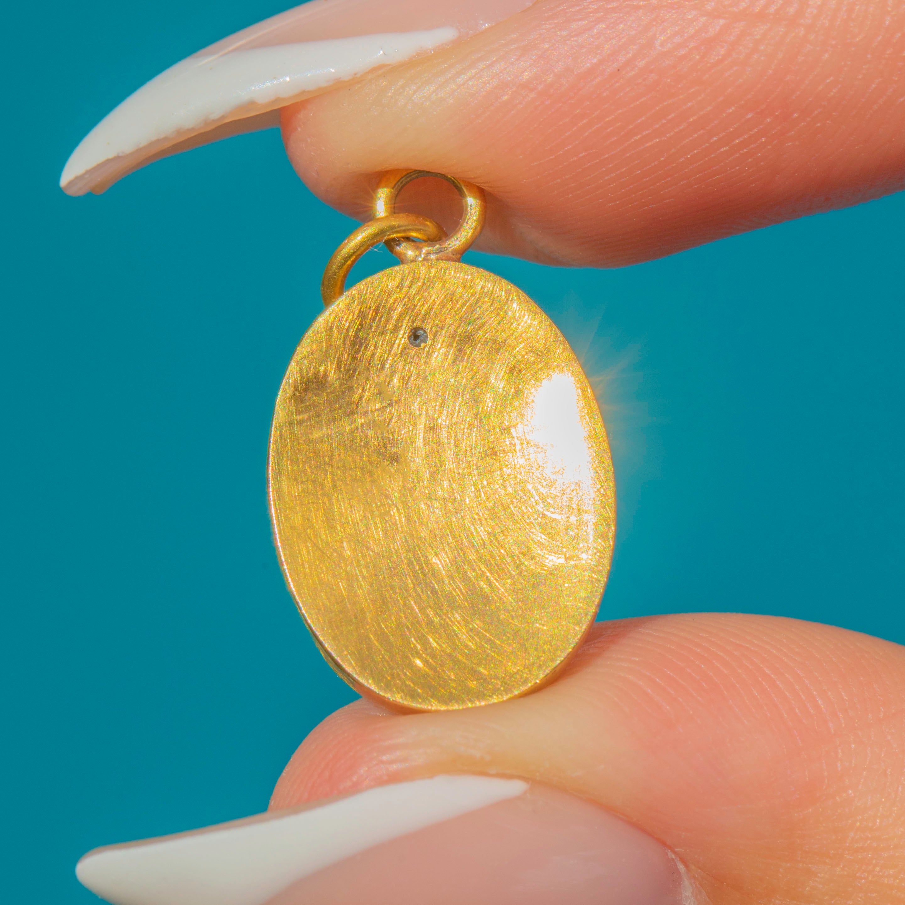 A sweet Victorian oval pendant in rich 15ct Gold, engraved with an eight-point star and set at the centre with a lustrous Pearl. The satiny brushed finish and crisp star motif make this a chic everyday talisman that layers beautifully on a fine chain.