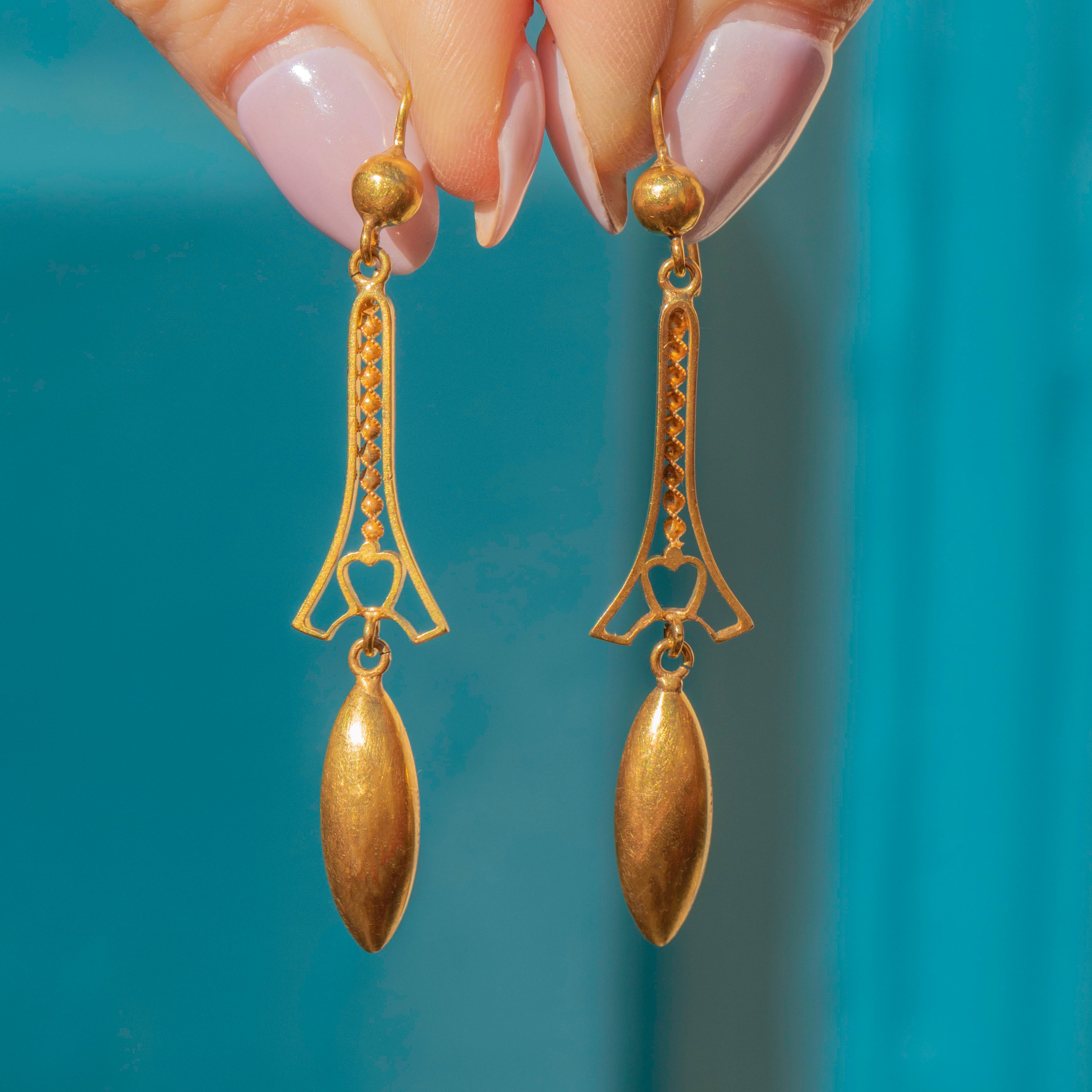VERY GOOD-EXCELLENT. These Victorian 15ct Gold Torpedo drop earrings are in great condition. Beautifully crafted, their intricate design has stood the test of time with each component securely affixed. There are some minor signs of wear to the earrings commensurate with age, however, this is not noticeable while wearing. The Gold is brightly saturated and the slender hooks provide comfortable wear. In such great condition, these earrings are a real treat!