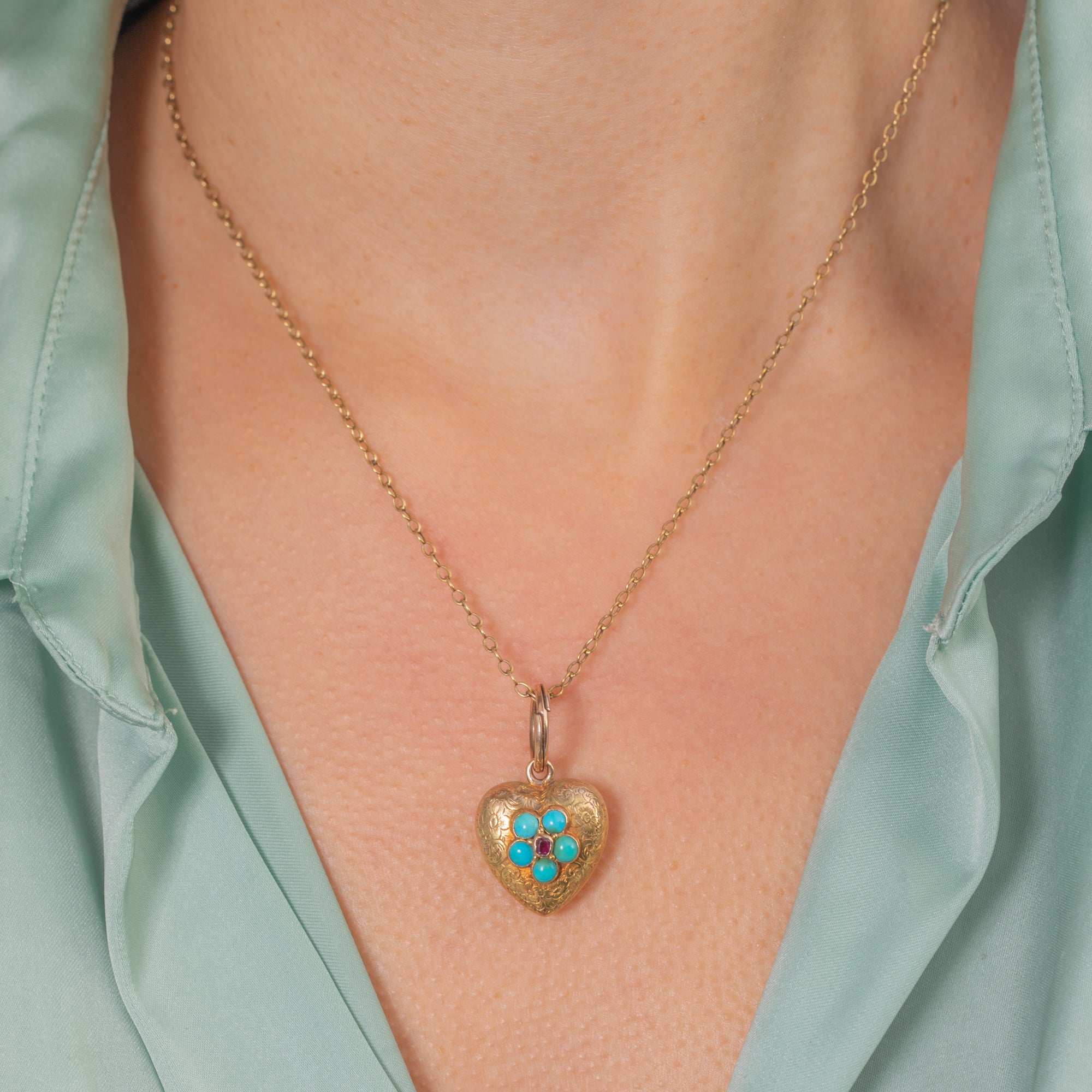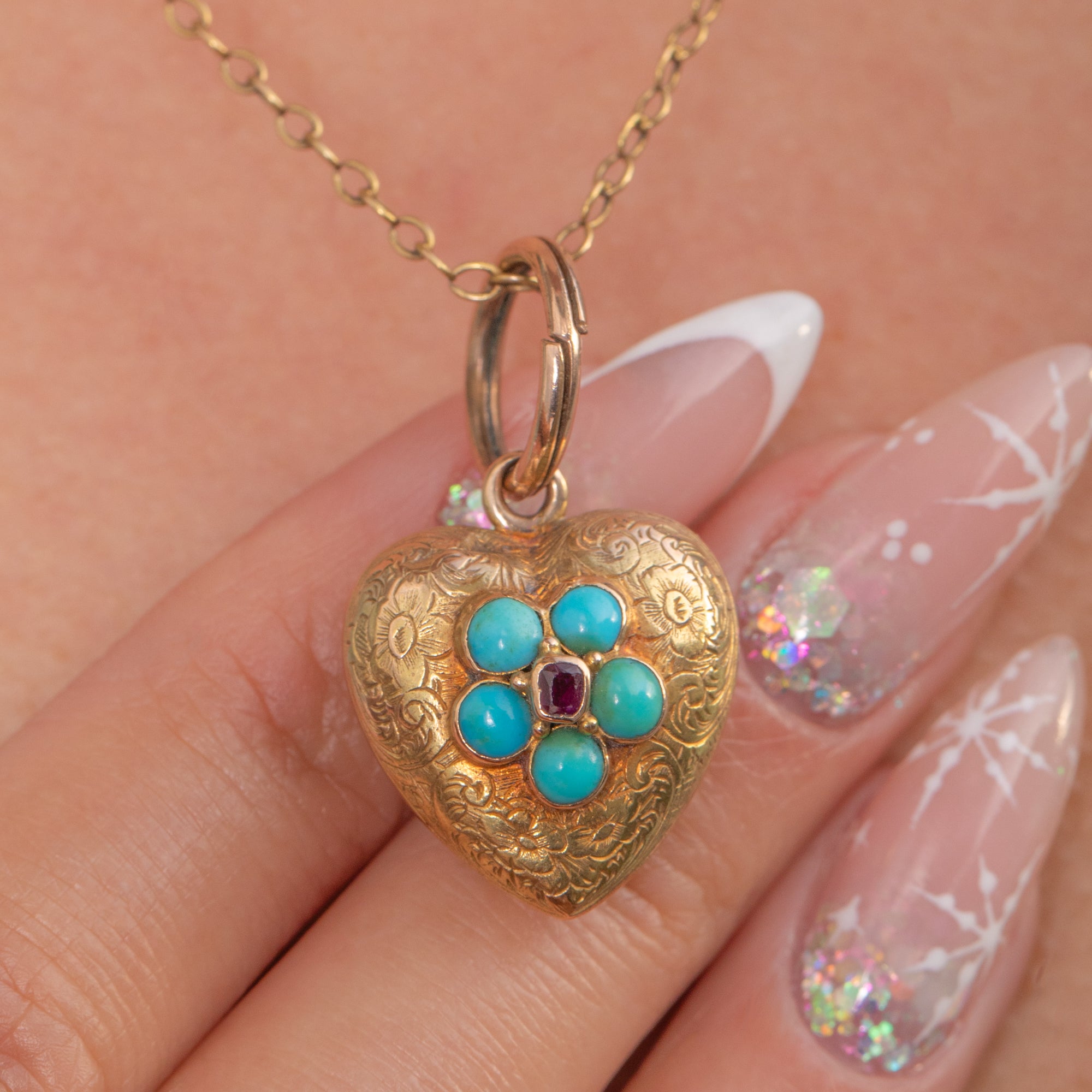 ヴィクトリアン 15ct ゴールド ターコイズとガーネット ハート ロケット ペンダント