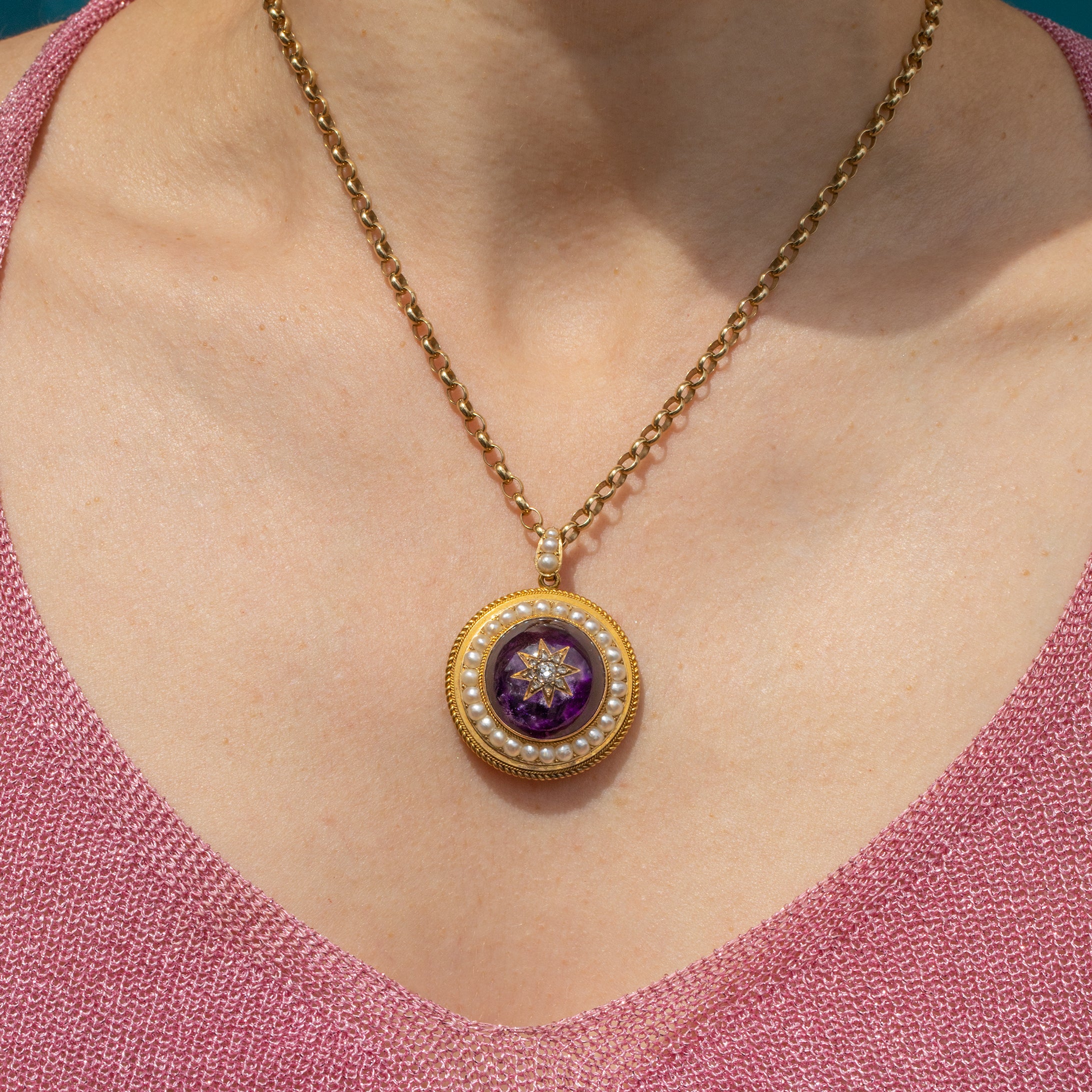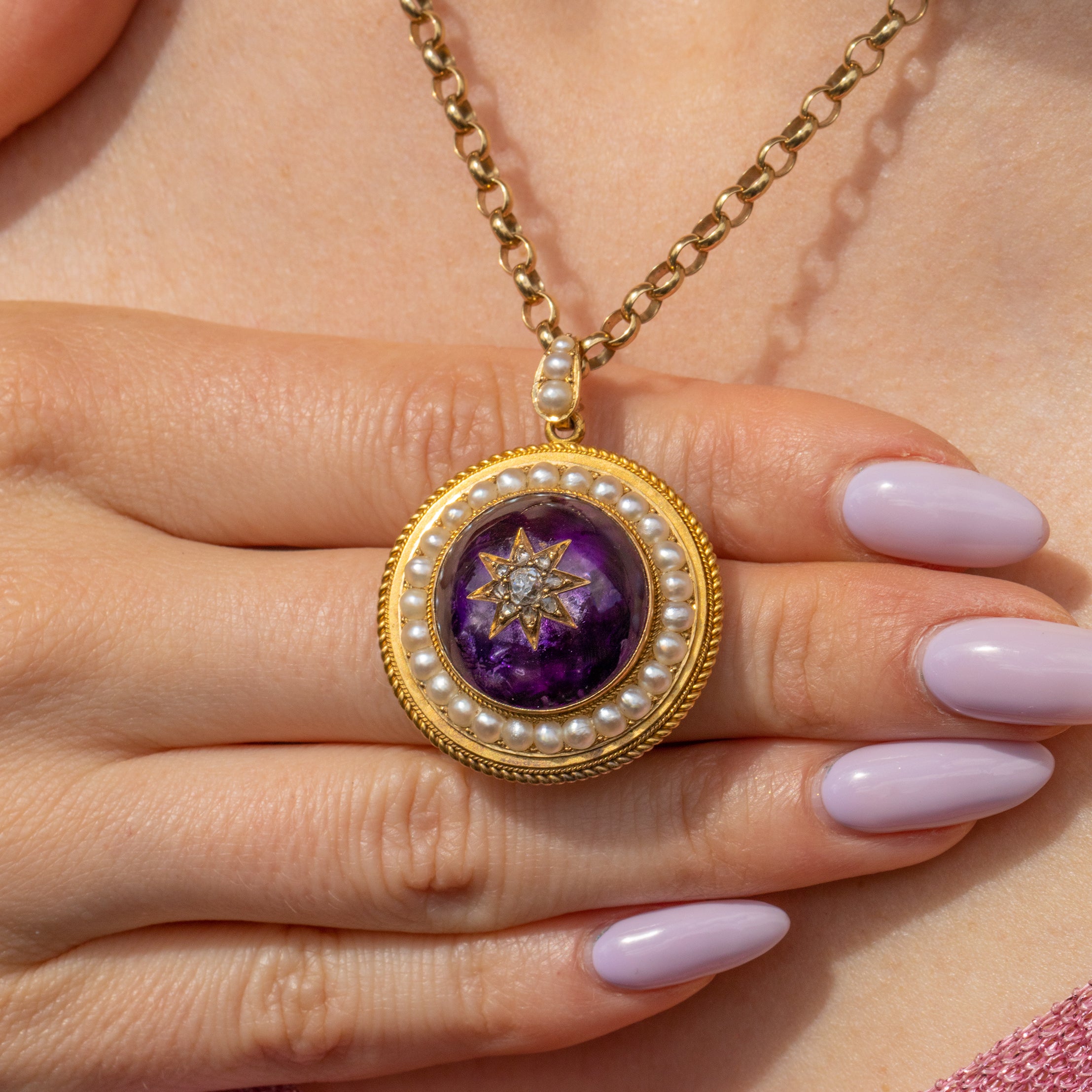 VERY GOOD-EXCELLENT. This Victorian 18ct Gold Amethyst cabochon pendant is in wonderful condition throughout. The Gold is brightly saturated with only minimal surface wear, commensurate with age. The Amethyst is smoothly cut and securely set, free from chips, only under close inspection is there some wear to the foiling visible. The Pearls have a consistent shimmer throughout and the Diamonds are pristine. The woven hair in the locket back is immaculate and secure within the compartment, which can be opened to change its contents. With a securely affixed bale, you can suspend this superb Victorian pendant from your favourite Gold chain with ease!