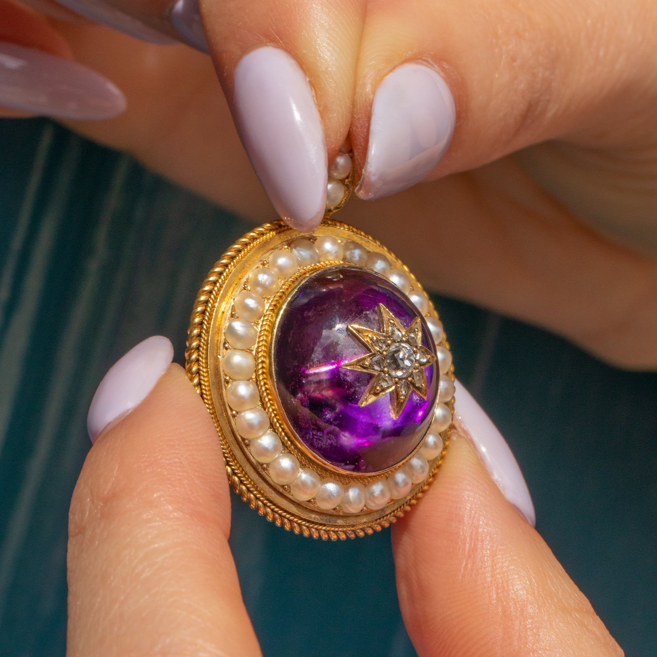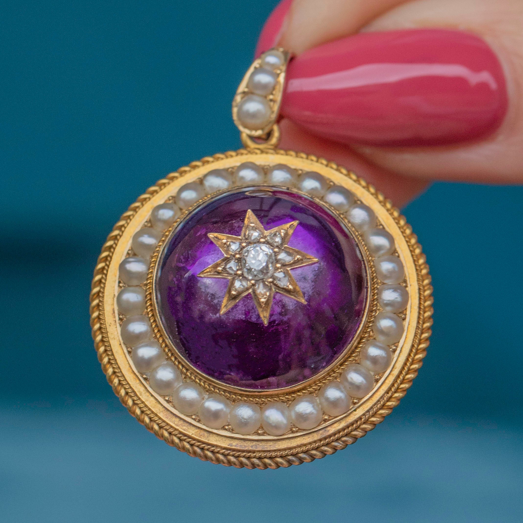 Grab the attention of any onlooker with this phenomenal Victorian 18ct Gold Amethyst cabochon pendant! Bringing undeniable celestial charm to your collection, this antique pendant has been exquisitely crafted from sumptuous 18ct Gold and boasts a large 10.90ct foiled Amethyst set with a Diamond-encrusted star in her centre.