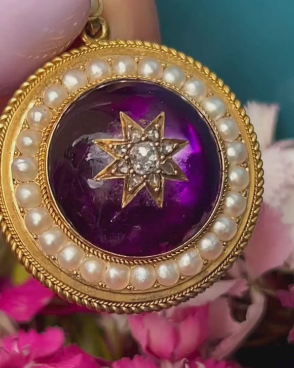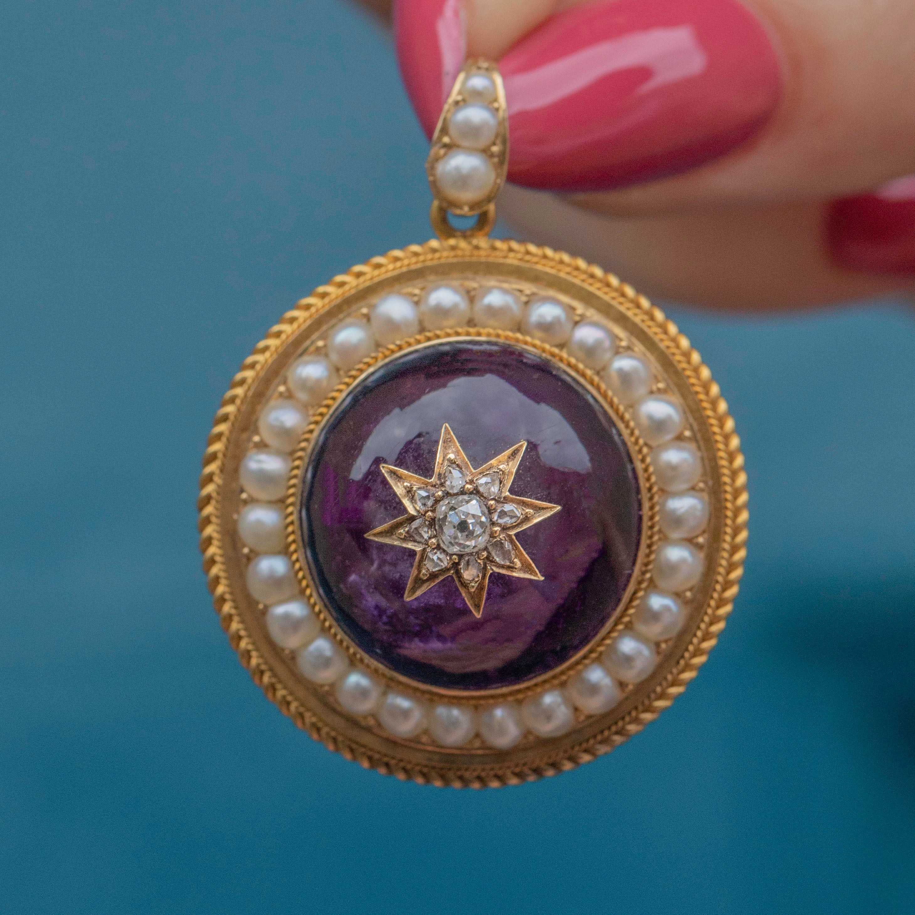 Victorian 18ct Gold Amethyst Cabochon Pendant, Diamond Star Burst Centre