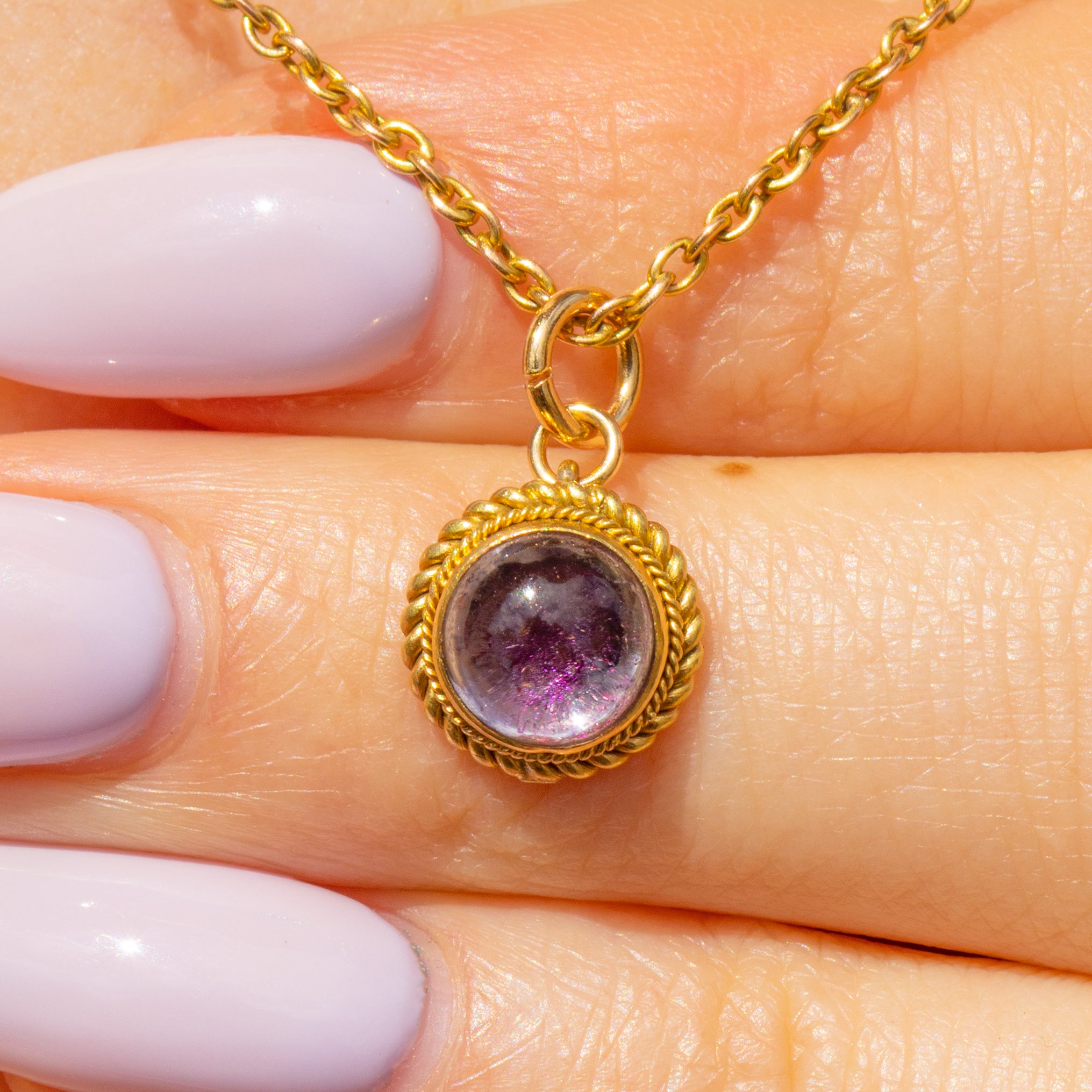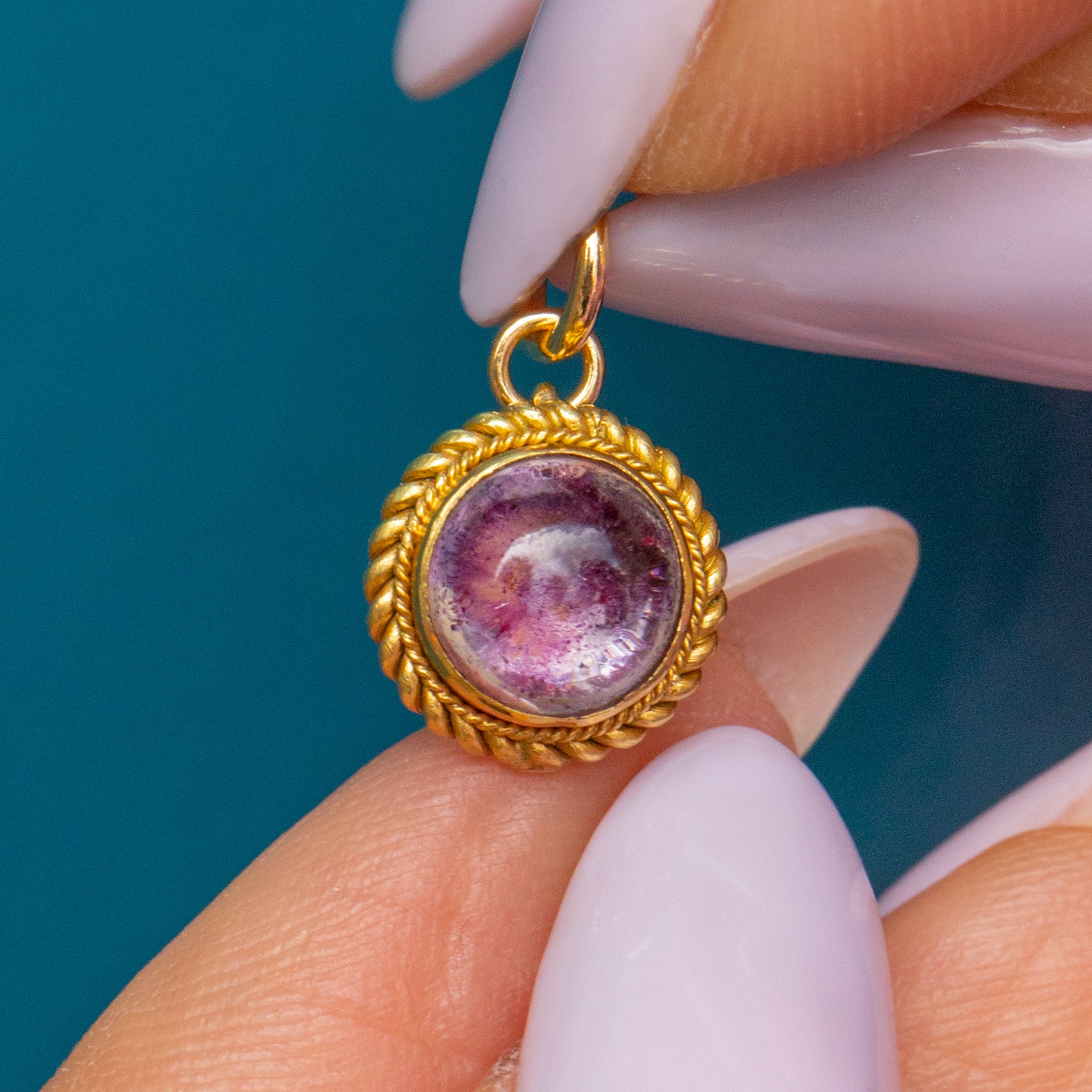 Bordered by rope detailing to finish, care and attention to detail have been given to this antique Amethyst charm. Once suspended from an antique Gold chain, she will become a firm favourite within your jewellery collection.