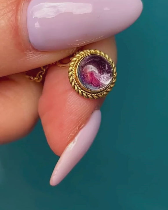 This Victorian 18ct Gold Amethyst charm is sure to have you spellbound. Akin to a mystic crystal ball, deep violet hues sit at the core of her Amethyst cabochon, encased by a buttery 18ct Gold setting.