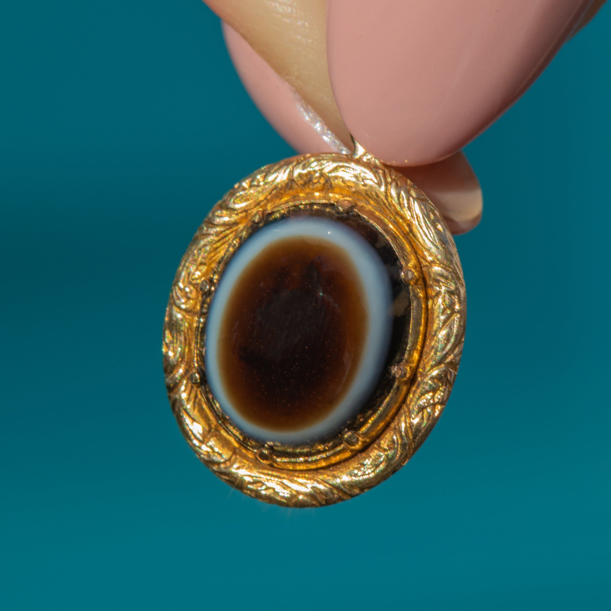 The "bull's eye" Agate contrasts beautifully with the honey-hued Gold, complete with a decorative engraved border to create a unique and striking piece of Victorian jewellery!
