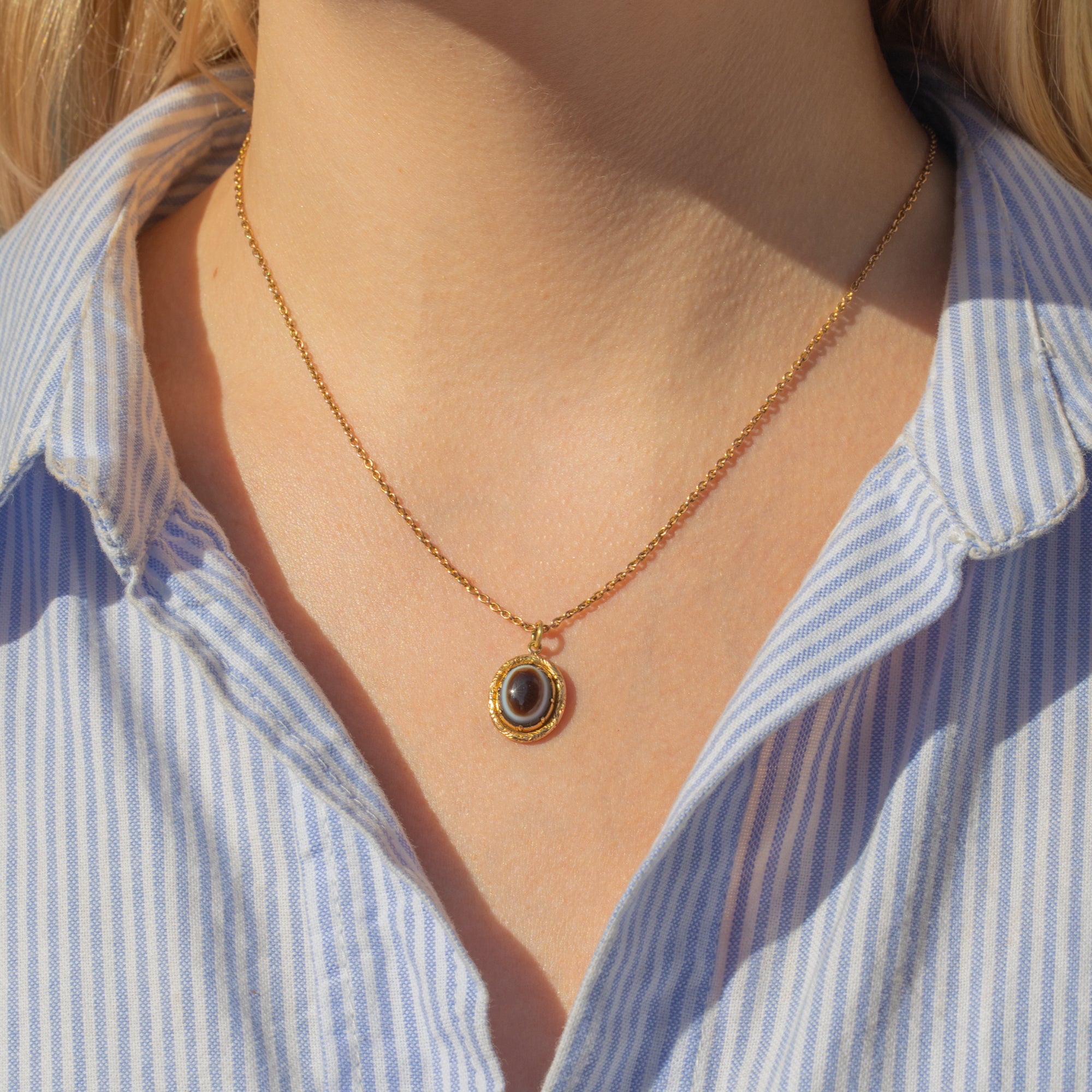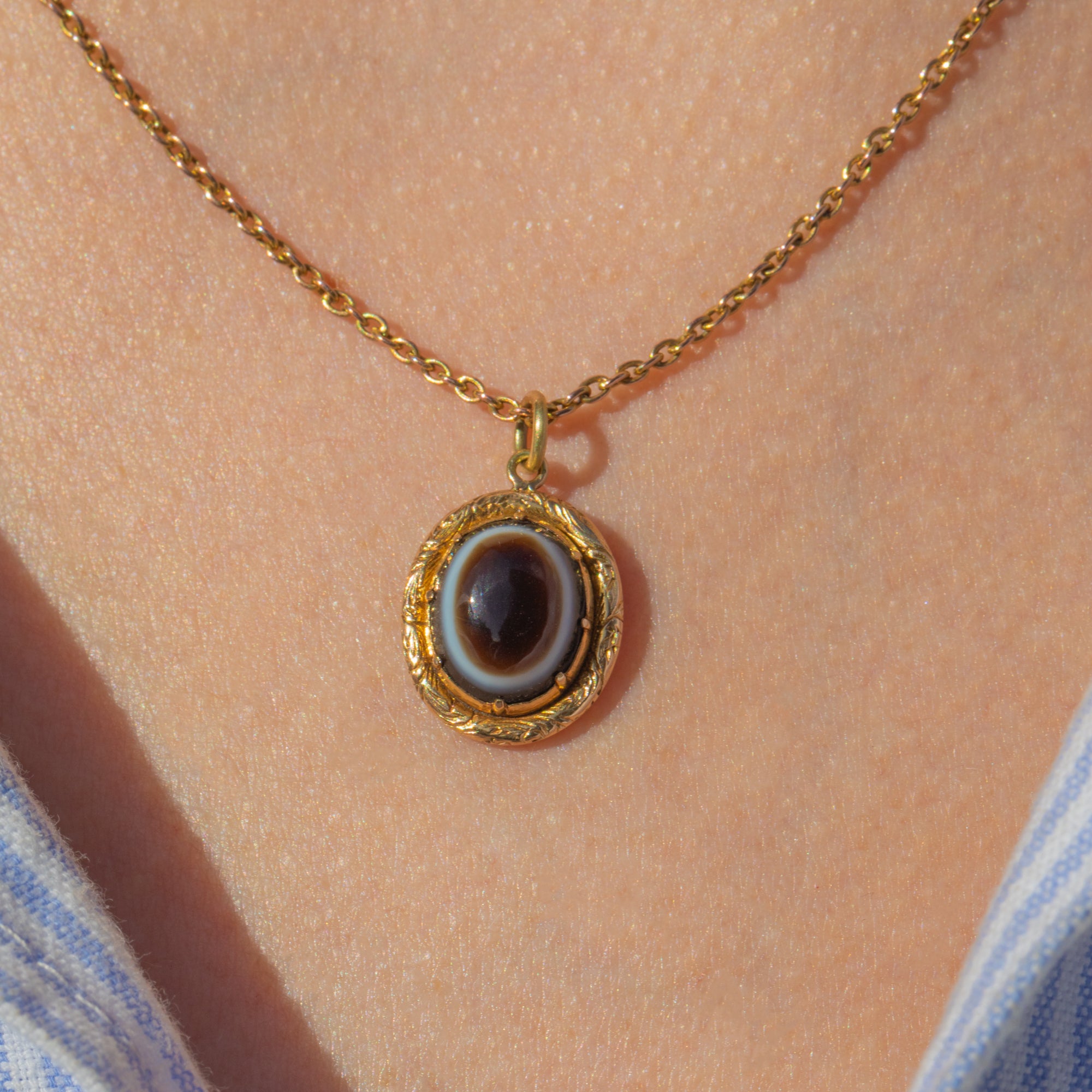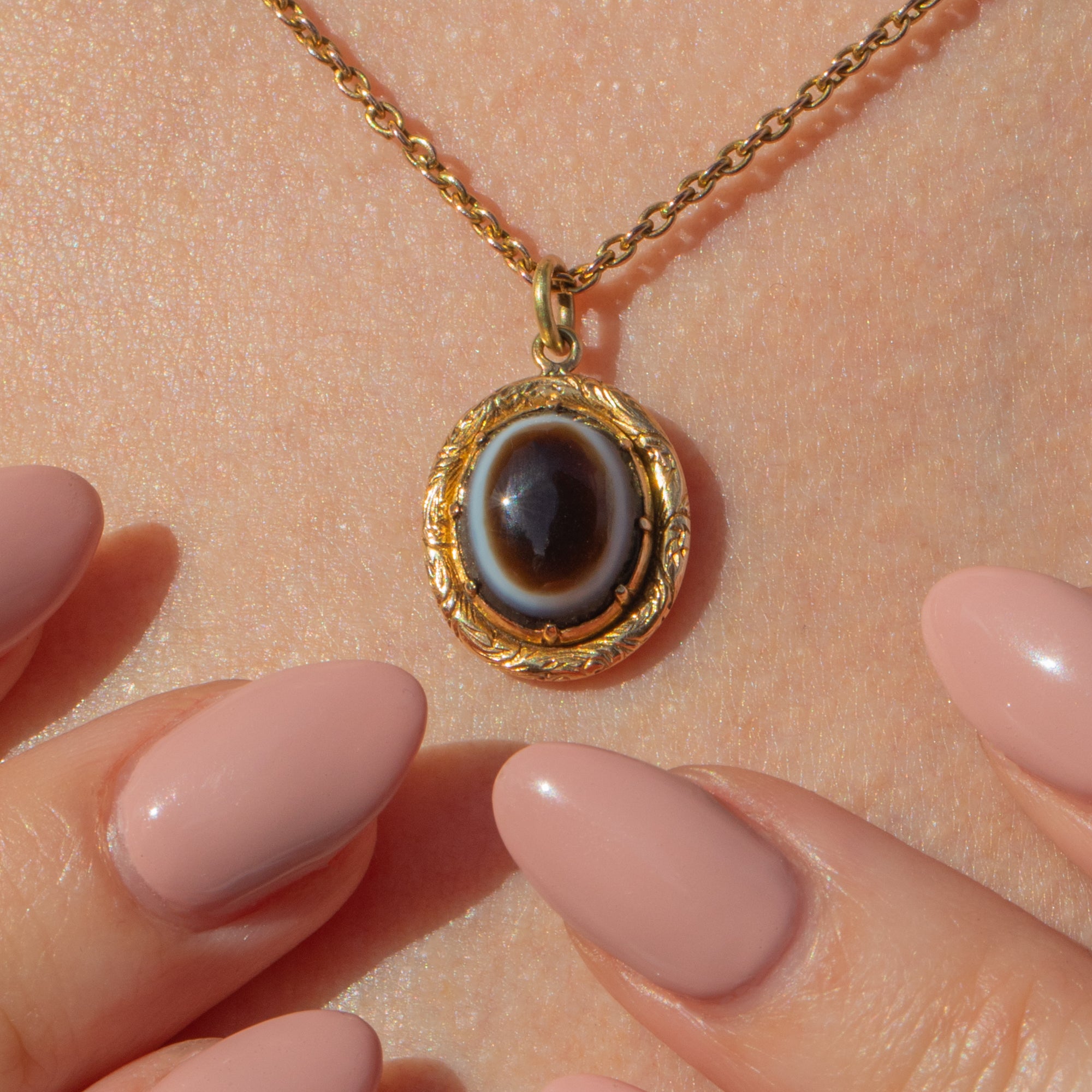 What a gorgeous antique 18ct Gold banded Agate pendant. This lovely piece is super satisfying, crafted entirely from saturated 18ct Gold with a bright finish and showcasing a smooth Banded Agate cabochon in its centre!