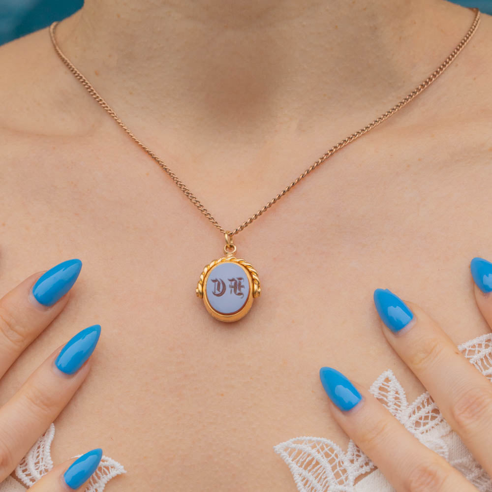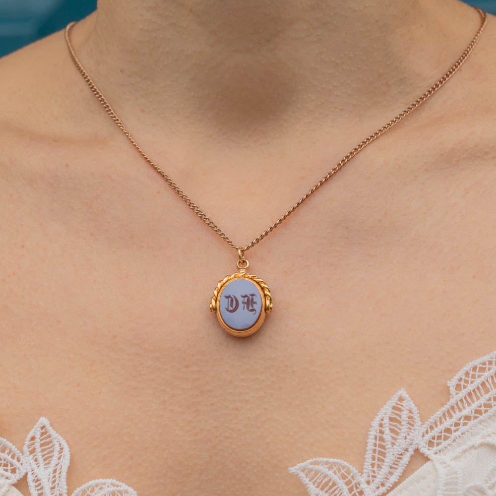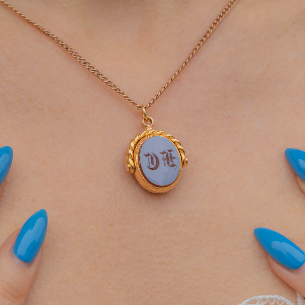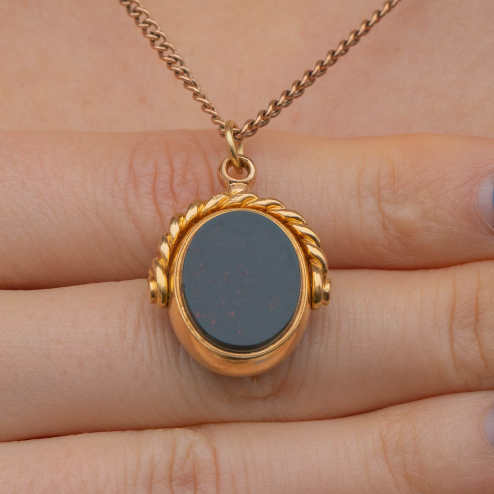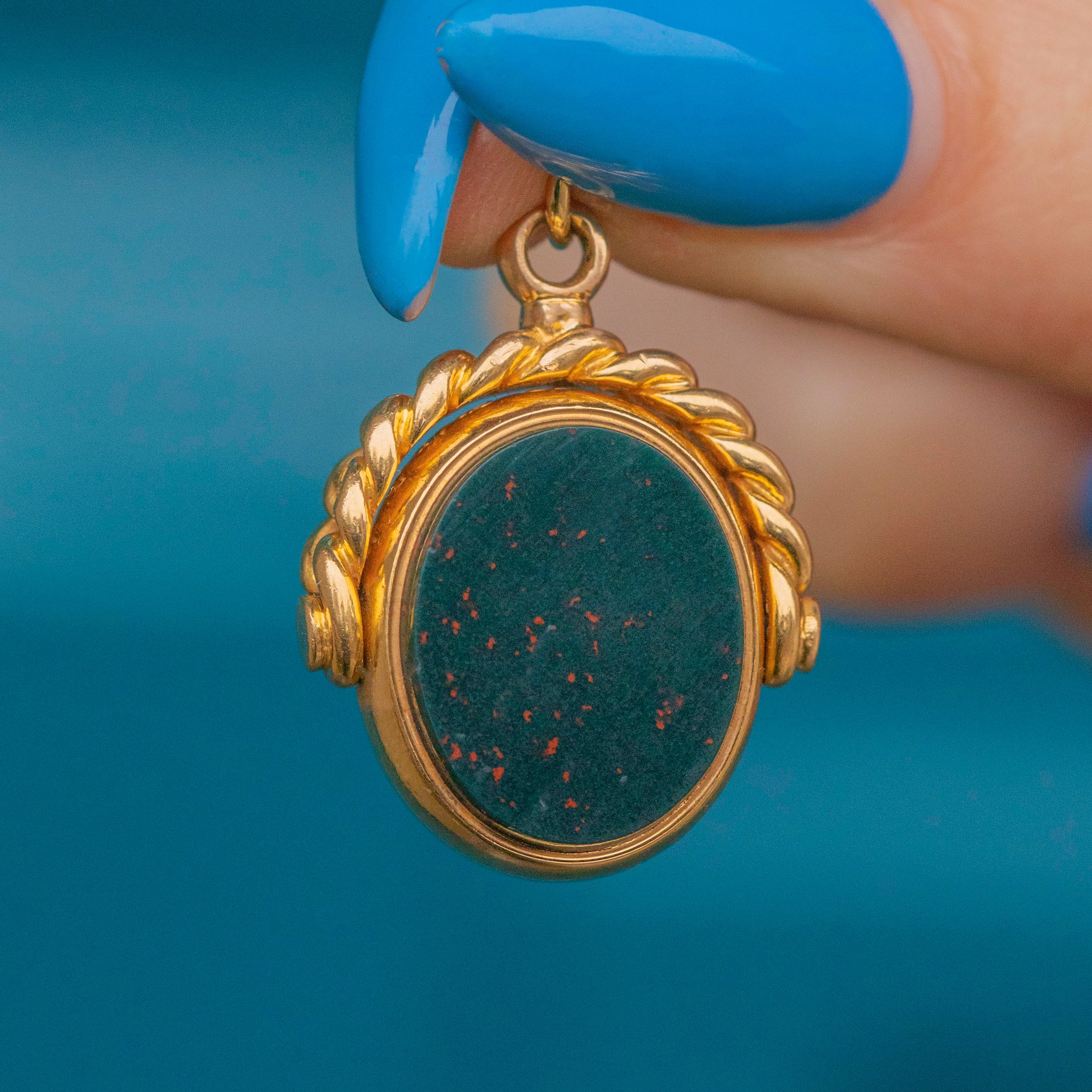 This Victorian 18ct Gold Bloodstone Sardonyx swivel fob pendant is quite the statement piece! Crafted from luscious 18ct Gold and inlaid with Bloodstone and Sardonyx, you'll glimpse flashes of deep terracotta and pale blue as she effortlessly spins.