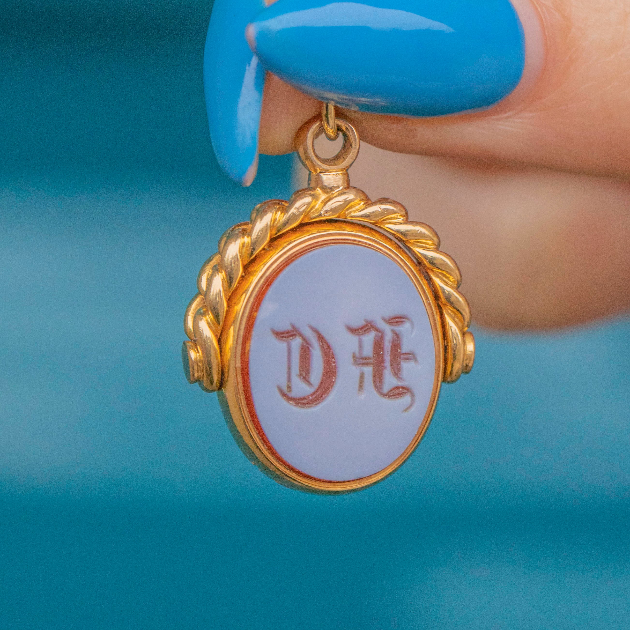 The Sardonyx has been skillfully engraved with an intaglio, adding intrigue to this historical piece. Topped with a characterful curb link bale, this swivel fob pendant is rich in Victorian charm. Suspend this Gold fob from a substantial chain for the ultimate antique look!