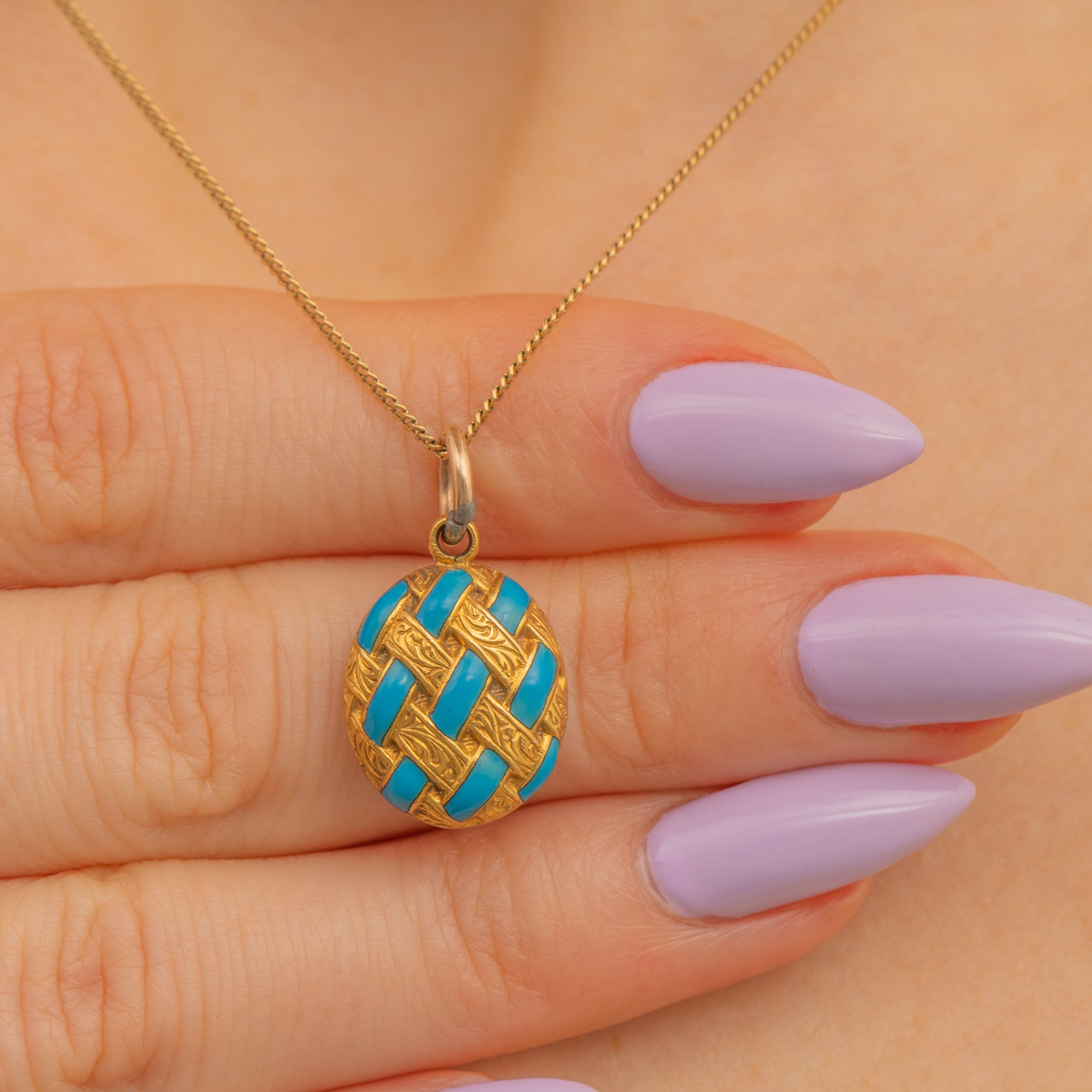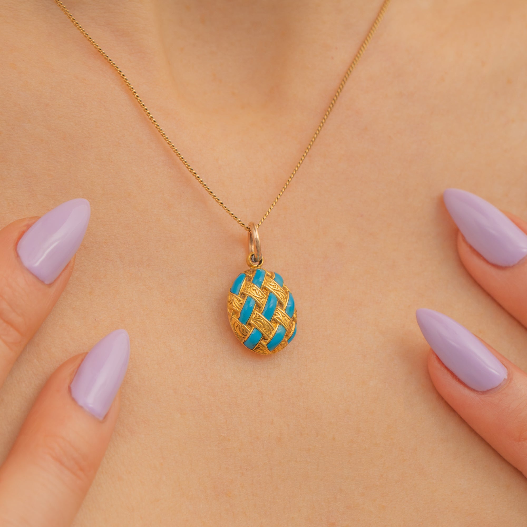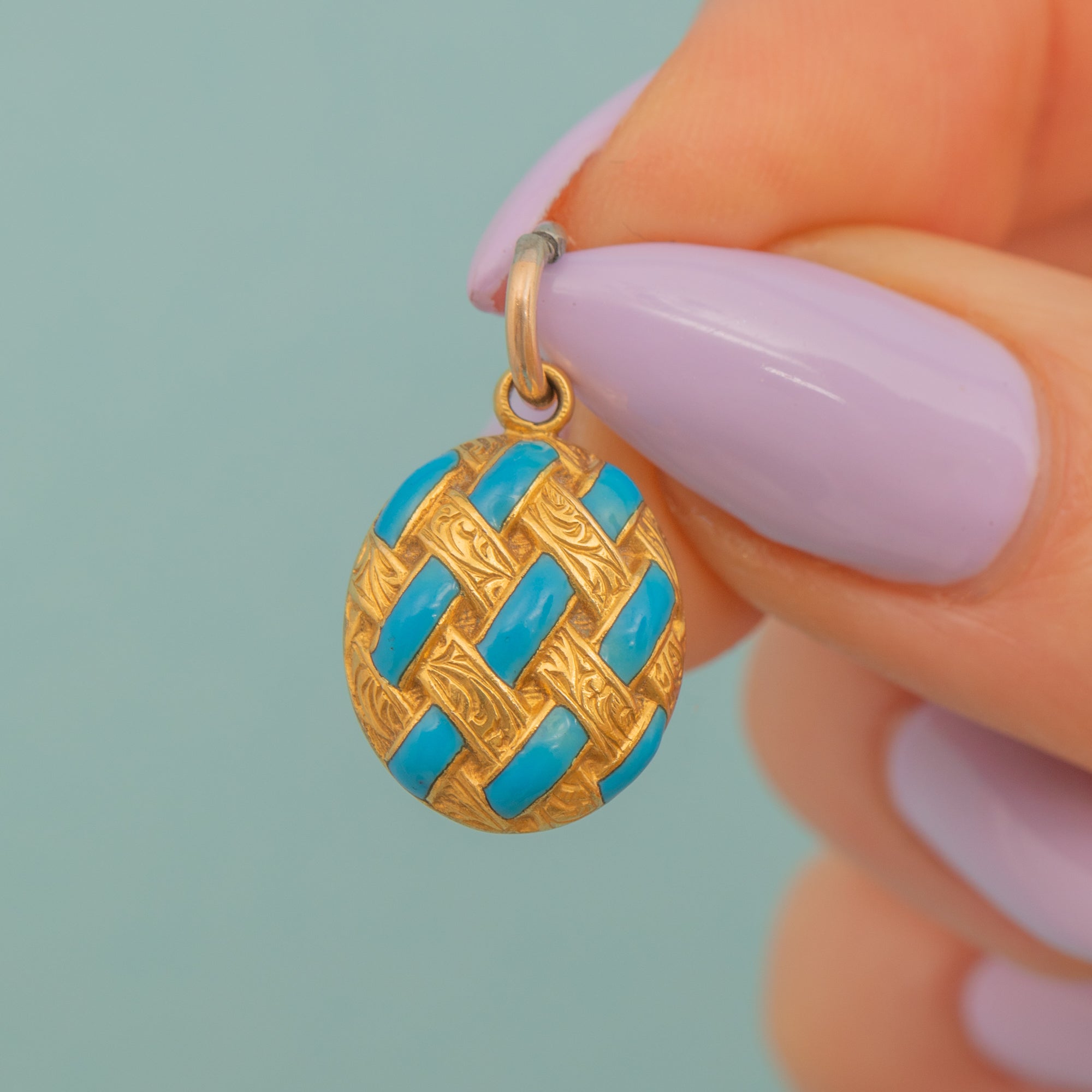 This alluring Victorian 18ct Gold blue Enamel woven locket will make a unique addition to your collection. Made circa 1860, this Victorian locket is comprised of an 18ct Gold engraved body with a woven design, featuring that highly desirable Robin's Egg blue Enamel!