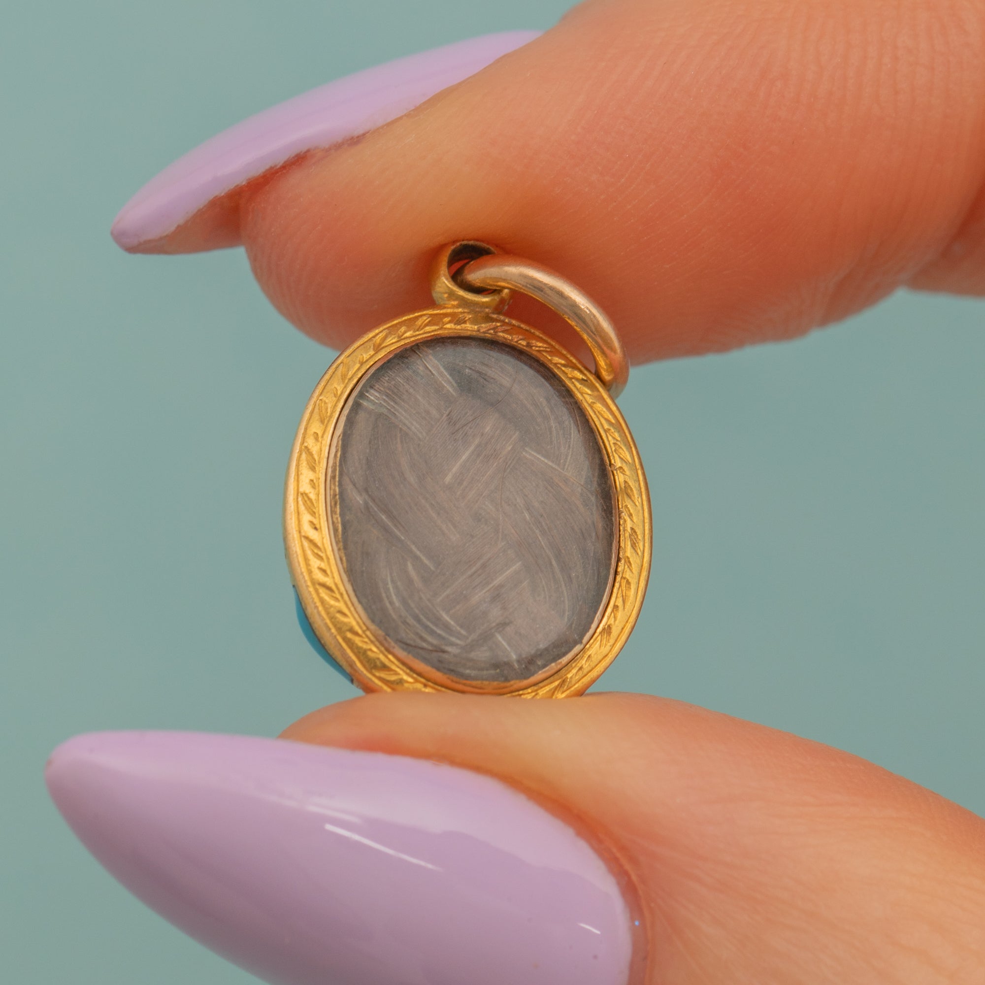 MATERIALS: Tests as 18ct Gold, Blue Enamel, Woven Hair.