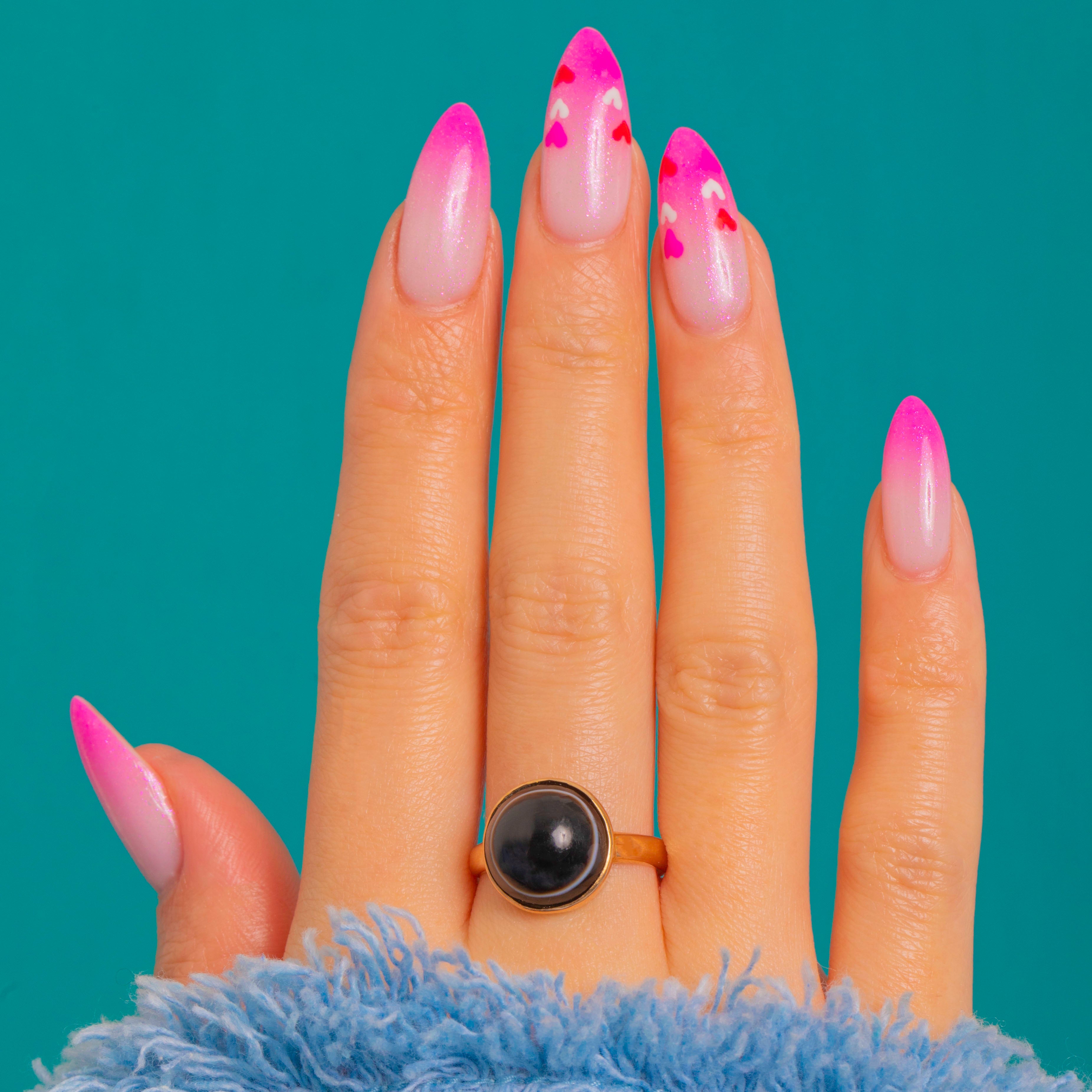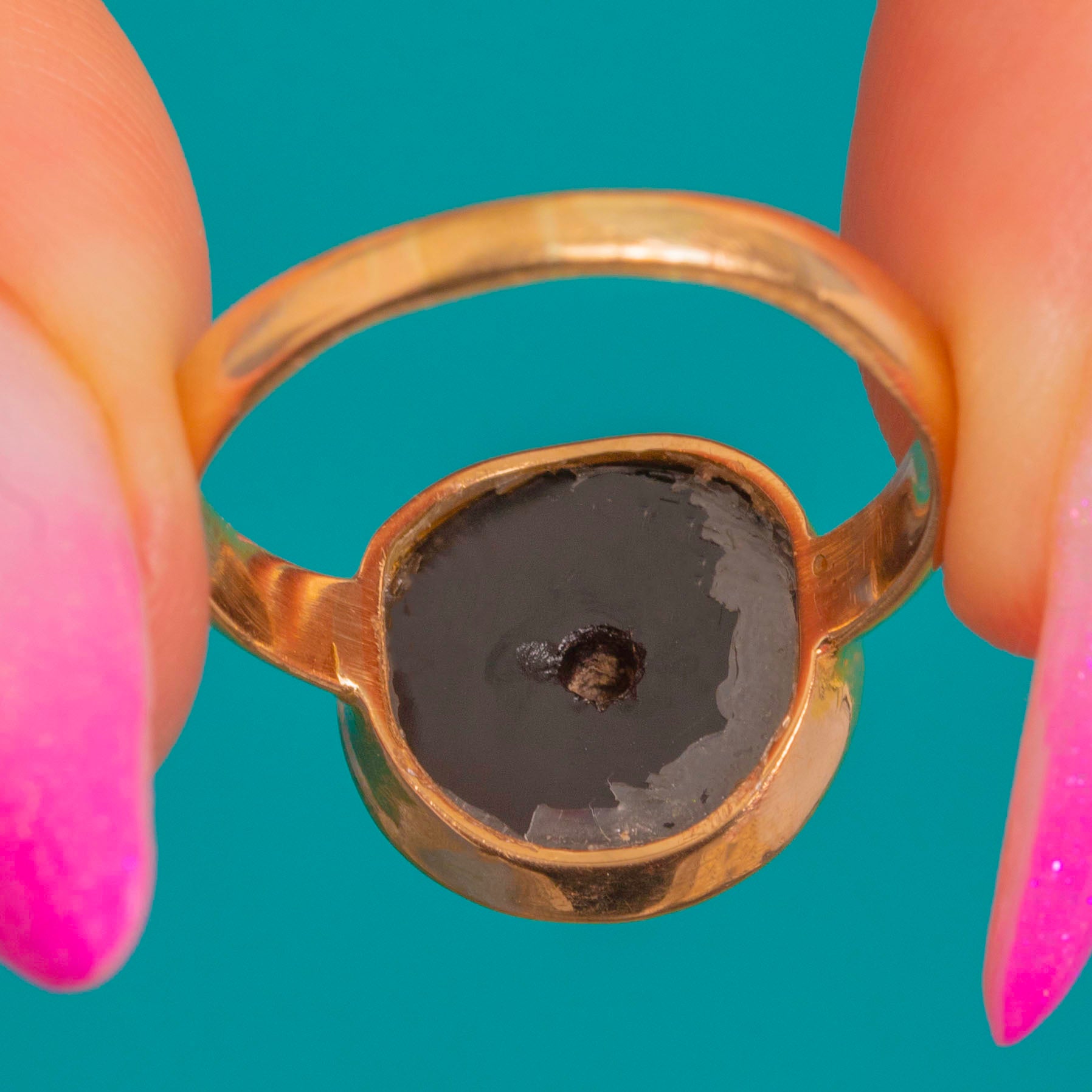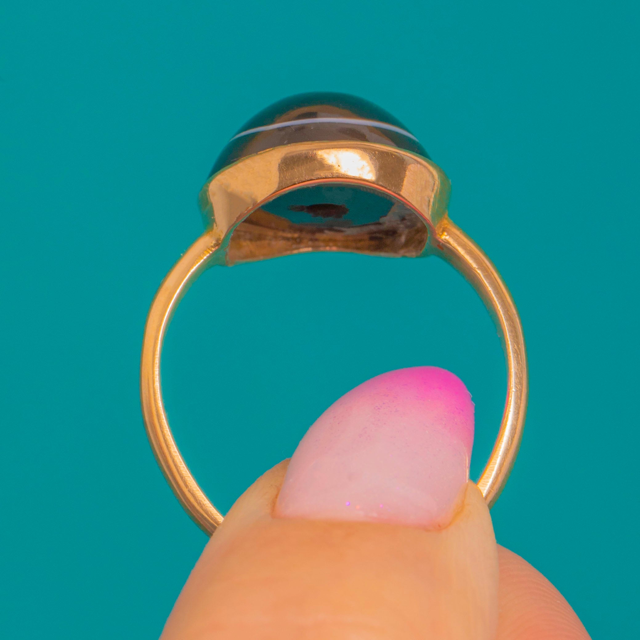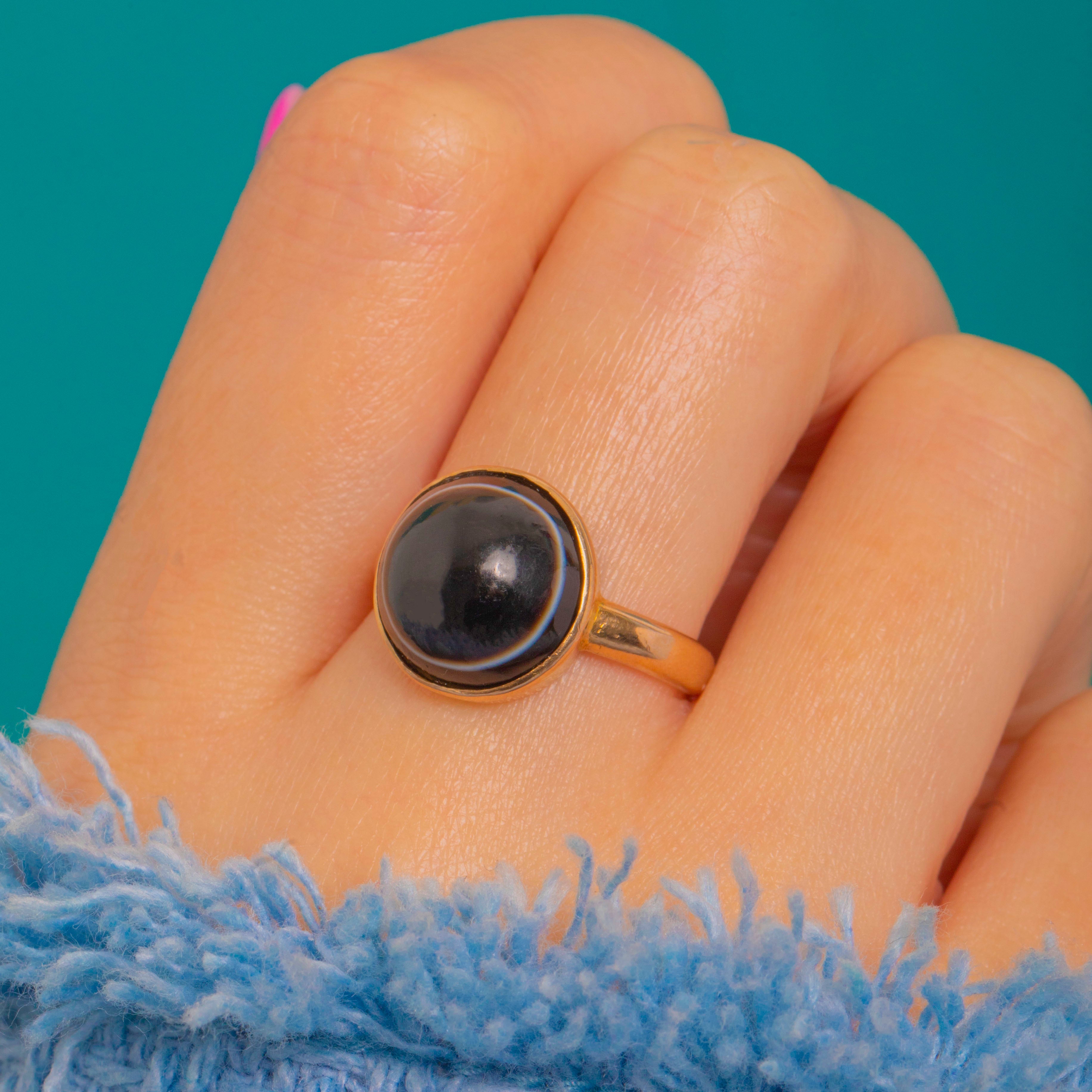 Bold, graphic and beautifully understated, this Victorian ring showcases a glossy round Banded Agate cabochon in a smooth 18ct Gold bezel. The sculptural profile lets the inky black stone with its subtle pale rim take centre stage, offering that refined contrast Victorian jewellery is loved for.