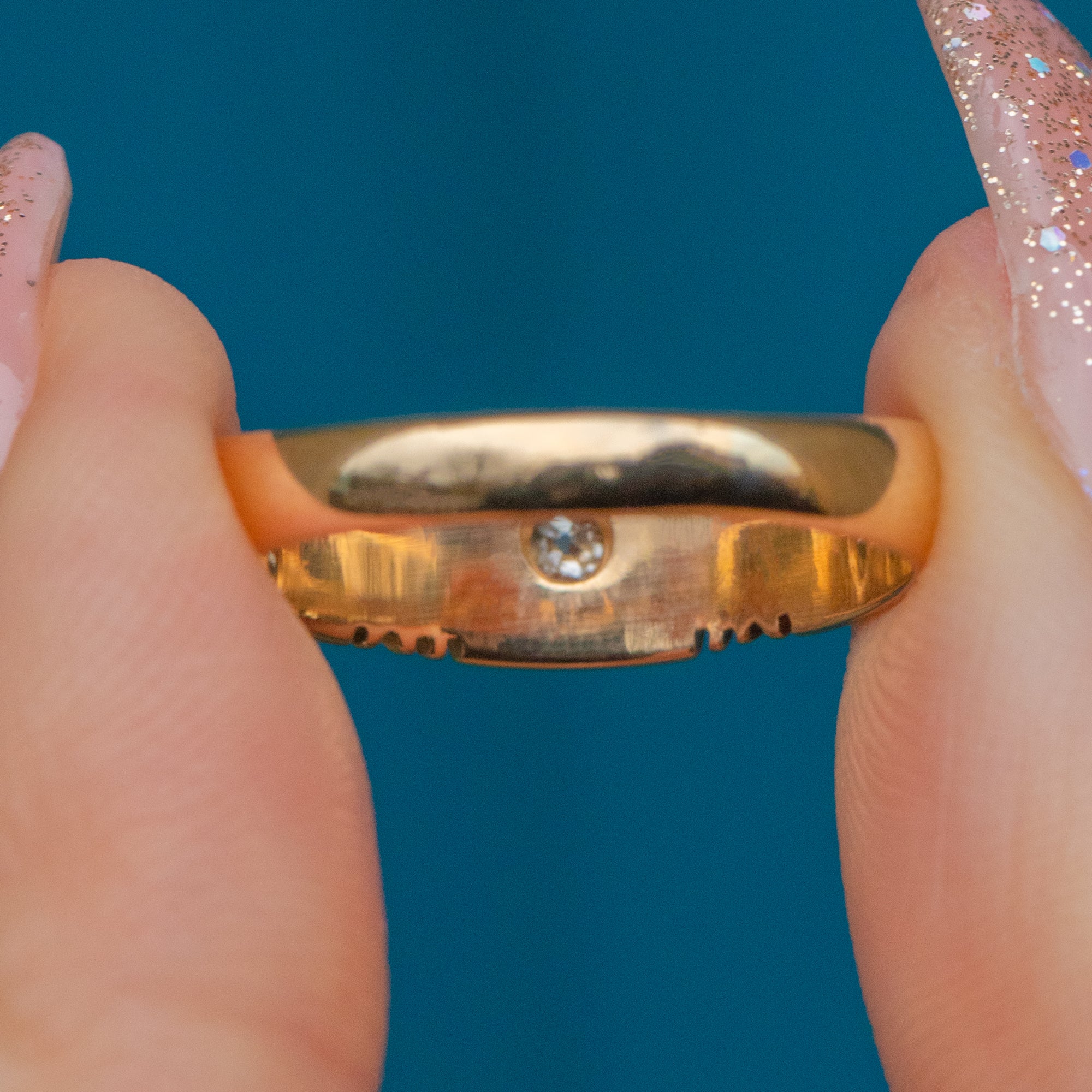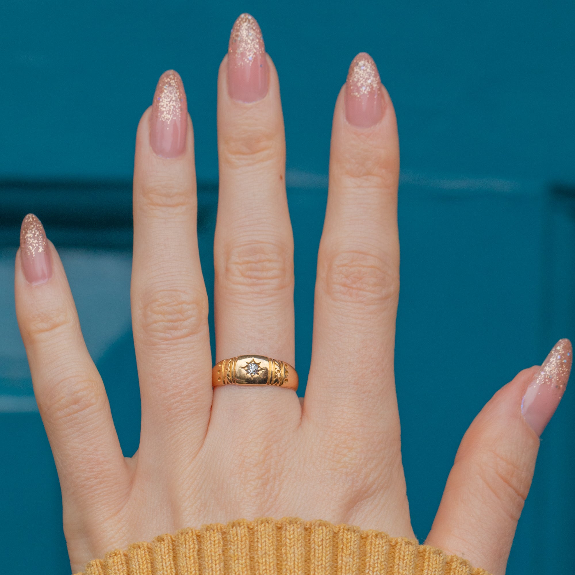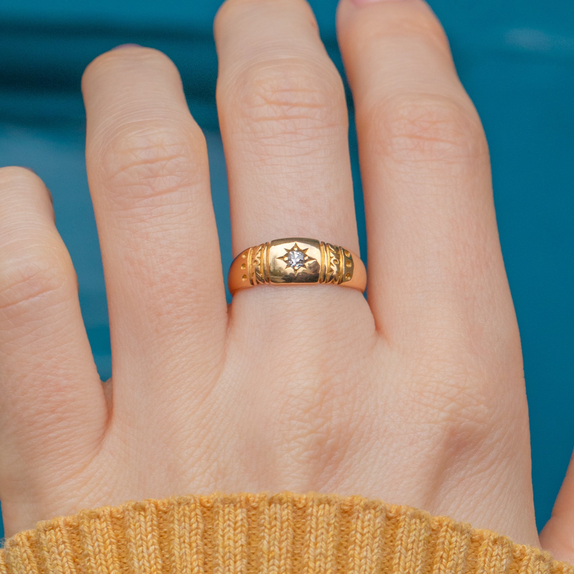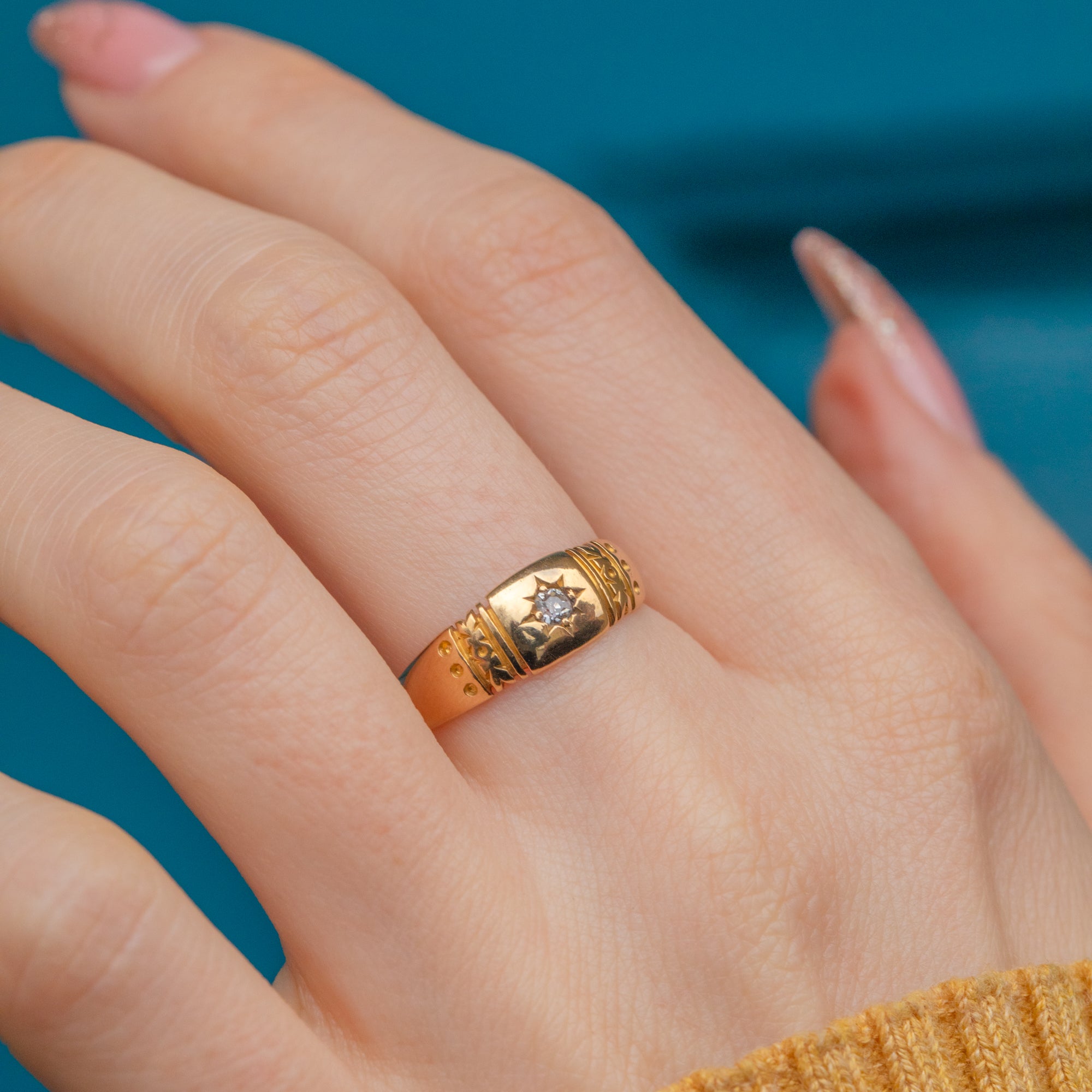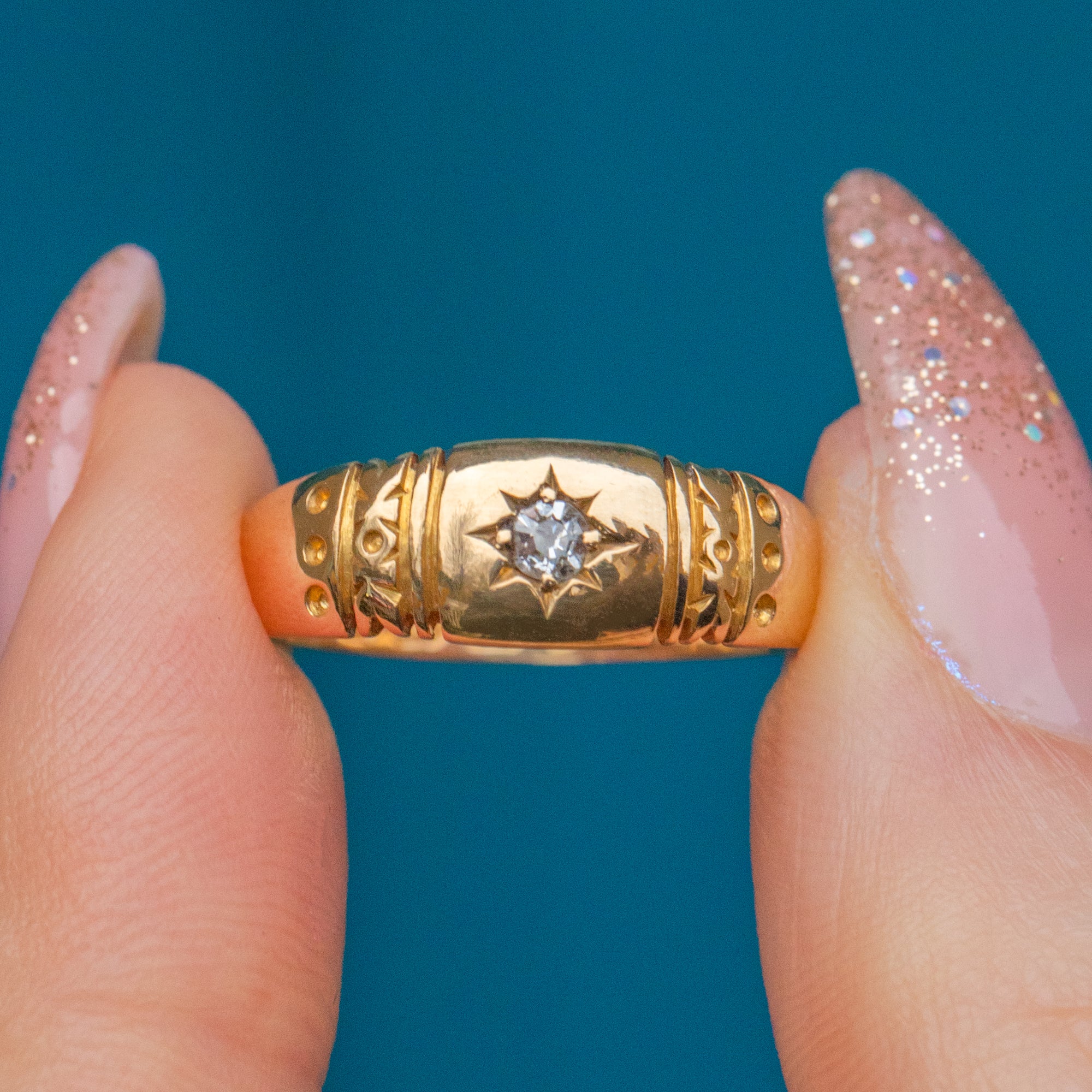 A stellar Victorian 18ct Gold Diamond Gypsy Ring! This is a wonderful antique piece, hallmarked to the year 1892 and inlaid with a stunningly bright Diamond.