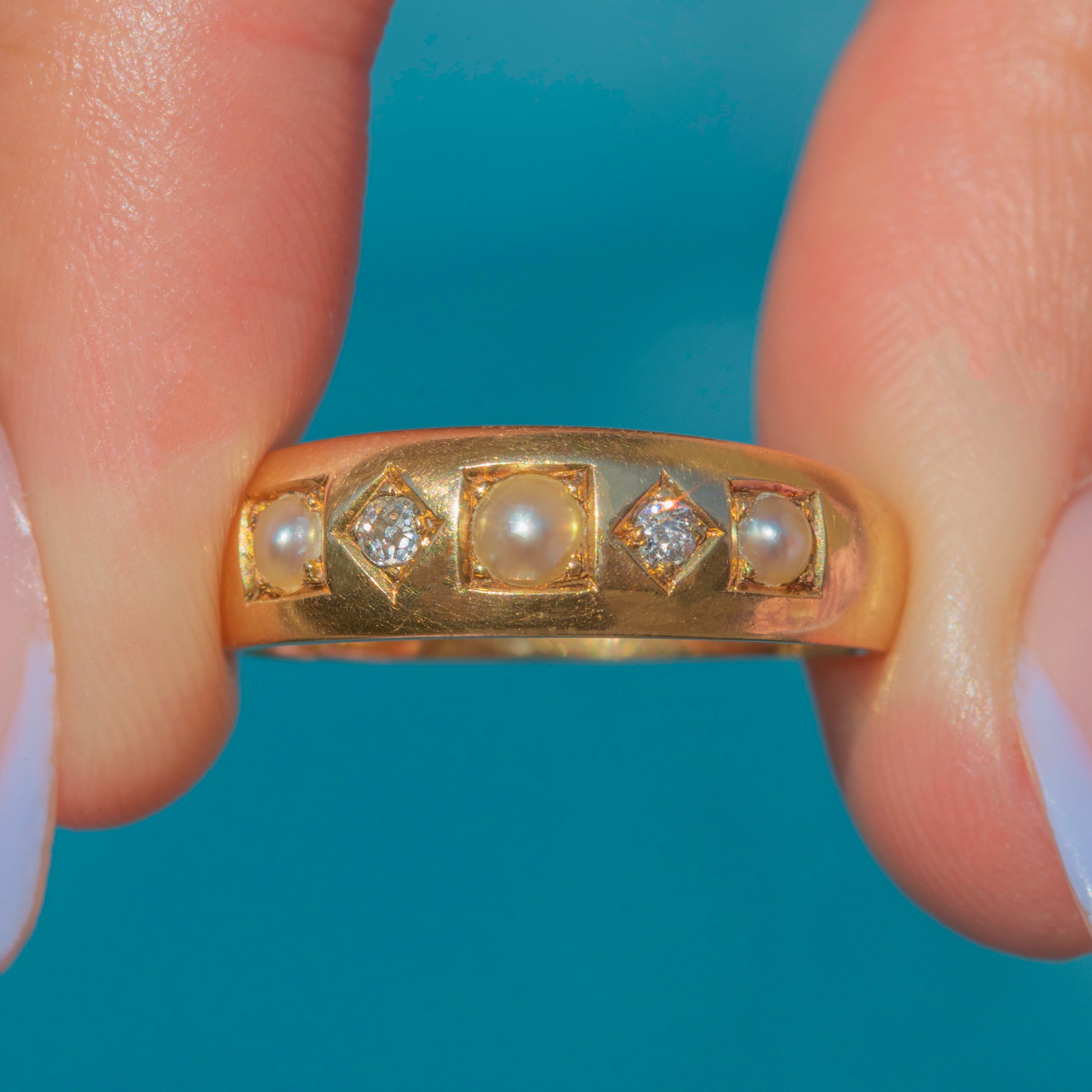 EXCELLENT: This Victorian 18ct Gold Diamond Pearl five stone gypsy ring is in excellent condition. The Gold is bright and buttery, and each of her gemstones are securely set. With little else to note, she is in brilliant condition.