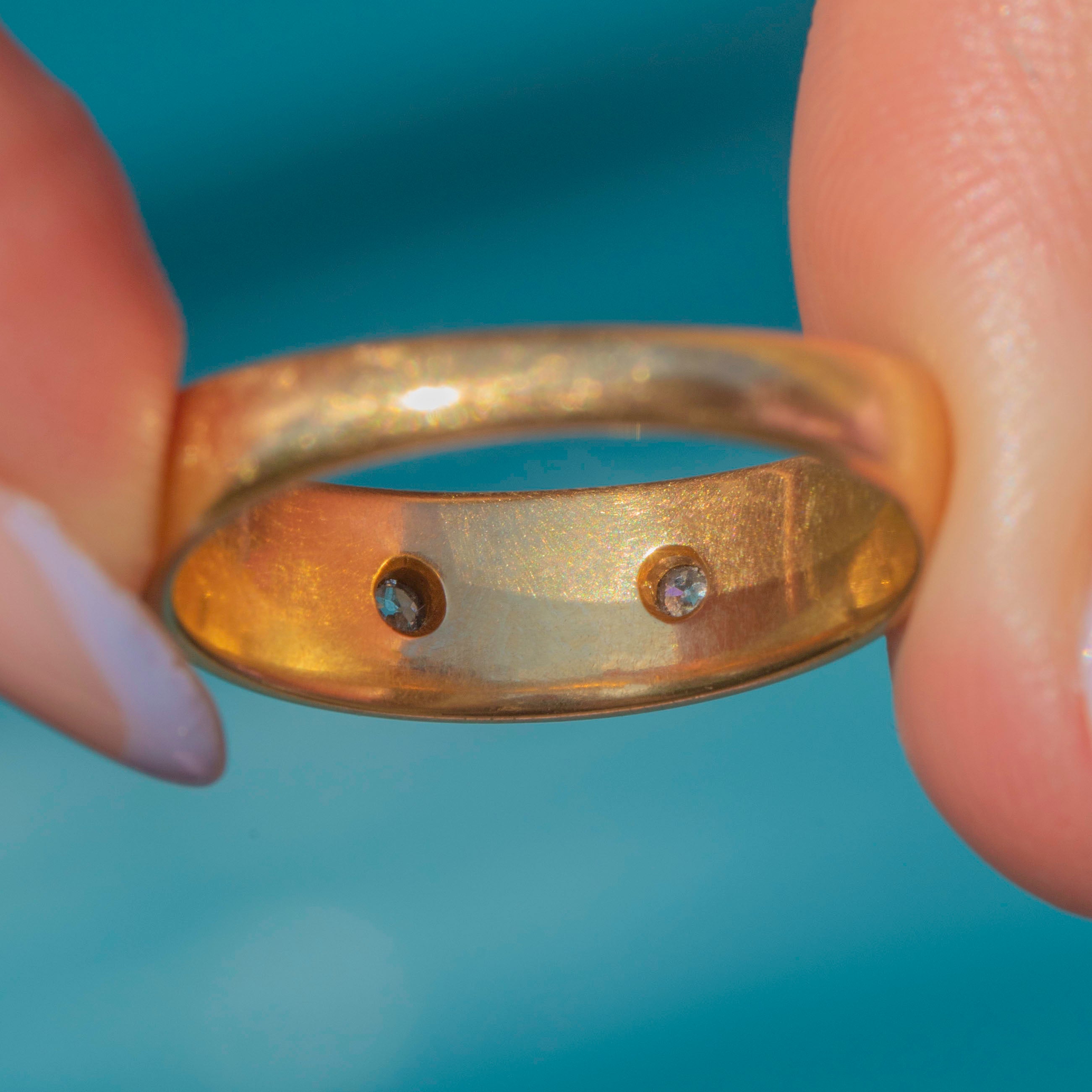 This Victorian 18ct Gold Diamond Pearl five stone gypsy ring is an antique delight! Crafted from resplendent buttery 18ct Gold, this Victorian ring is inlaid with two sparkling Diamonds accompanied by three iridescent Pearls.