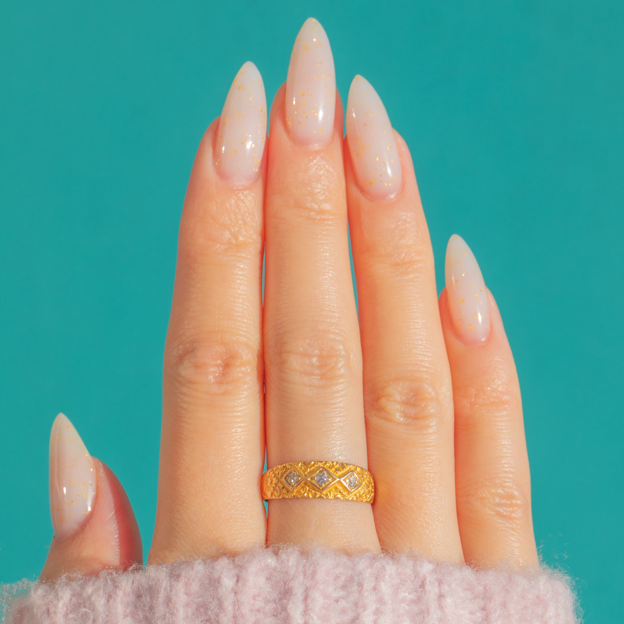 A richly engraved Victorian 18ct Gold band set with three lively Diamonds, this ring marries ornate detail with everyday ease. The surface is beautifully chased with foliate and scroll motifs, while the Diamonds are gypsy-set within geometric lozenge panels edged with delicate milgrain for a refined, antique finish. The low-profile silhouette sits smoothly on the finger—romantic, practical, and effortlessly wearable.