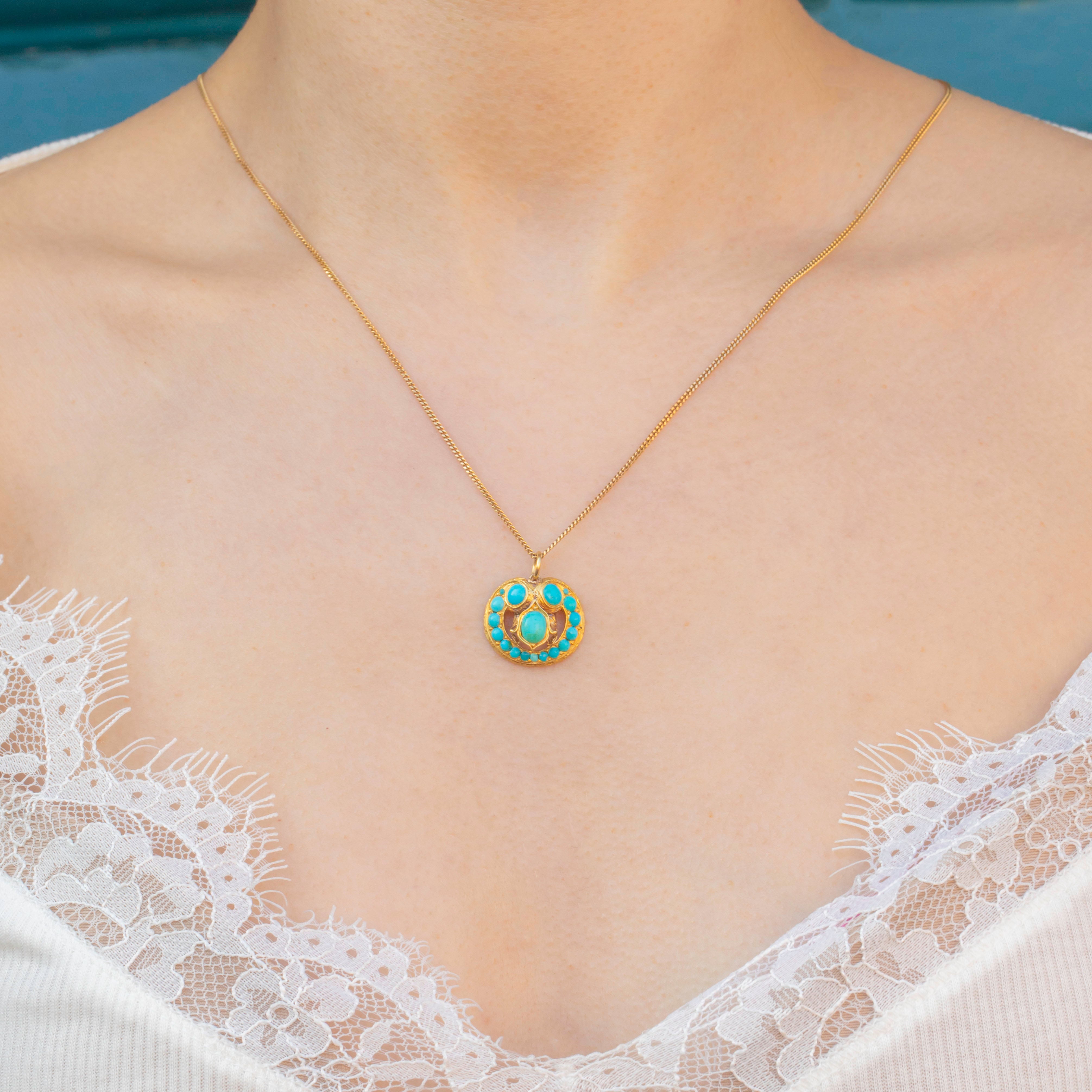 VERY GOOD-EXCELLENT: This Victorian 18ct Gold engraved Turquoise cluster pendant is in wonderful condition. The Gold is brightly saturated and the details have all remained defined. Under close inspection, there is some mild wear to some of the settings, including the central Turquoise where the setting has come away slightly from the stone. However, this does not detract from the beauty of the piece and the Turquoise gems all remain securely set. The jump ring has been soldered shut, so you can wear this Victorian Turquoise pendant with the utmost confidence!