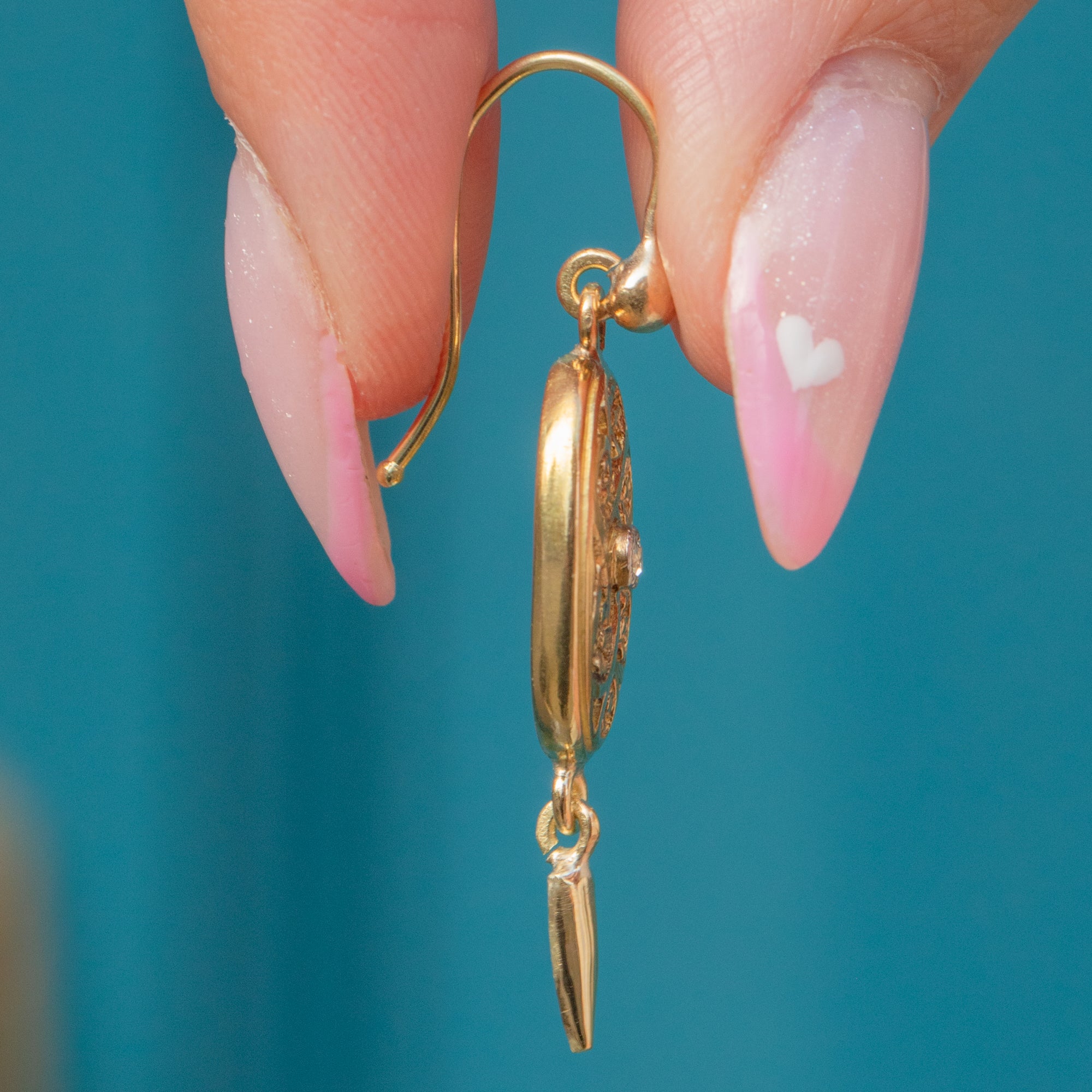 These stunning Victorian 18ct Gold drop earrings feature intricate filigree goldwork and twinkling old-cut Diamonds. Beautifully handcrafted, the open scrollwork design adds lightness and movement, while the Diamonds sparkle delicately with every turn.