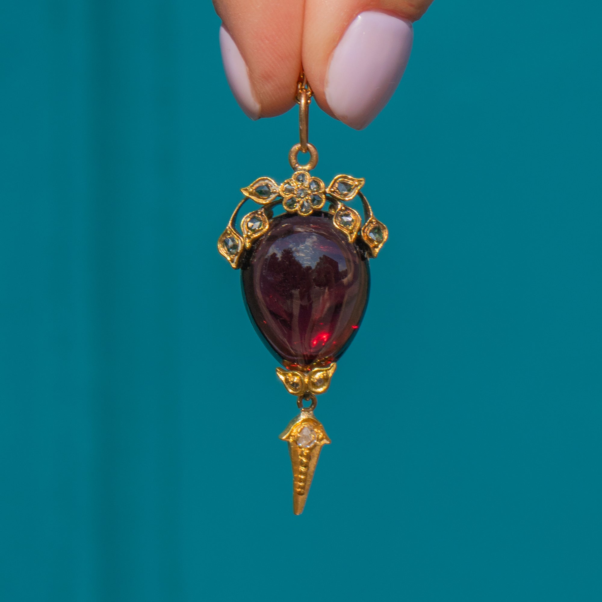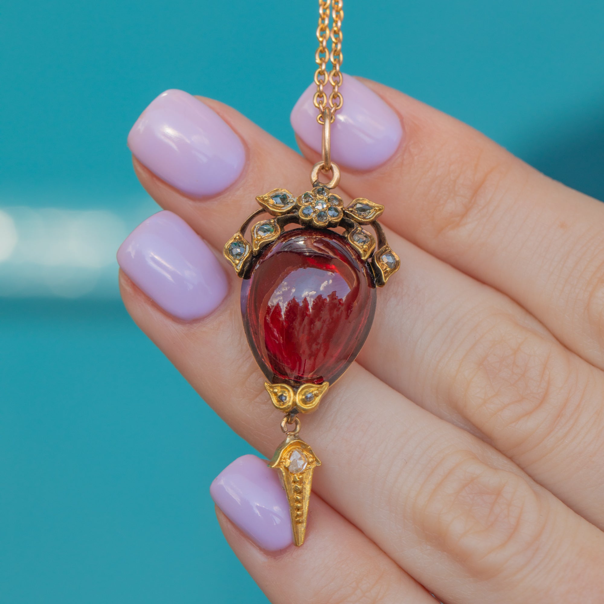 This Victorian 18ct Garnet cabochon Diamond pendant is an absolute feast for the eyes! Crafted from 18ct Gold, this antique pendant is home to a 17.00ct cabochon cut Garnet, embellished with a peppery Floral Diamond crown.