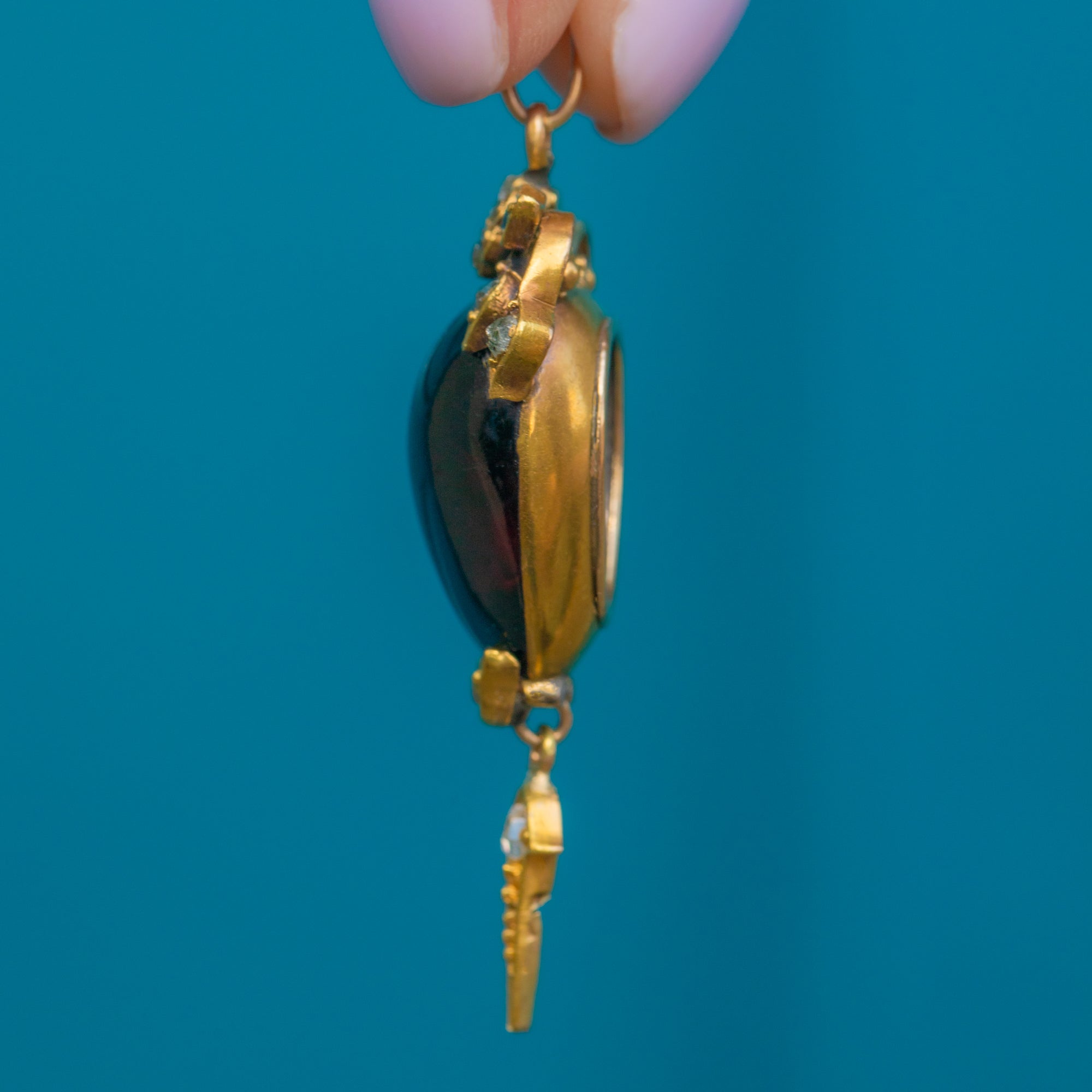 MATERIALS: Tests as 18ct Gold, Garnet (17.00ct), Rose-Cut Diamonds.