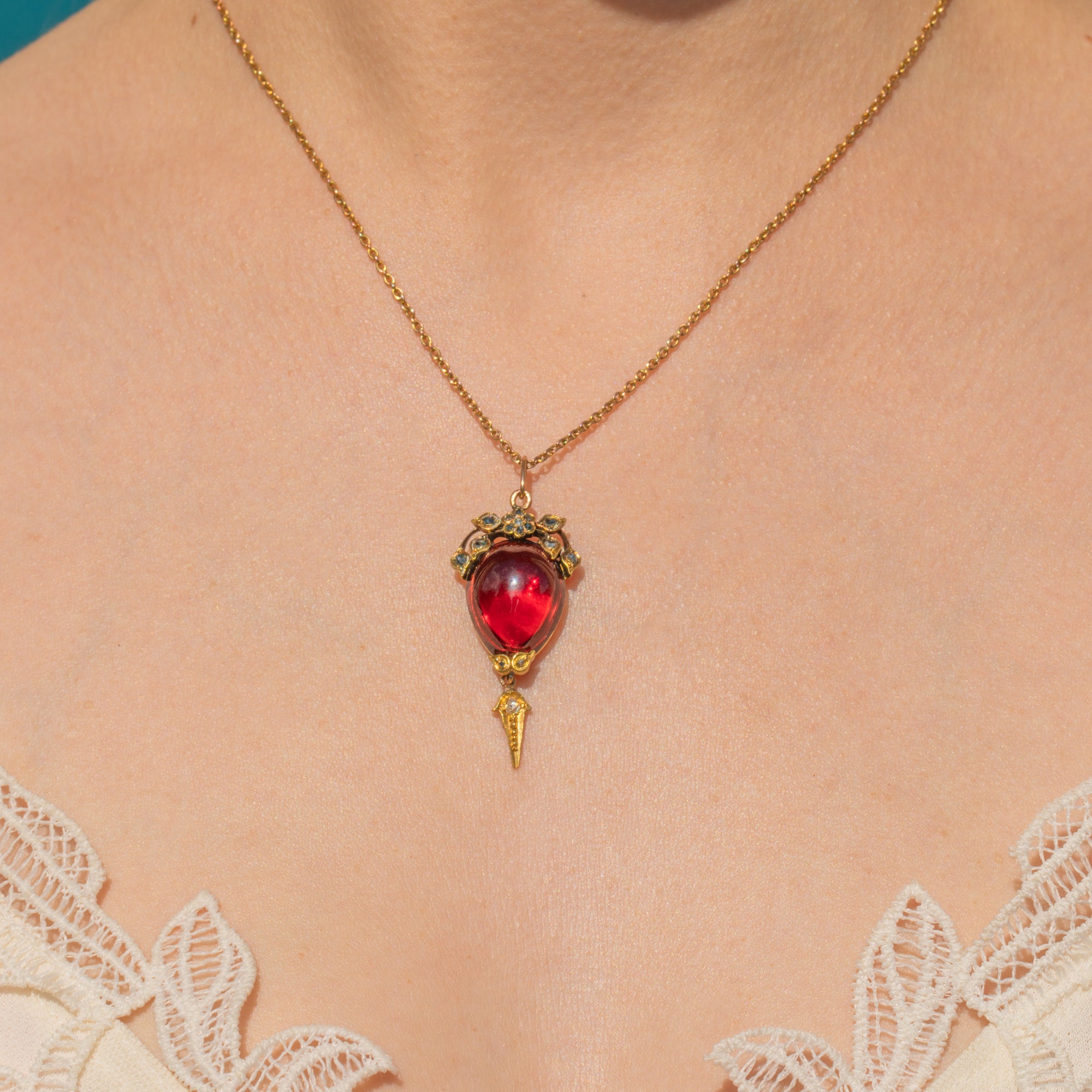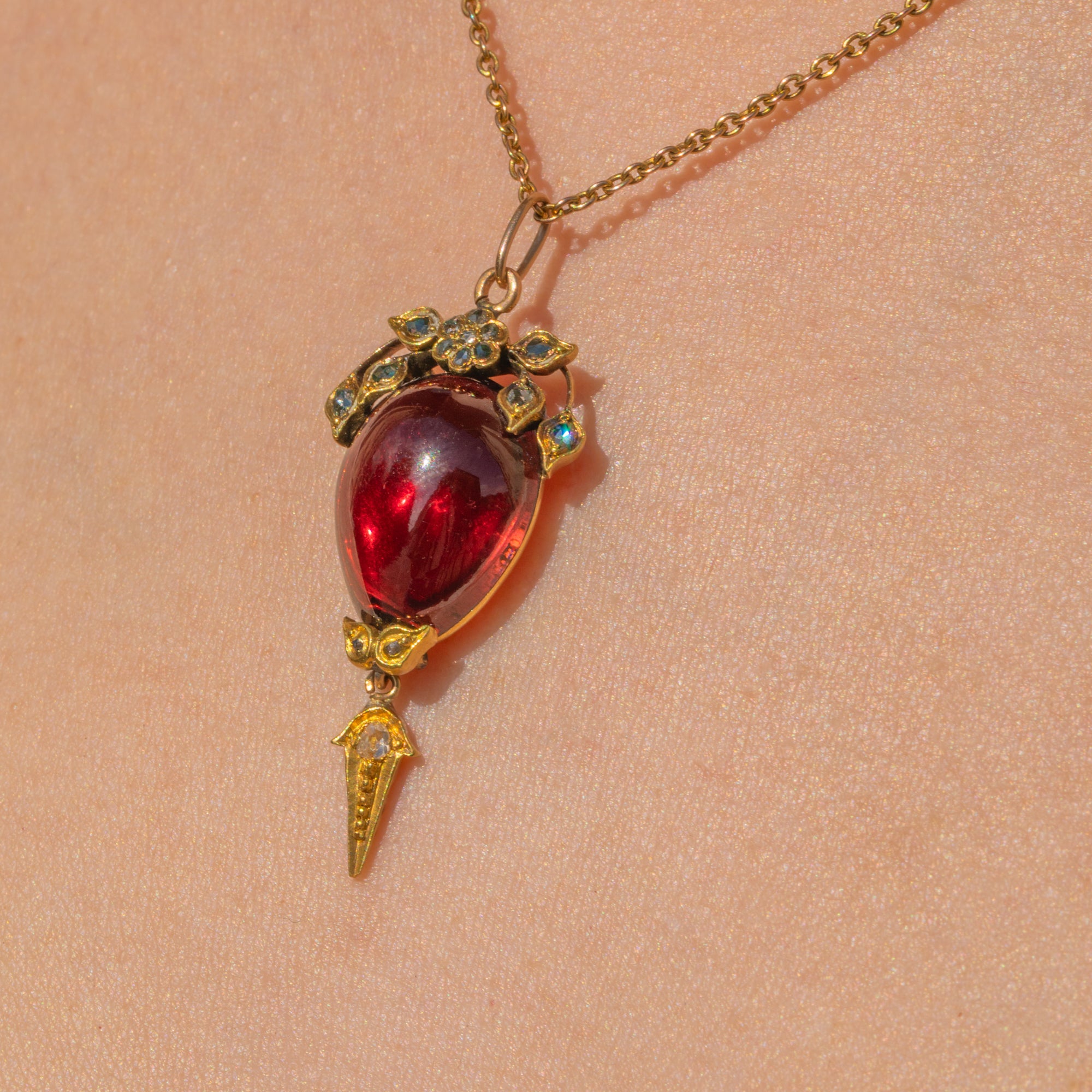 The Garnet is infused with cherry red overtones, making this treasure irresistible! Embodying a feminine and floral silhouette, this pendant will sit beautifully against your décolletage.