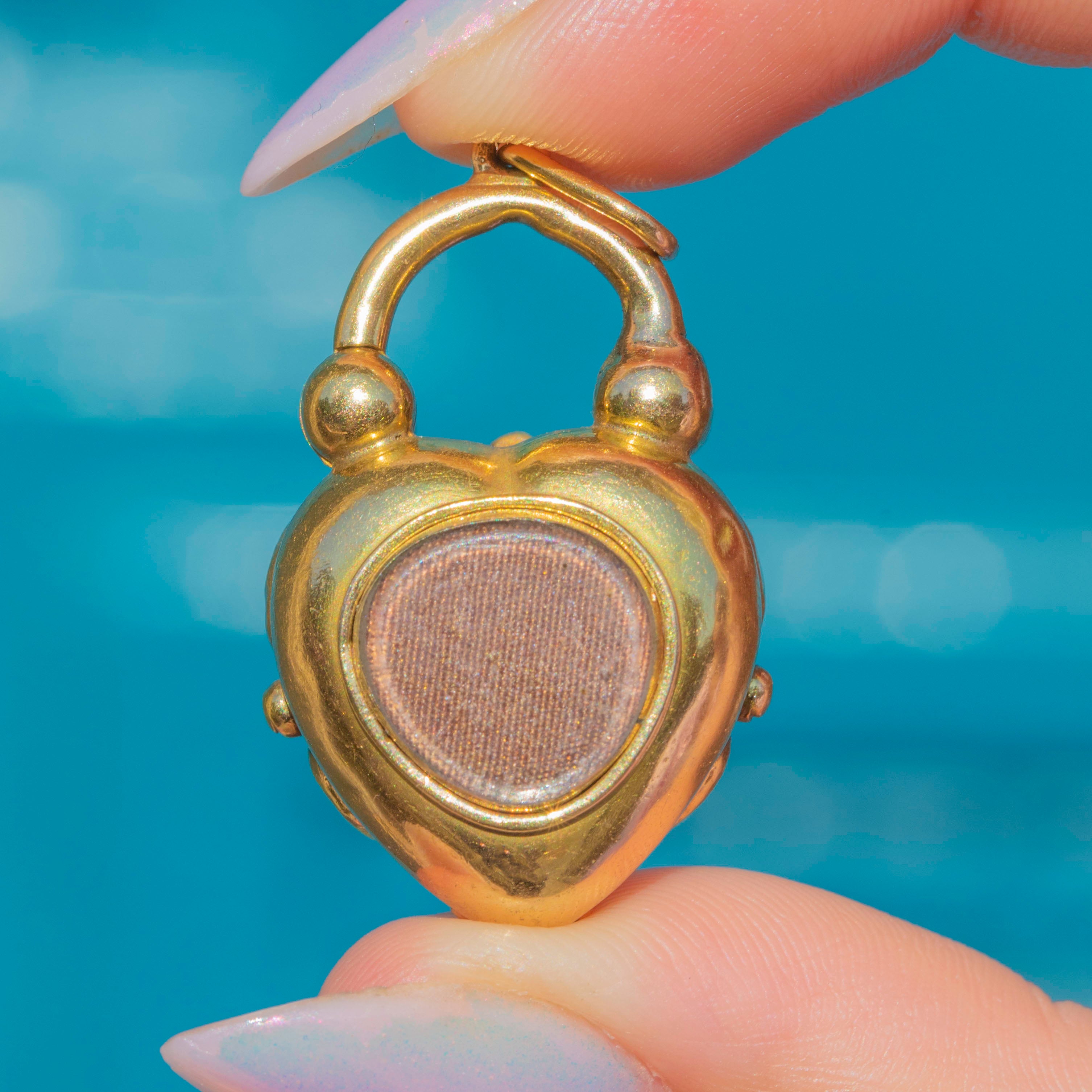 On the reverse, a glazed panel reveals a section of intricately woven hair, commemorating a love that once was. This large heart padlock pendant is complete with two sage Chrysoberyl gemstones for a gorgeous finishing twinkle.