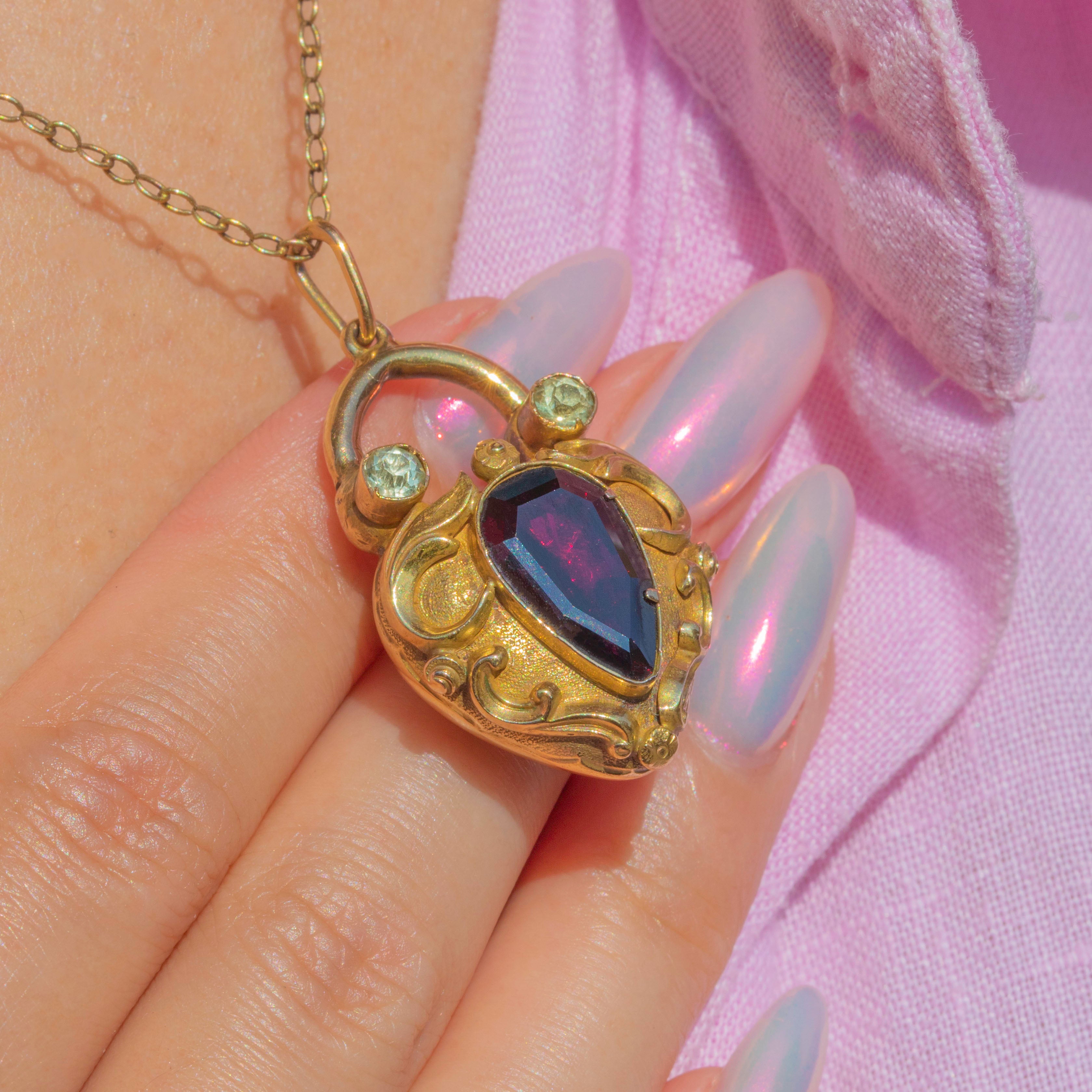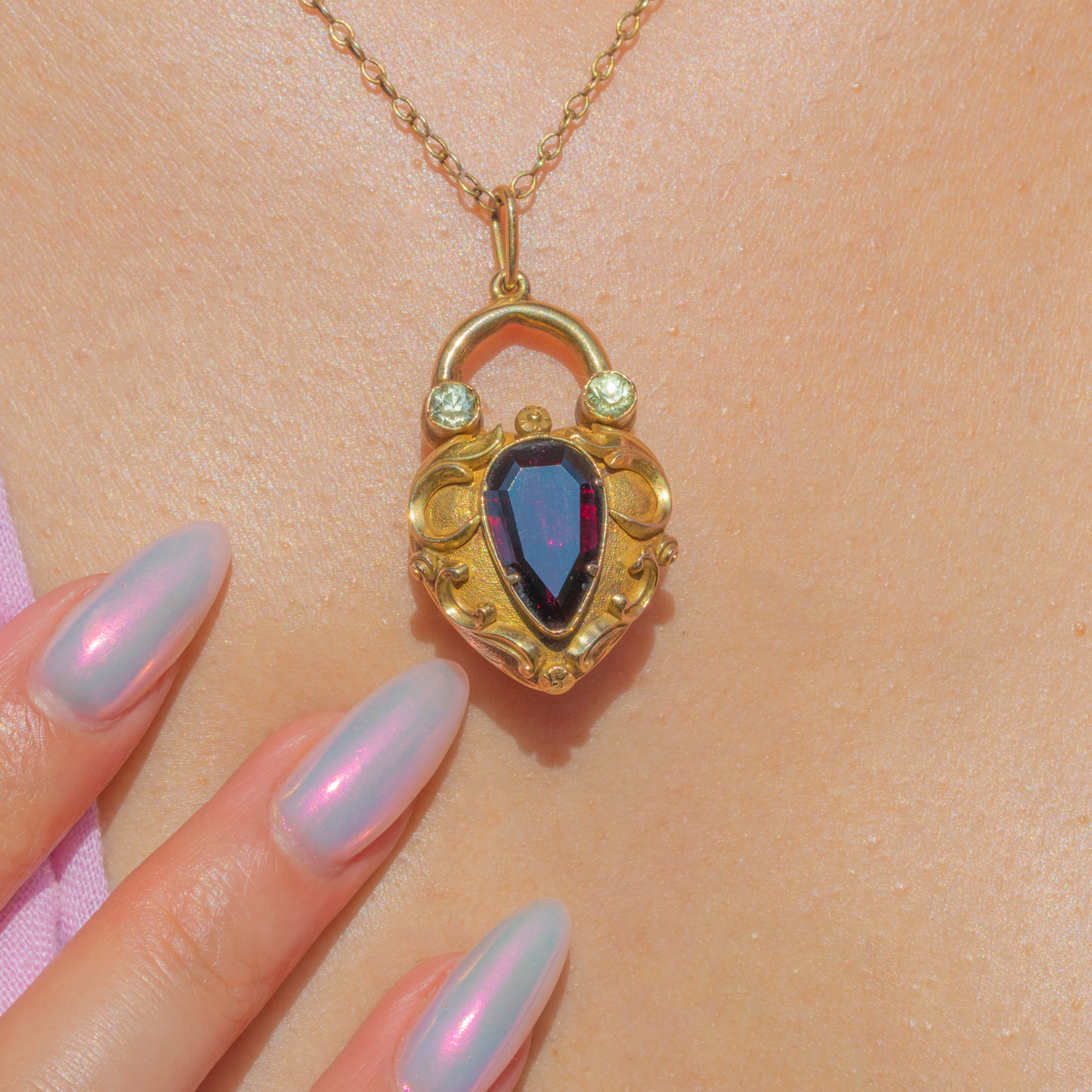 Victorian 18ct Gold Garnet Chrysoberyl Heart Padlock Pendant, Locket Back