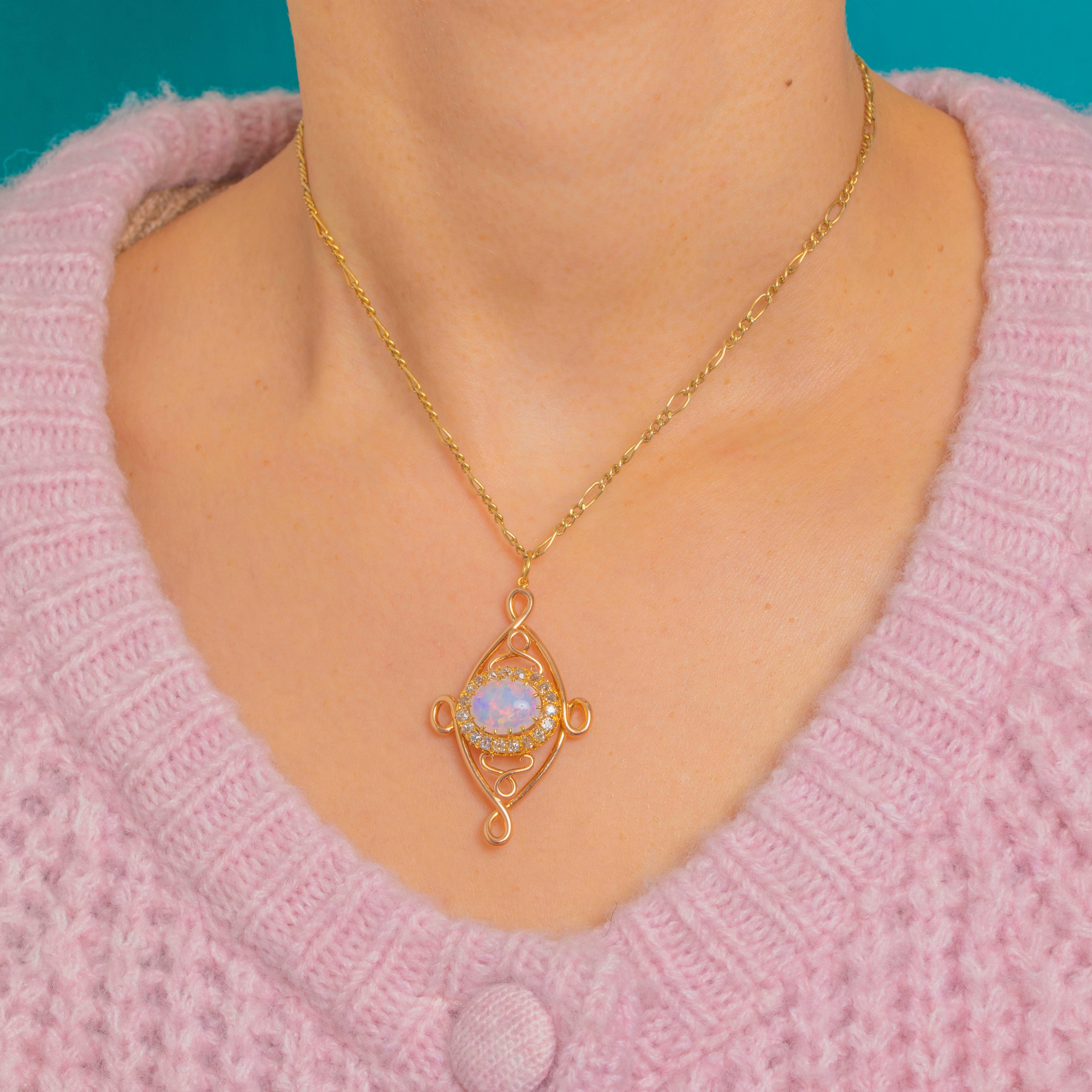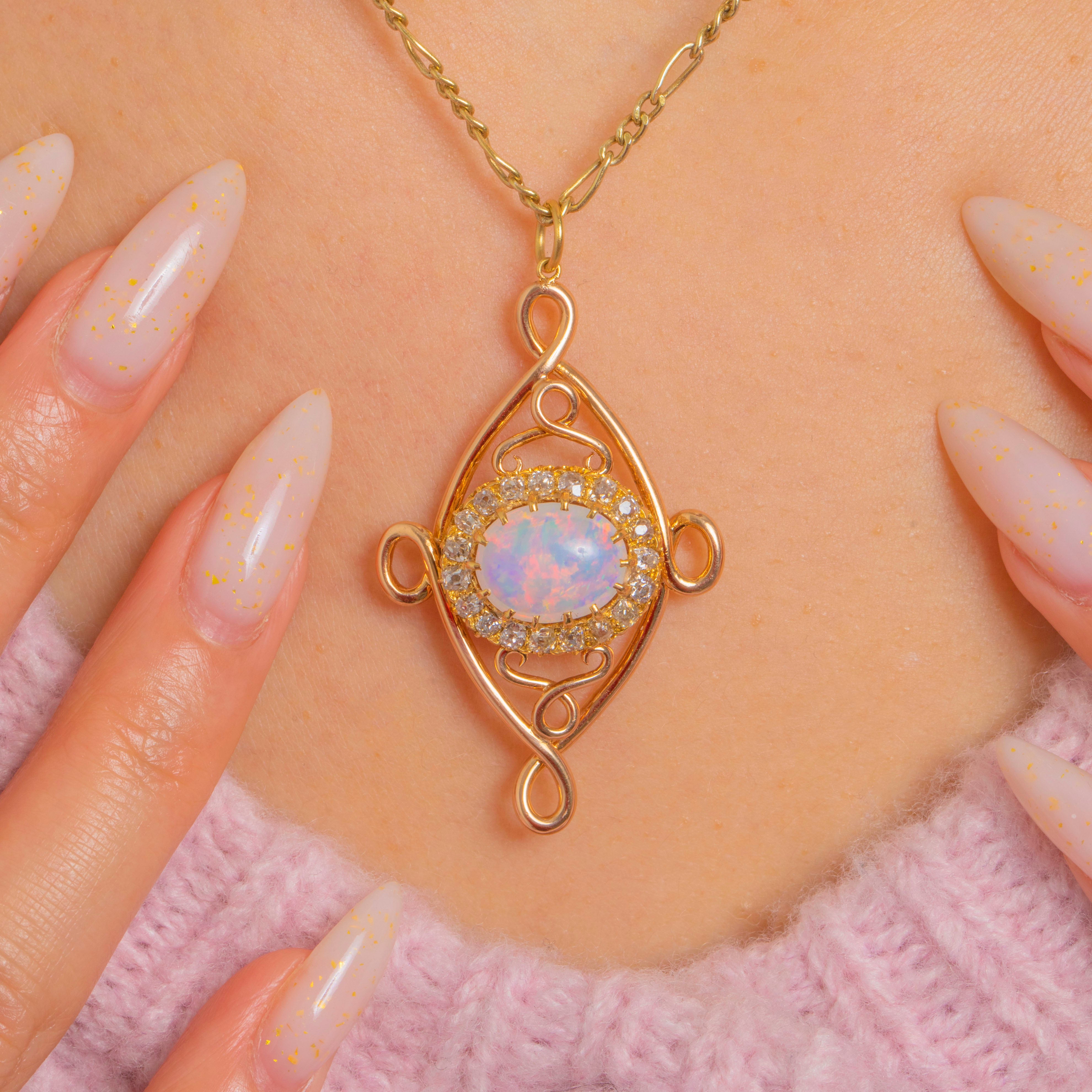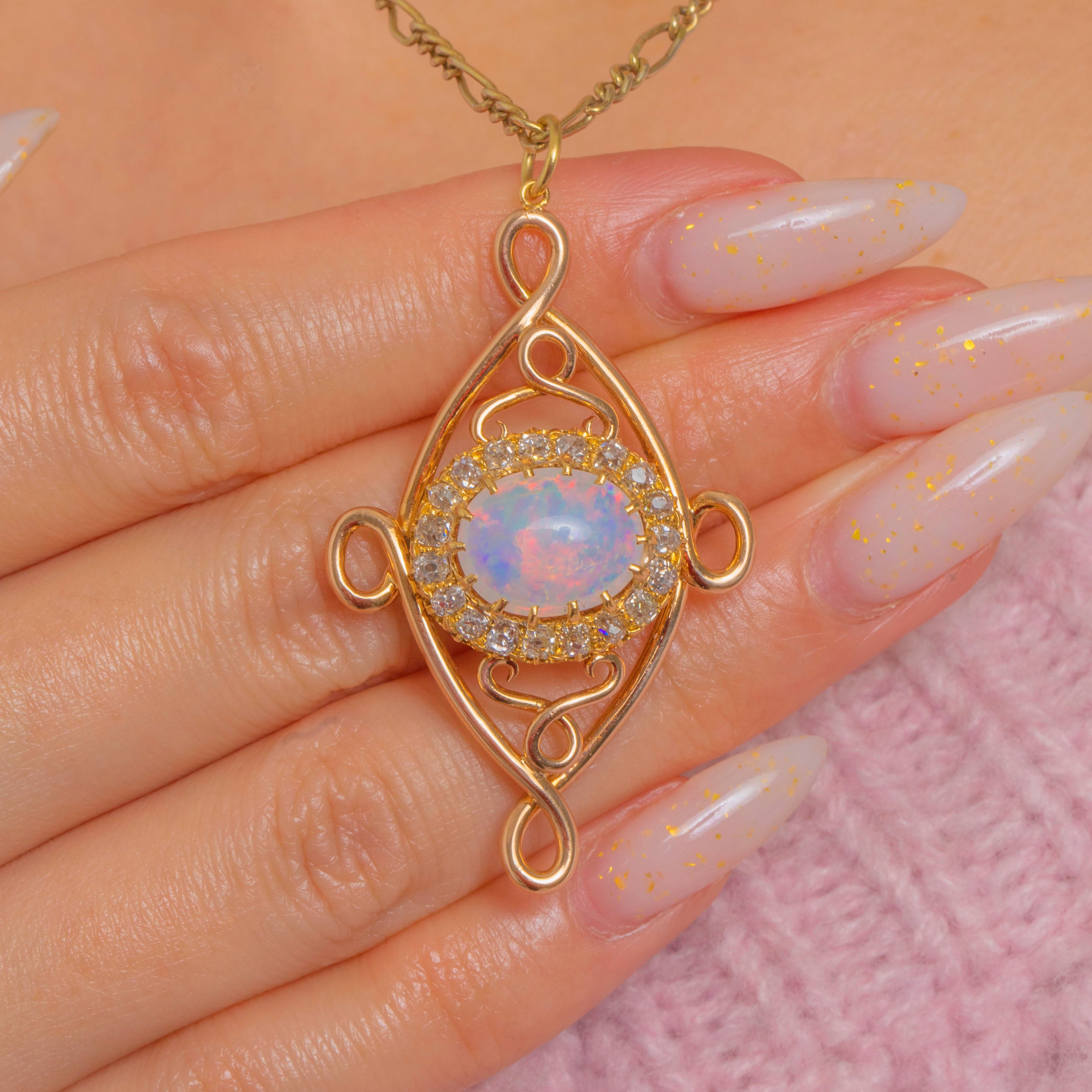 A luminous Victorian opal takes centre stage in this exquisitely crafted 18ct Gold pendant, its domed cabochon alive with pink, blue, green and orange flashes. A halo of bright 2mm Diamonds encircles the opal, amplifying its ethereal play-of-colour and lending a refined sparkle with every movement.