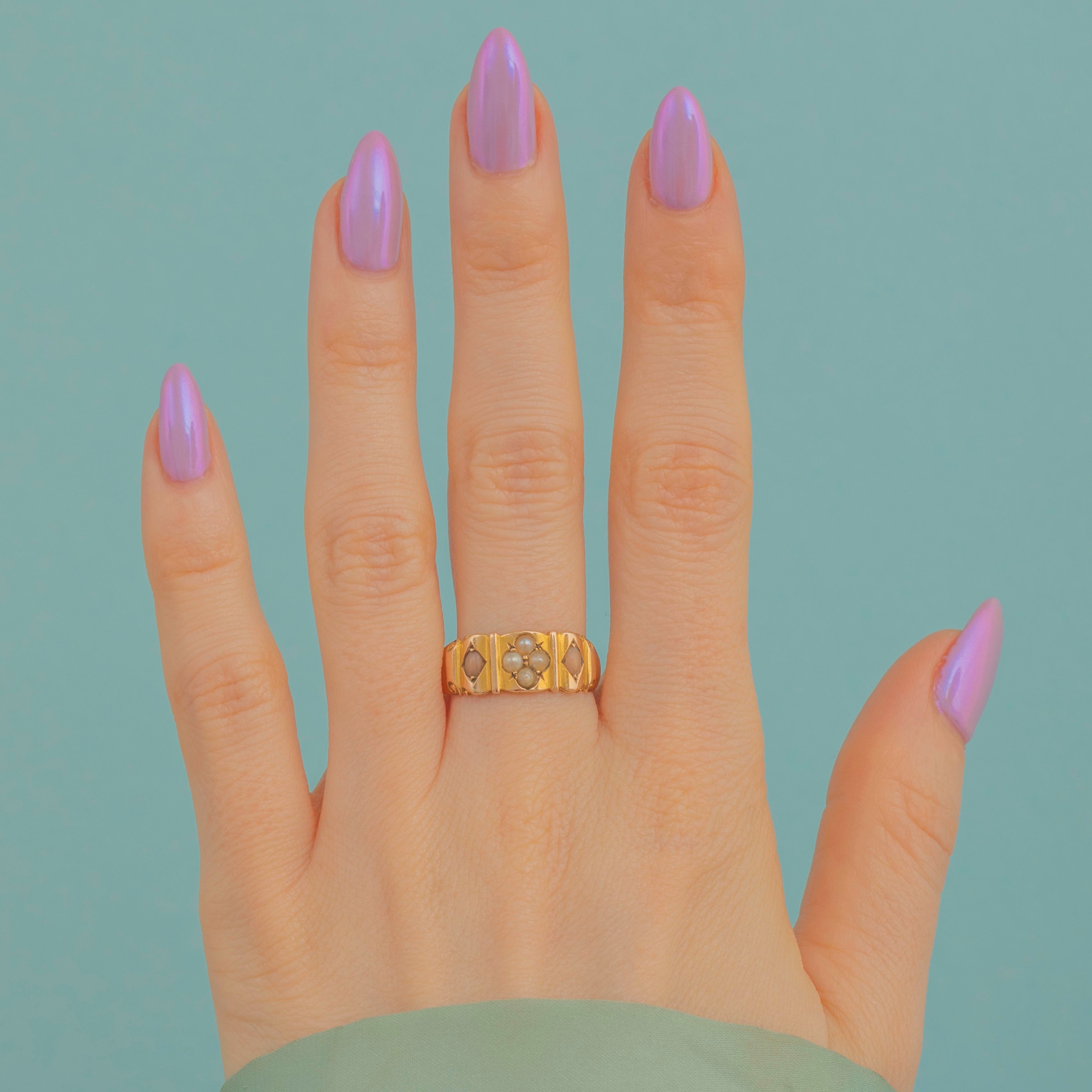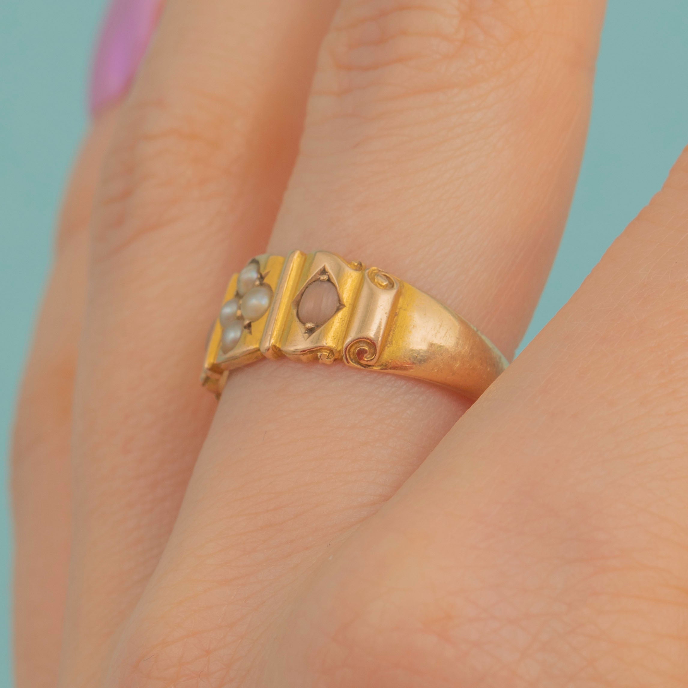 Your outfit won't feel complete without this Victorian 18ct Gold Pearl Coral gypsy ring! With a sweet combination of apricot-hued Corals and shimmering Pearls, this ring will take you through spring and summer with ease.