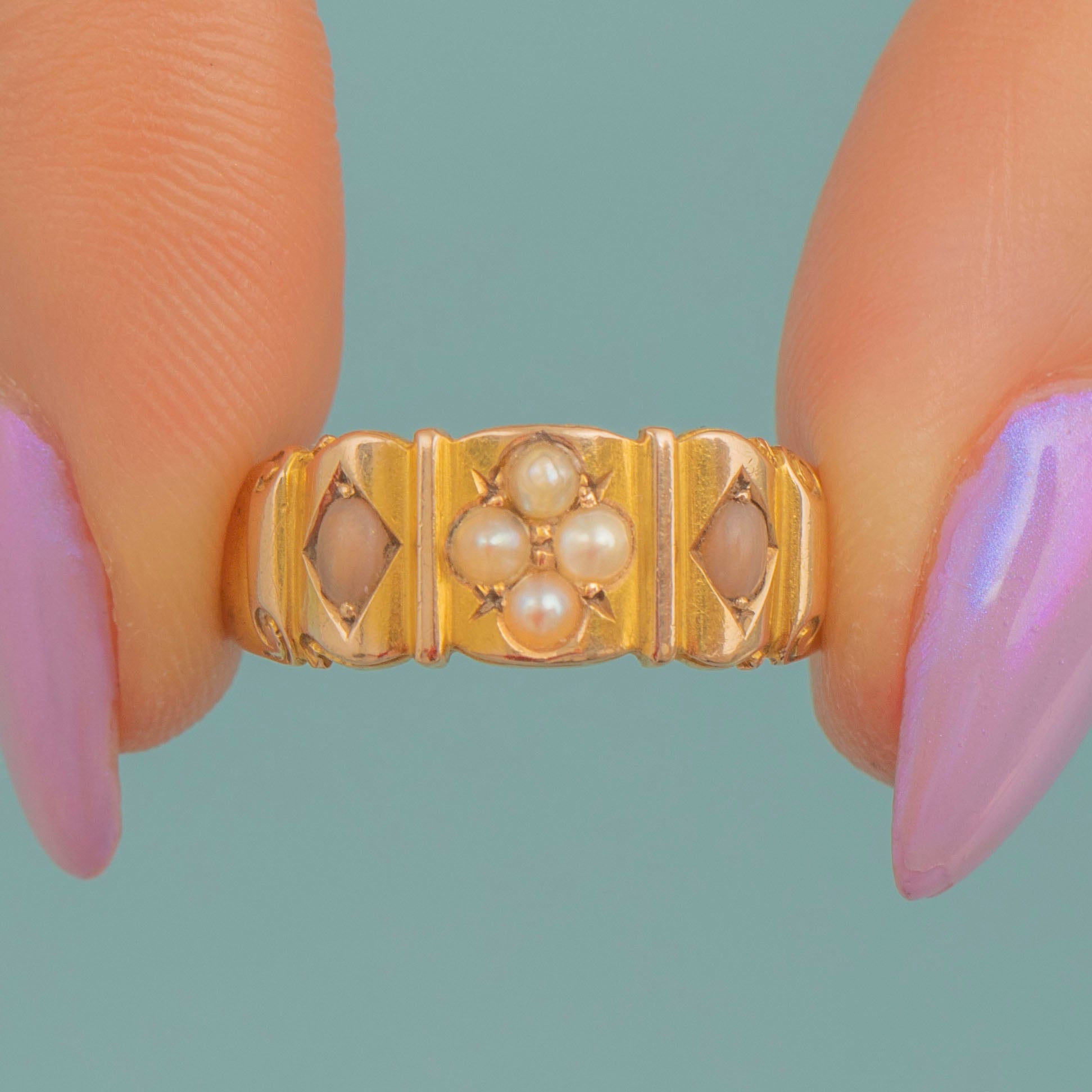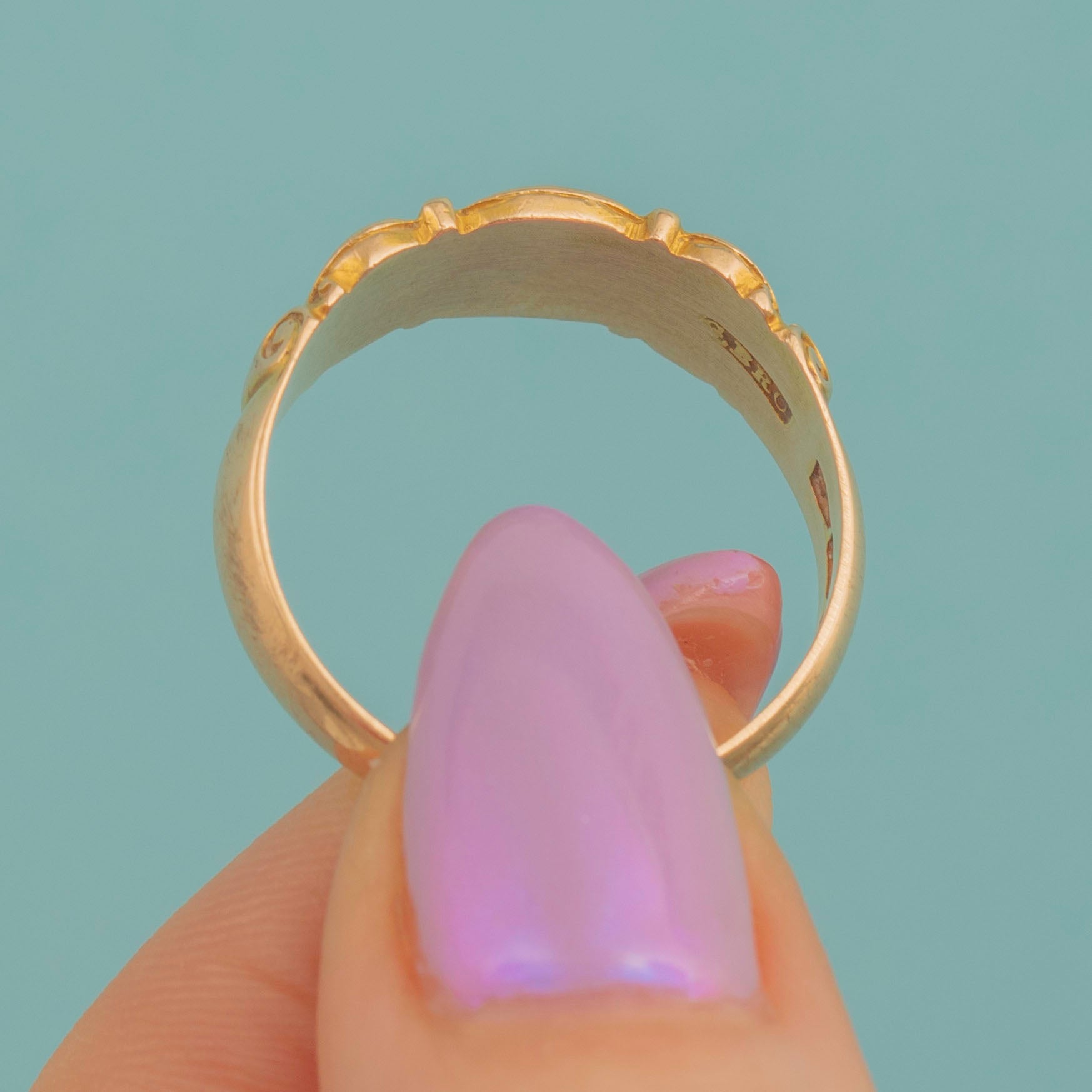 VERY GOOD. This Victorian 18ct Gold Pearl Coral gypsy ring is in superb condition. We love how easy-to-wear this ring is -it's comfortable, chic and endlessly pleasing to the eye. All of the gemstones are securely set and are original to the band. There is some subtle wear but this is only noticeable under close inspection. With a full set of hallmarks authenticating its Victorian origin, this antique Gold gypsy ring will become a coveted piece in your collection!