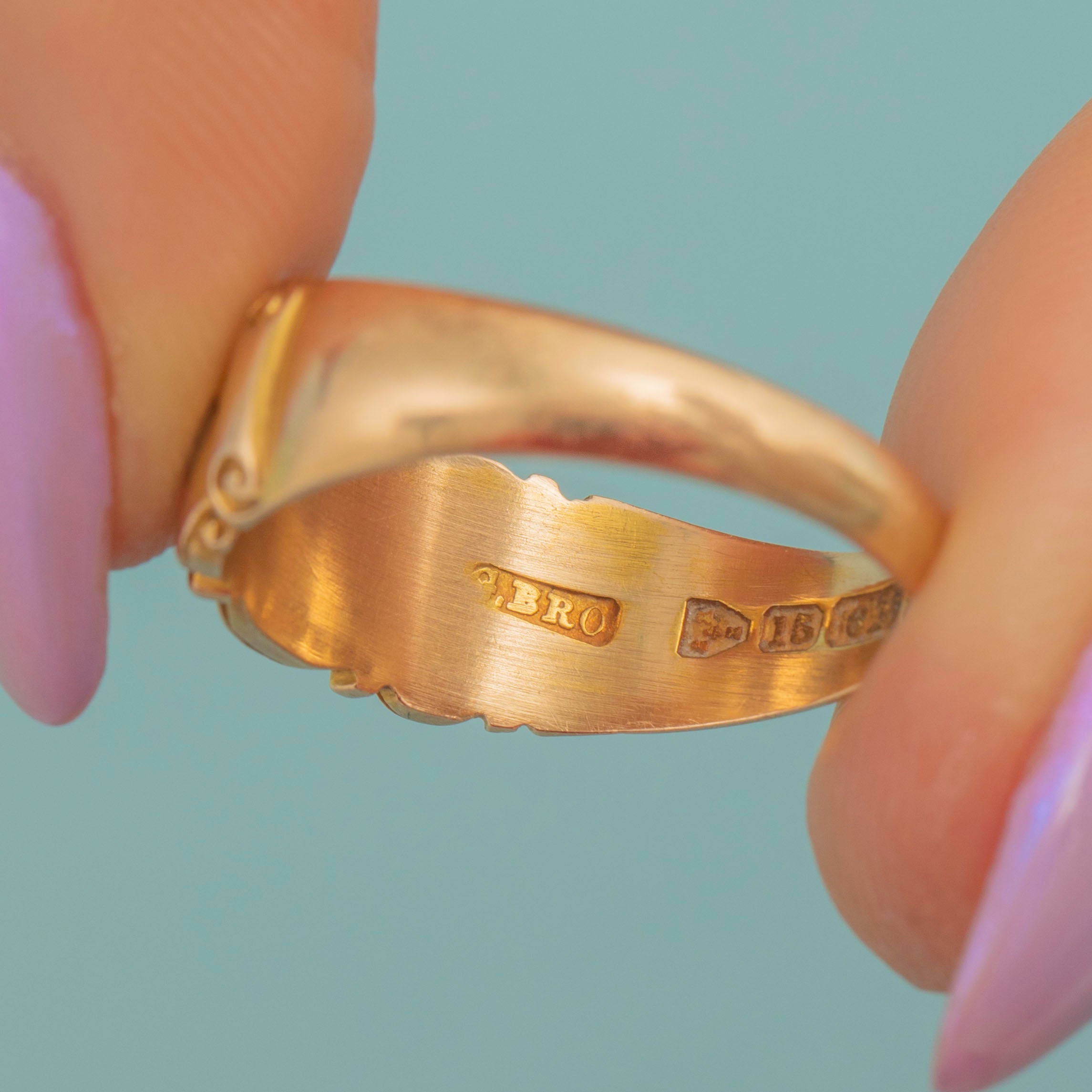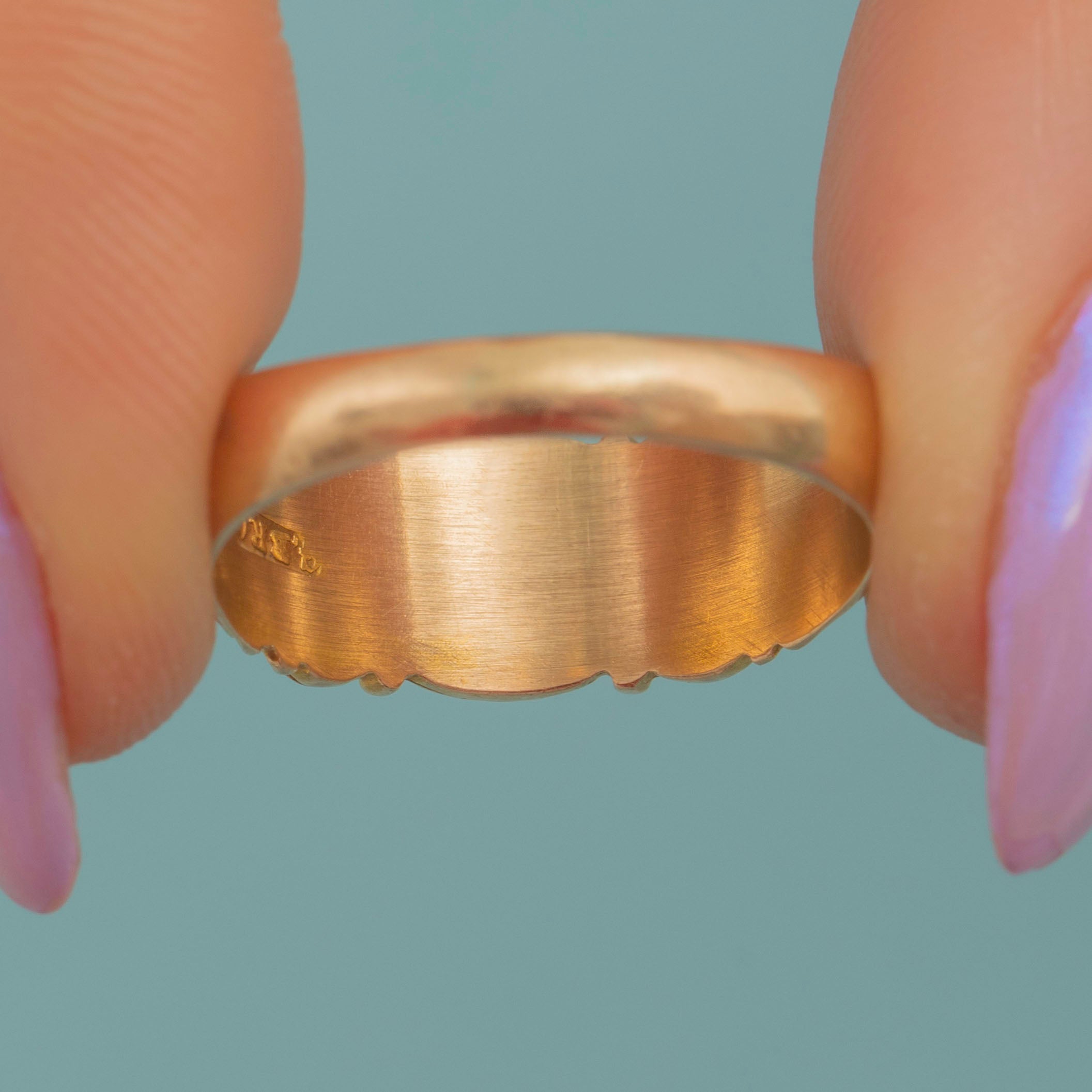 This antique gypsy ring boats a full set of hallmarks dating to 1883, including the rare Chester Assay, making it a highly collectible piece. The sleek design has a low profile and sits comfortably on the finger, adding a flash of peachy prettiness to your day!