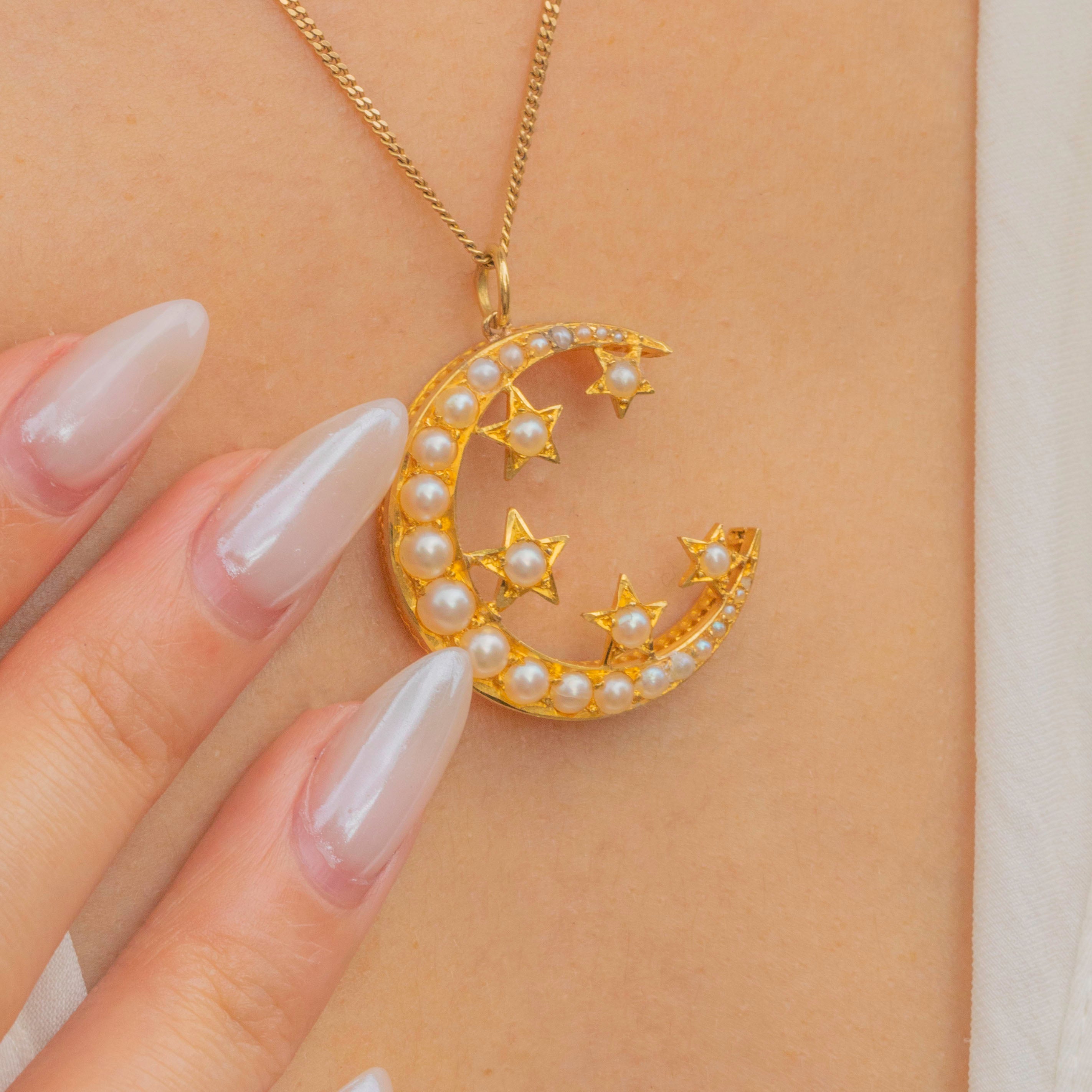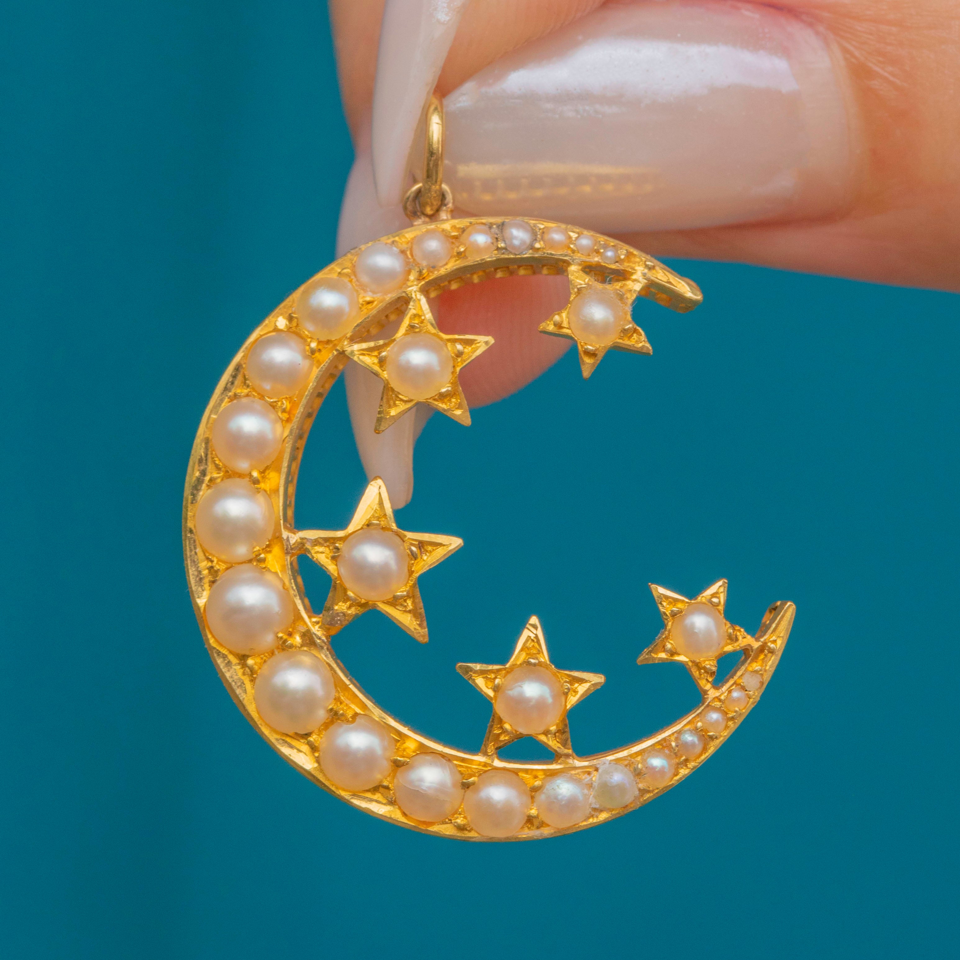 Calling all celestial jewellery lovers, this Victorian 18ct Gold Pearl crescent moon and stars pendant was made for you! Her curvaceous form is inlaid with shimmering plump Pearls which perfectly arch to her crescent shape, studded with five stars each with a Pearl centre.