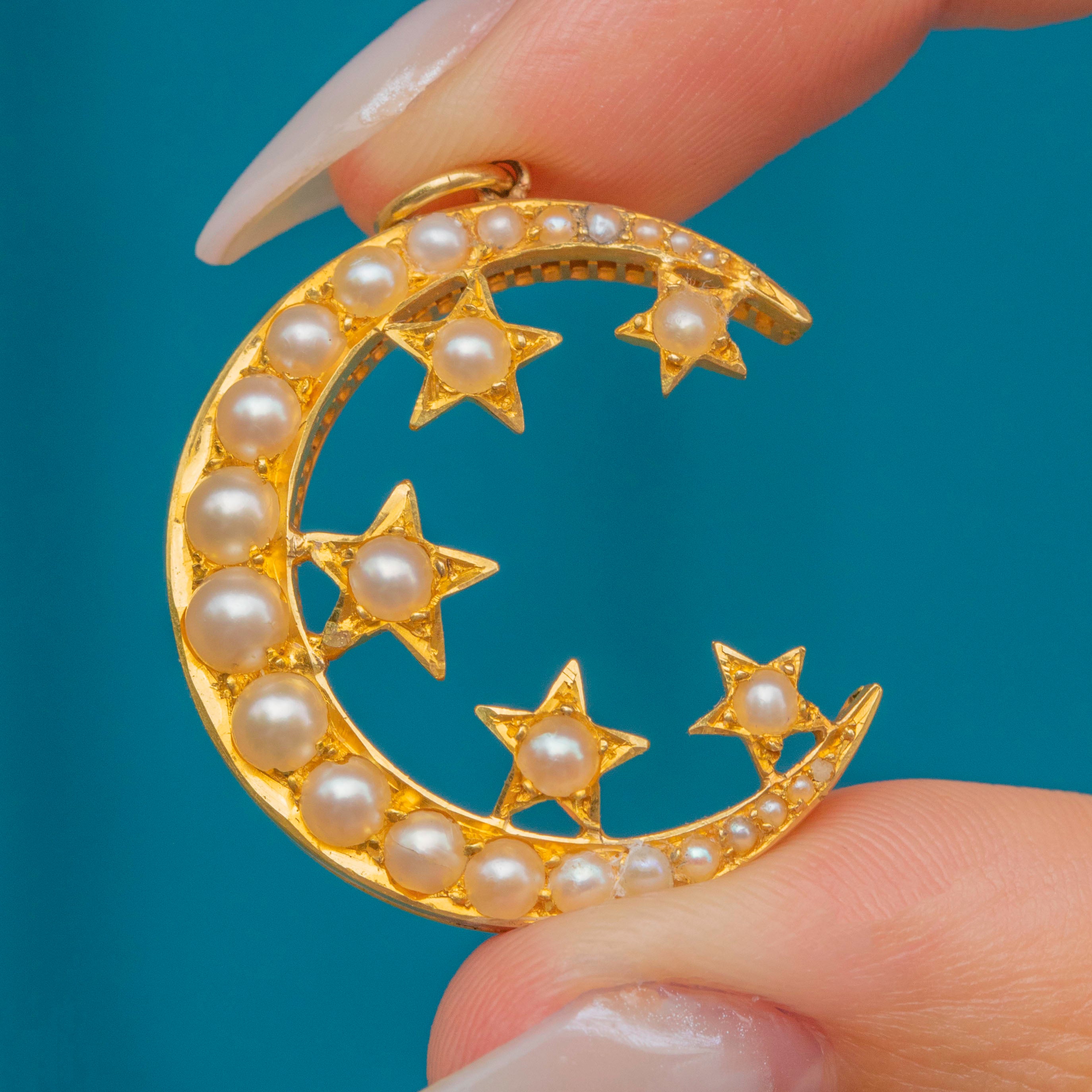 VERY GOOD: The crescent has held its form perfectly and her 18ct Gold is bright and buttery with no damage to note. There is one seed Pearl missing from the very top outer corner of the crescent, which is barely noticeable and the rest of her plush Pearls detract from this. With a soldered jump-ring, this Victorian pendant can be worn confidently in style!