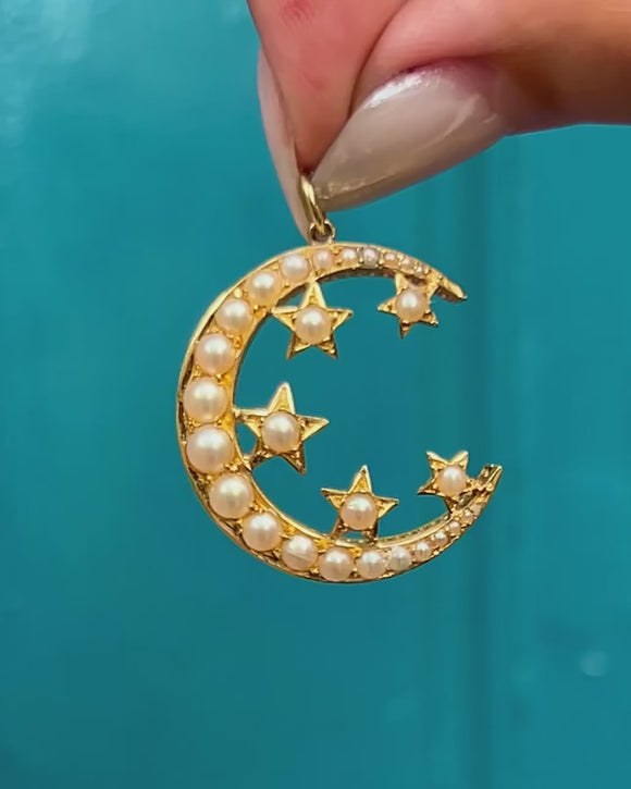 Victorian 18ct Gold Pearl Crescent Moon & Stars Pendant