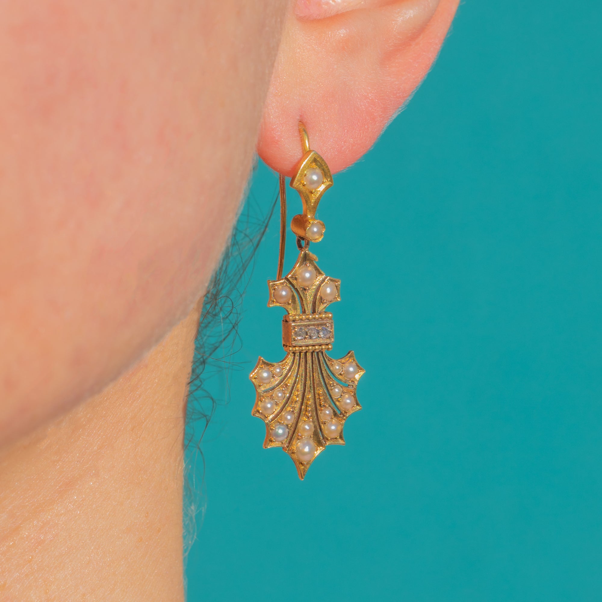 Victorian 18ct Gold Pearl Diamond Fleur de Lis Earrings