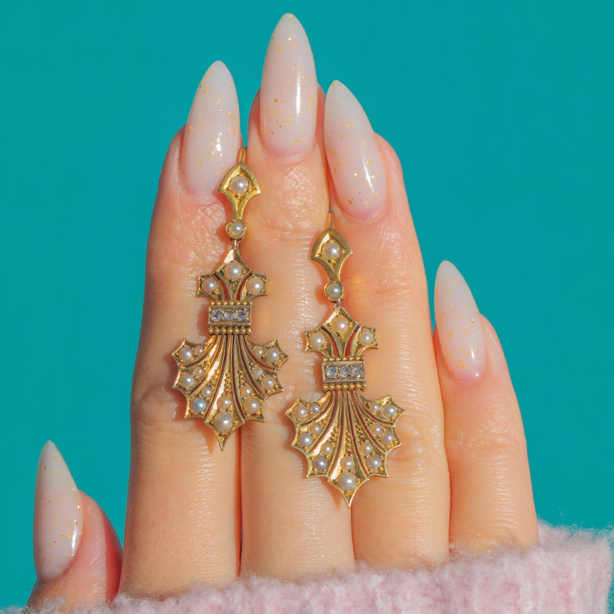Richly ornate and utterly romantic, these Victorian Fleur de Lis drop earrings are a love letter to historic revival design. Crafted in glowing 18ct Gold, each earring cascades from a petite lozenge into a sculpted palmette fan, the surfaces alive with radiating flutes, beaded borders and delicately applied detail. Petite Pearls are scattered like dewdrops across the Gold, while a slim horizontal bar glints with Diamonds set within a contrasting pale-toned panel for a refined kiss of sparkle.