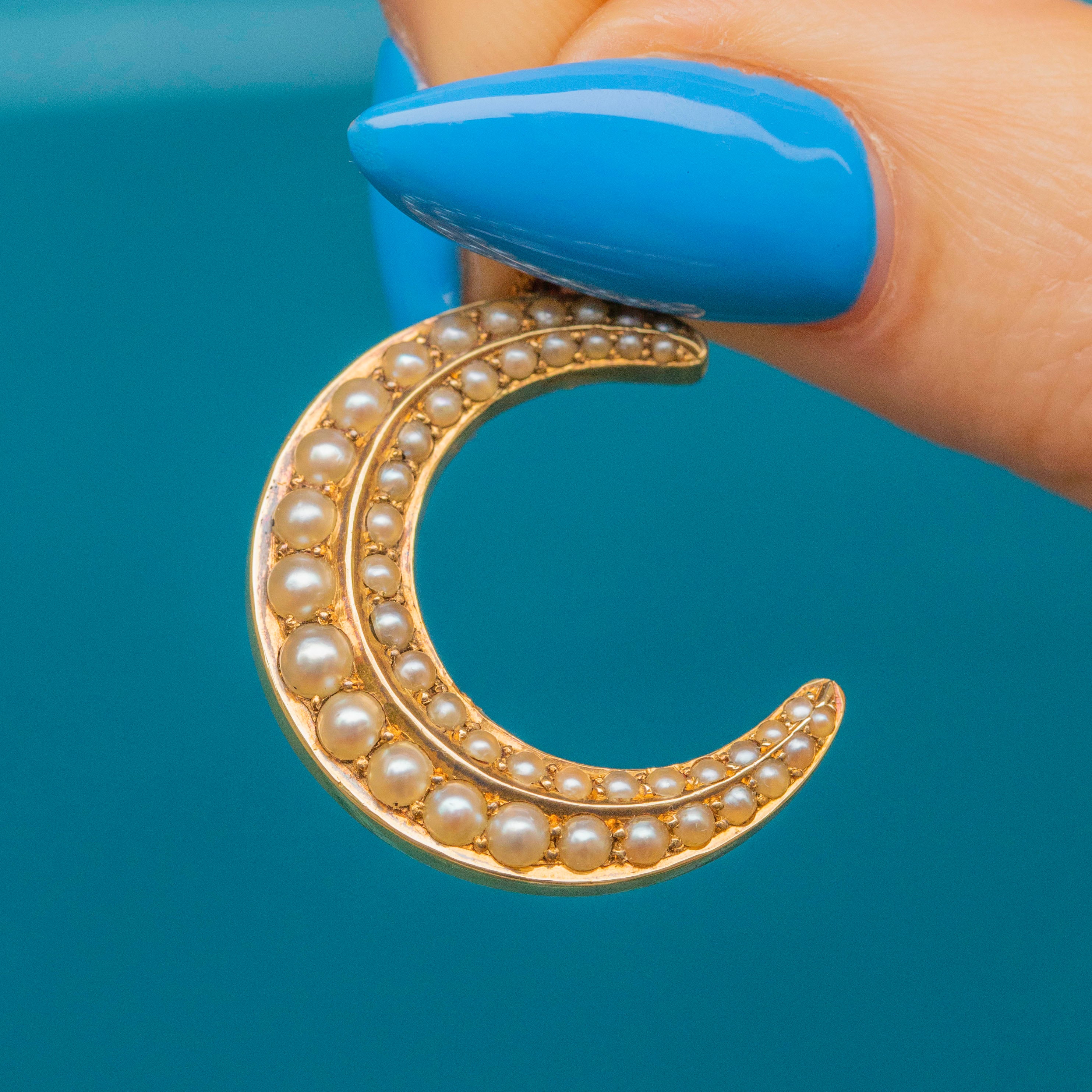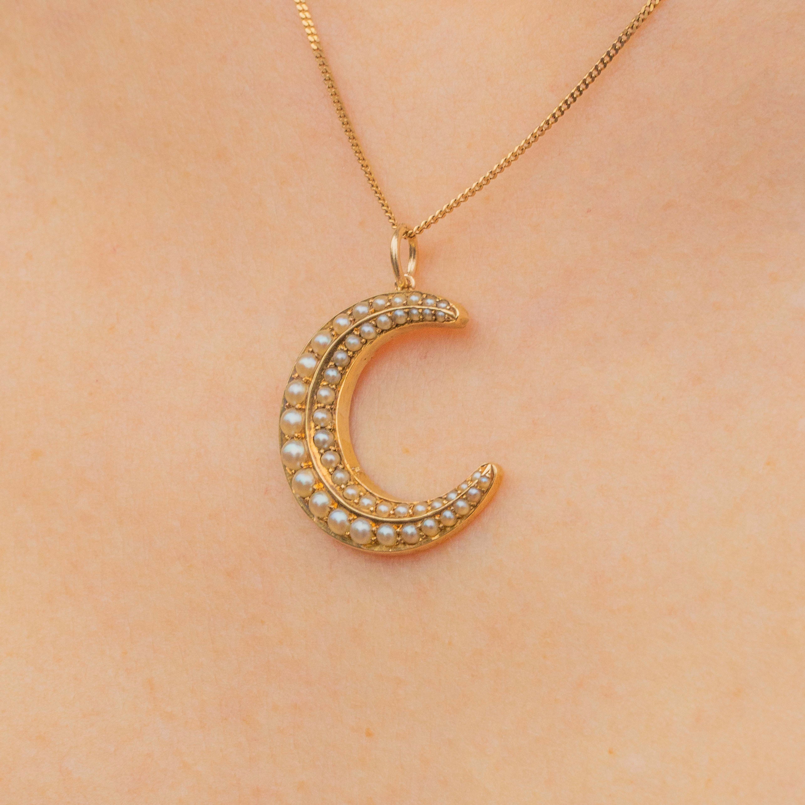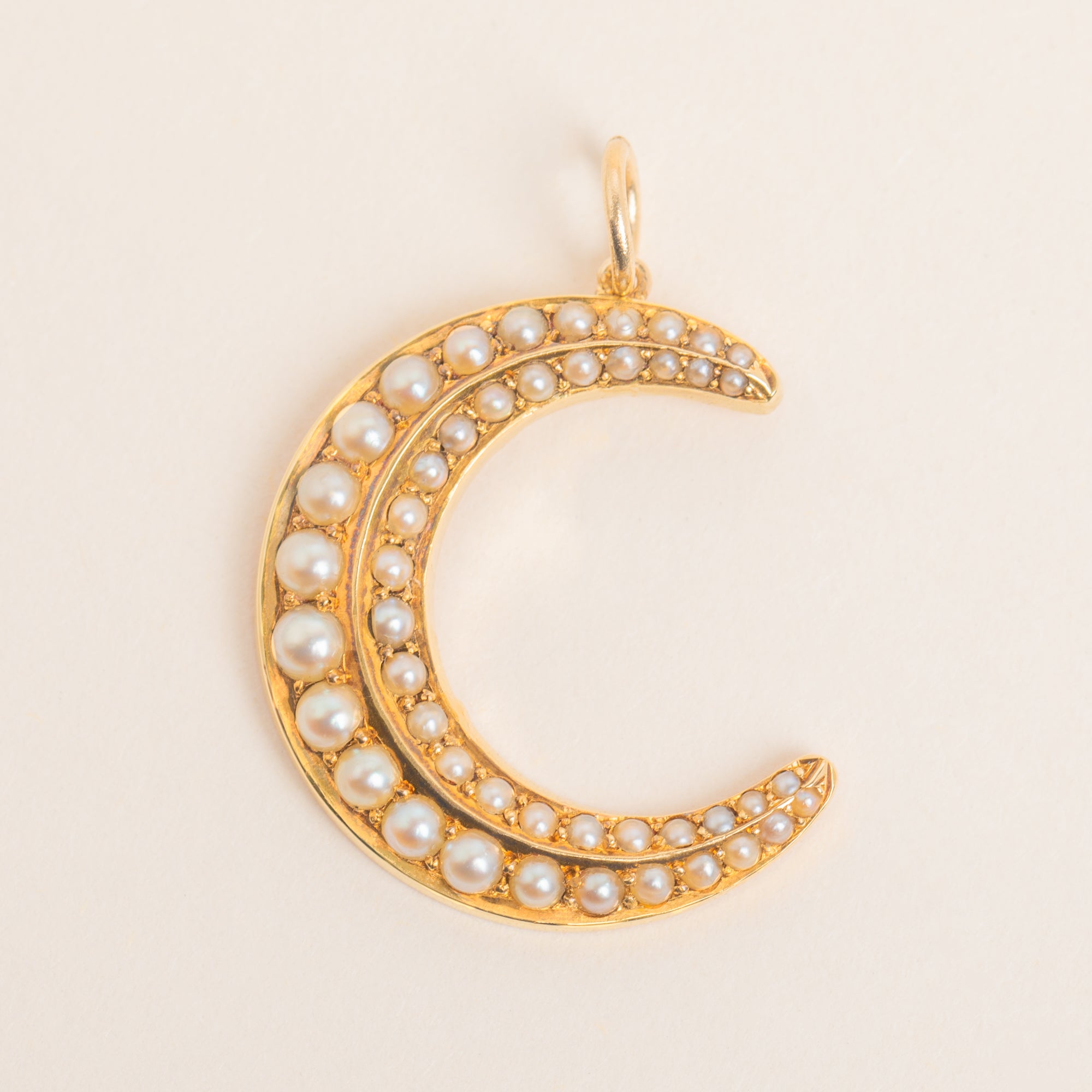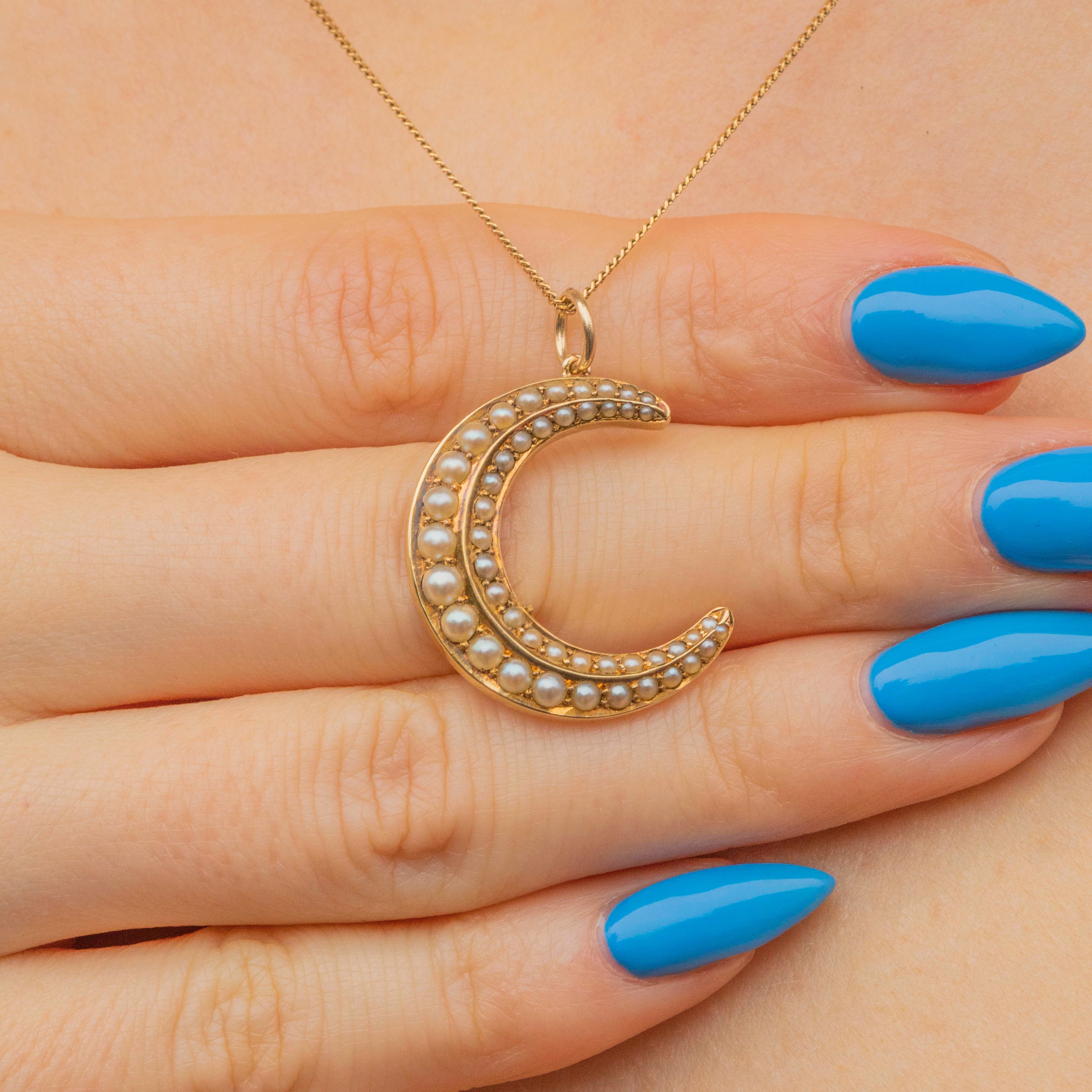 Symbolic of growth and transformation, crescent moons have long been a favourite motif in jewellery. This Victorian celestial pendant has been inlaid with two rows of luminous Pearls varying in size and hue, giving her an irresistible iridescence akin to the moon in a clear night sky!