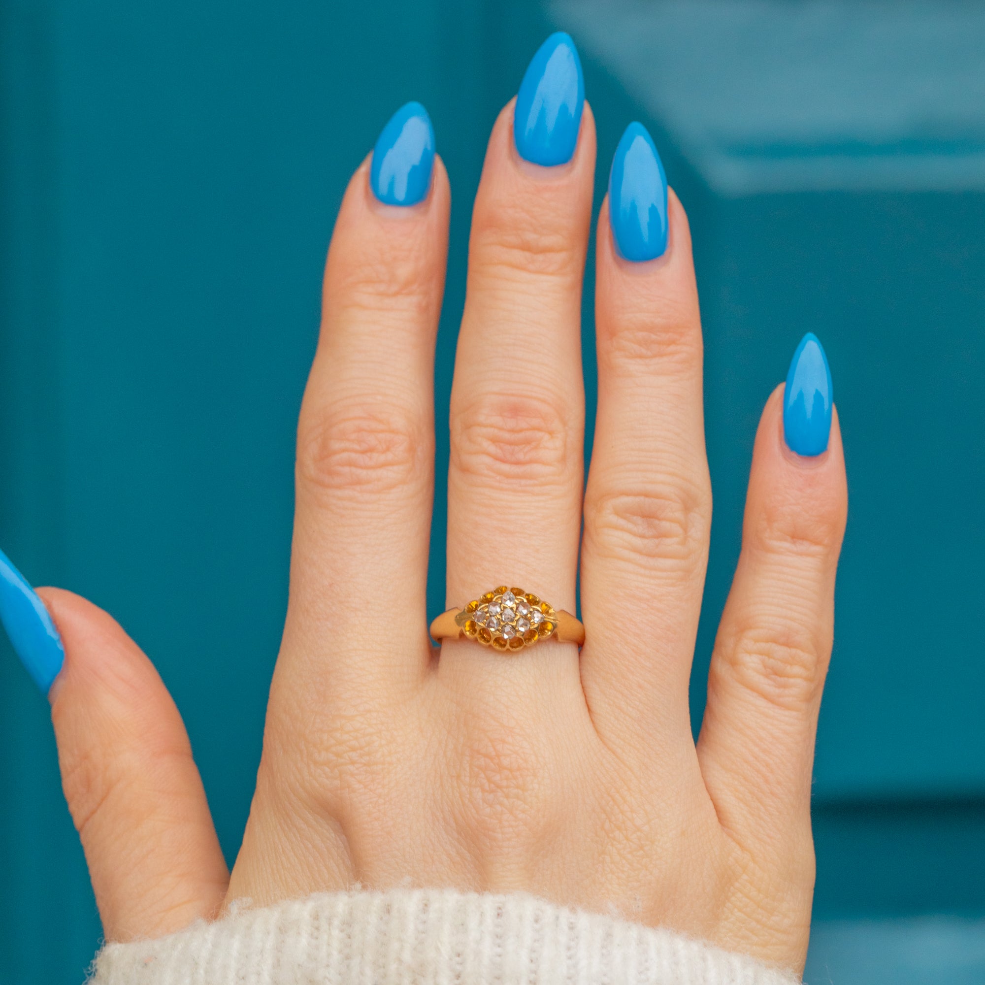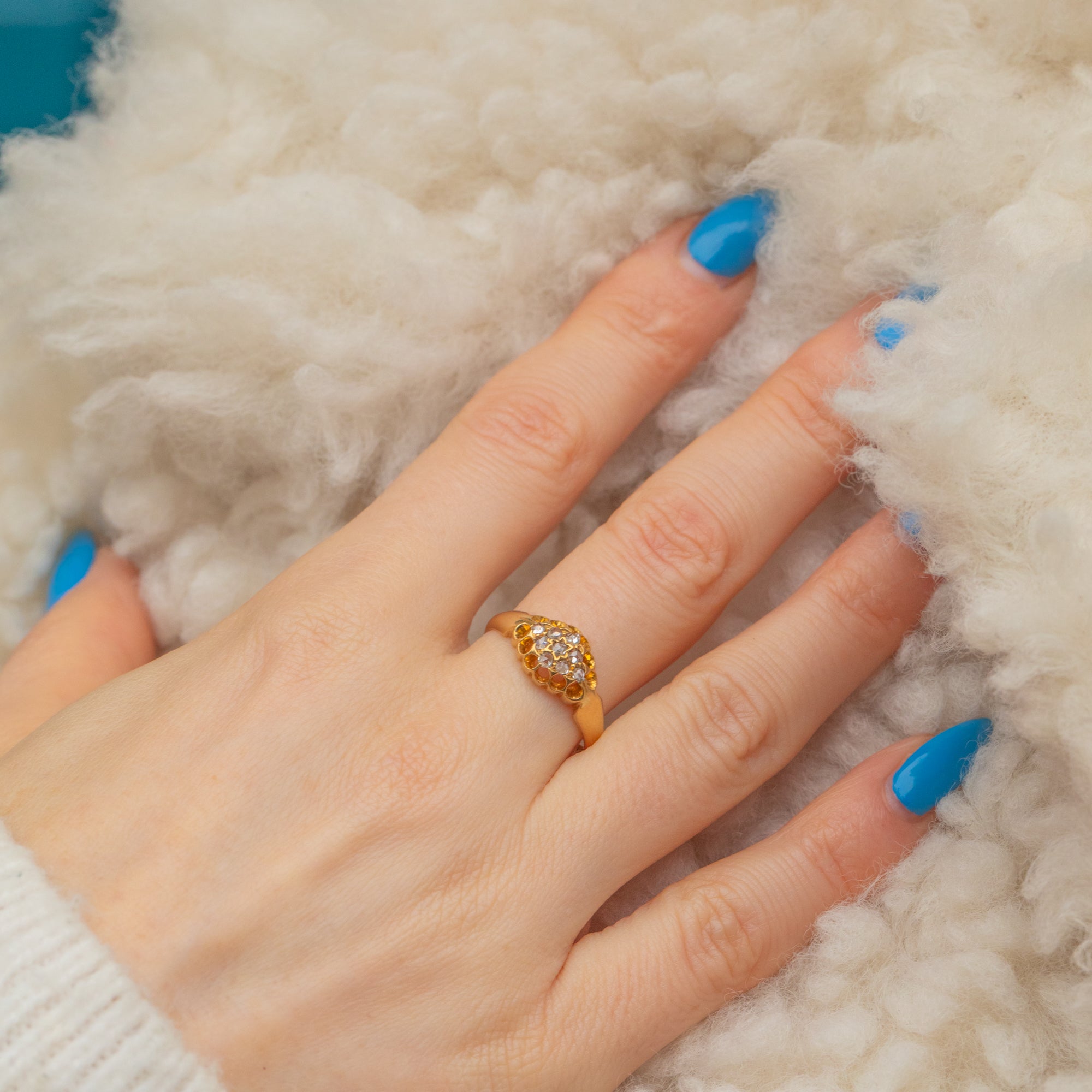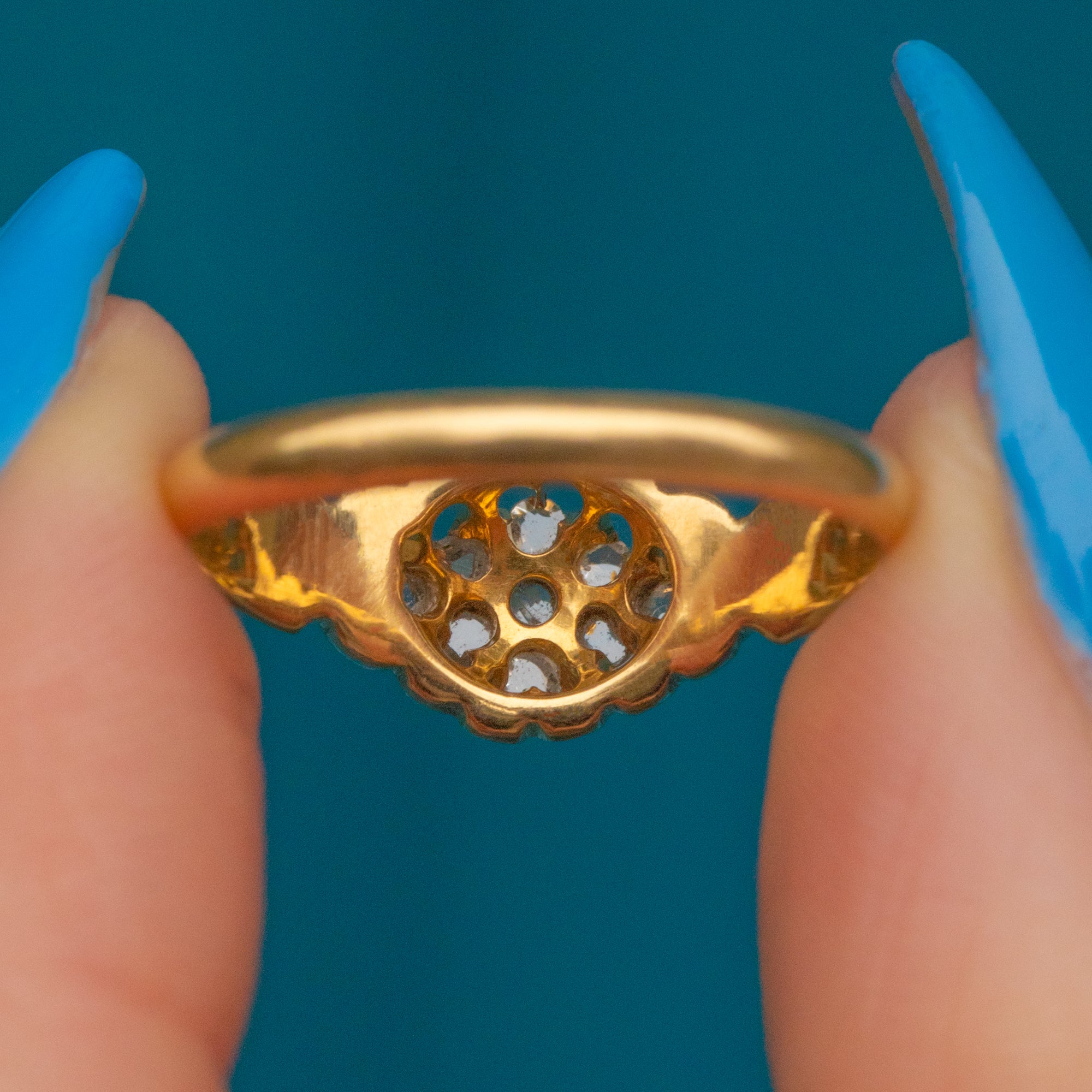 Crafted from exquisite materials and boasting a bright scintillation, this Victorian 18ct Gold rose-cut Diamond cluster ring will bring undeniable luxury to your hand! The impressive cluster of Diamonds is elegantly framed by buttercup settings, with a cute star motif framing the central rose-cut Diamond adding a touch of celestial charm.