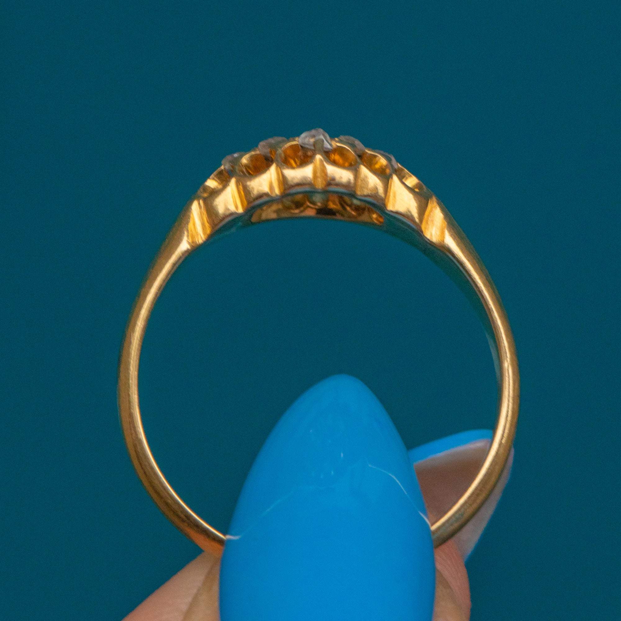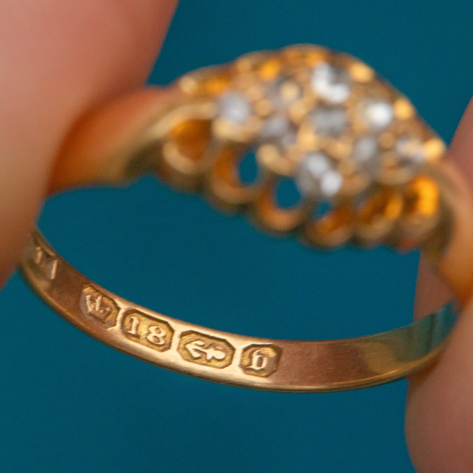 EXCELLENT. This Victorian 18ct Gold rose-cut Diamond cluster ring is in excellent condition. The Gold is bright and buttery with lovely reflective qualities, holding the Diamonds securely in place. Each rose-cut Diamond is present with no signs of surface wear, providing this ring with a bright sparkling accent. With a full set of English hallmarks dating to 1895, this Victorian treasure will make a coveted addition to your antique jewellery collection!