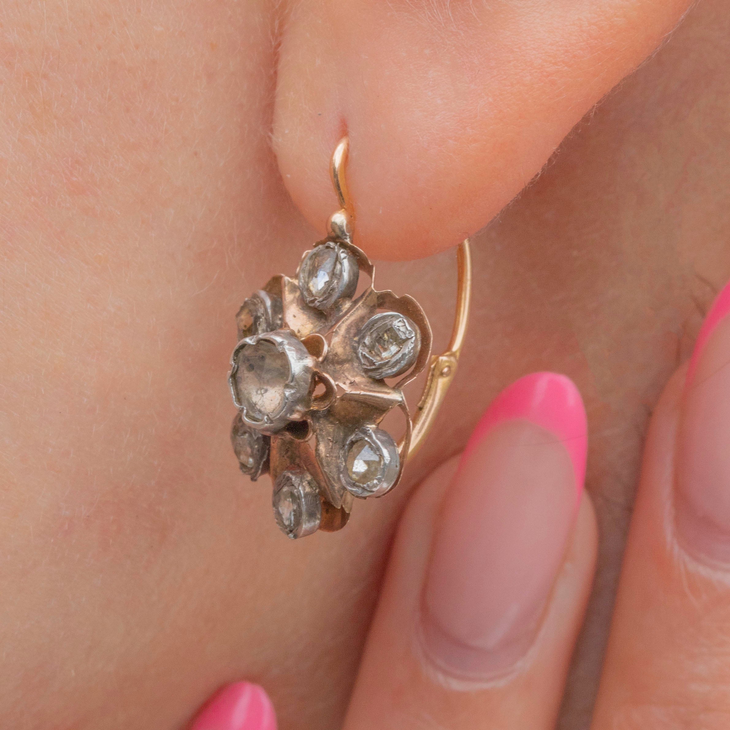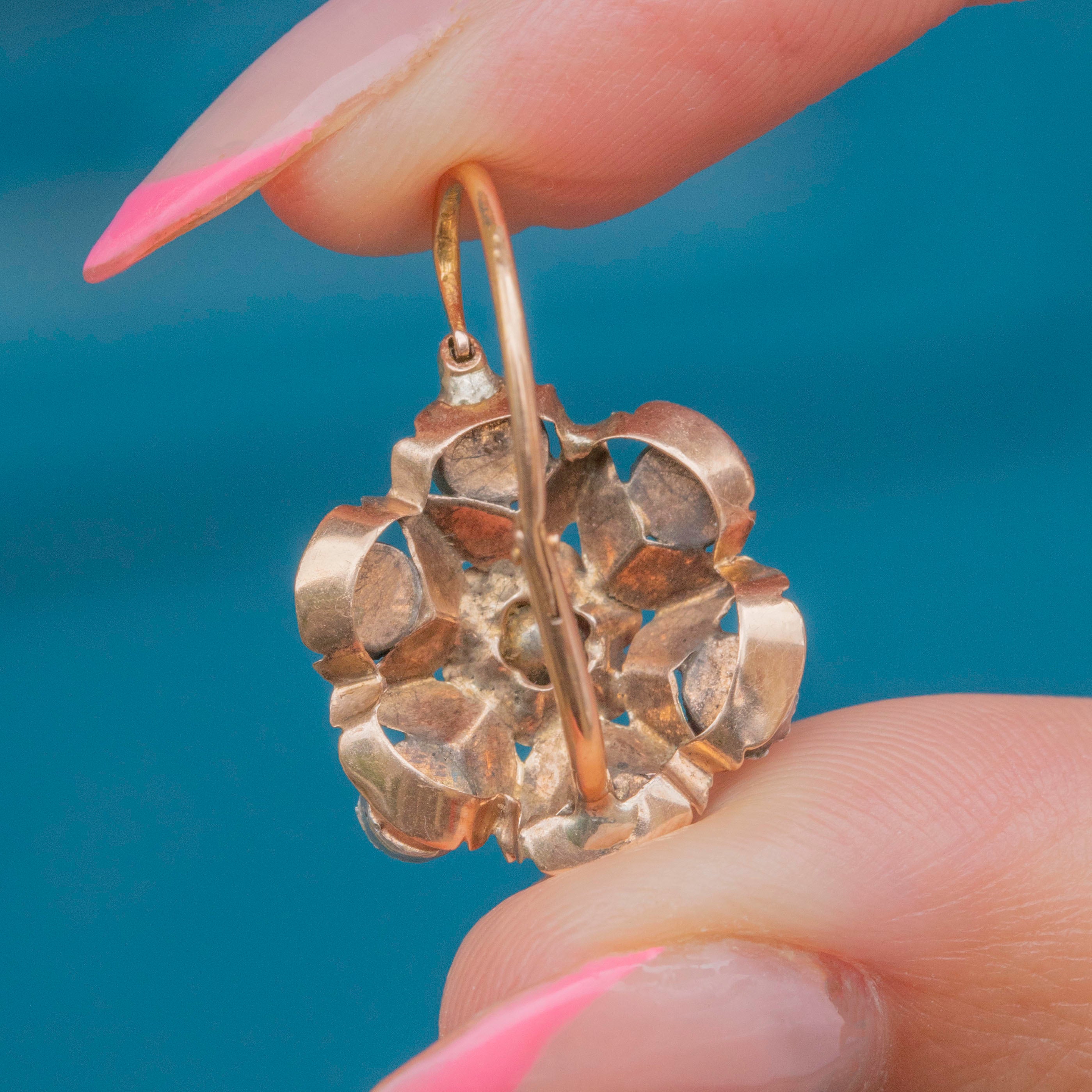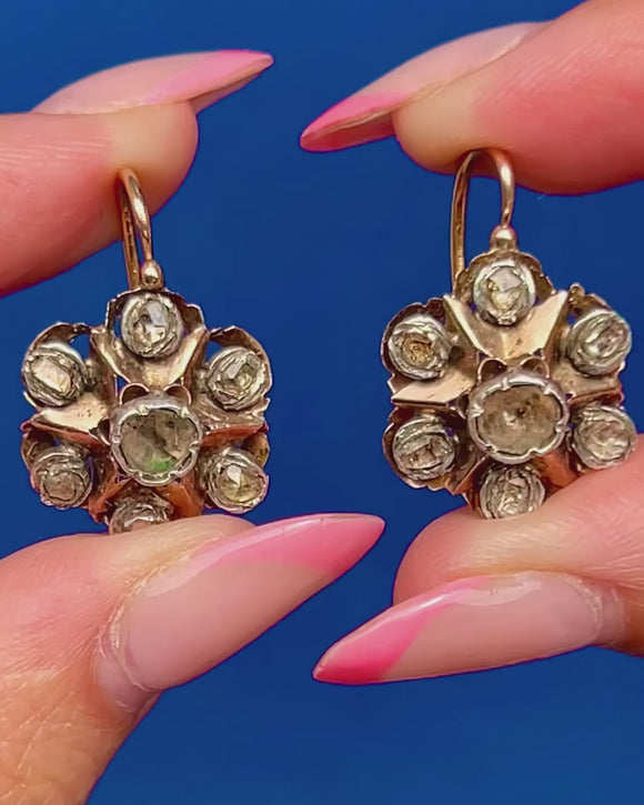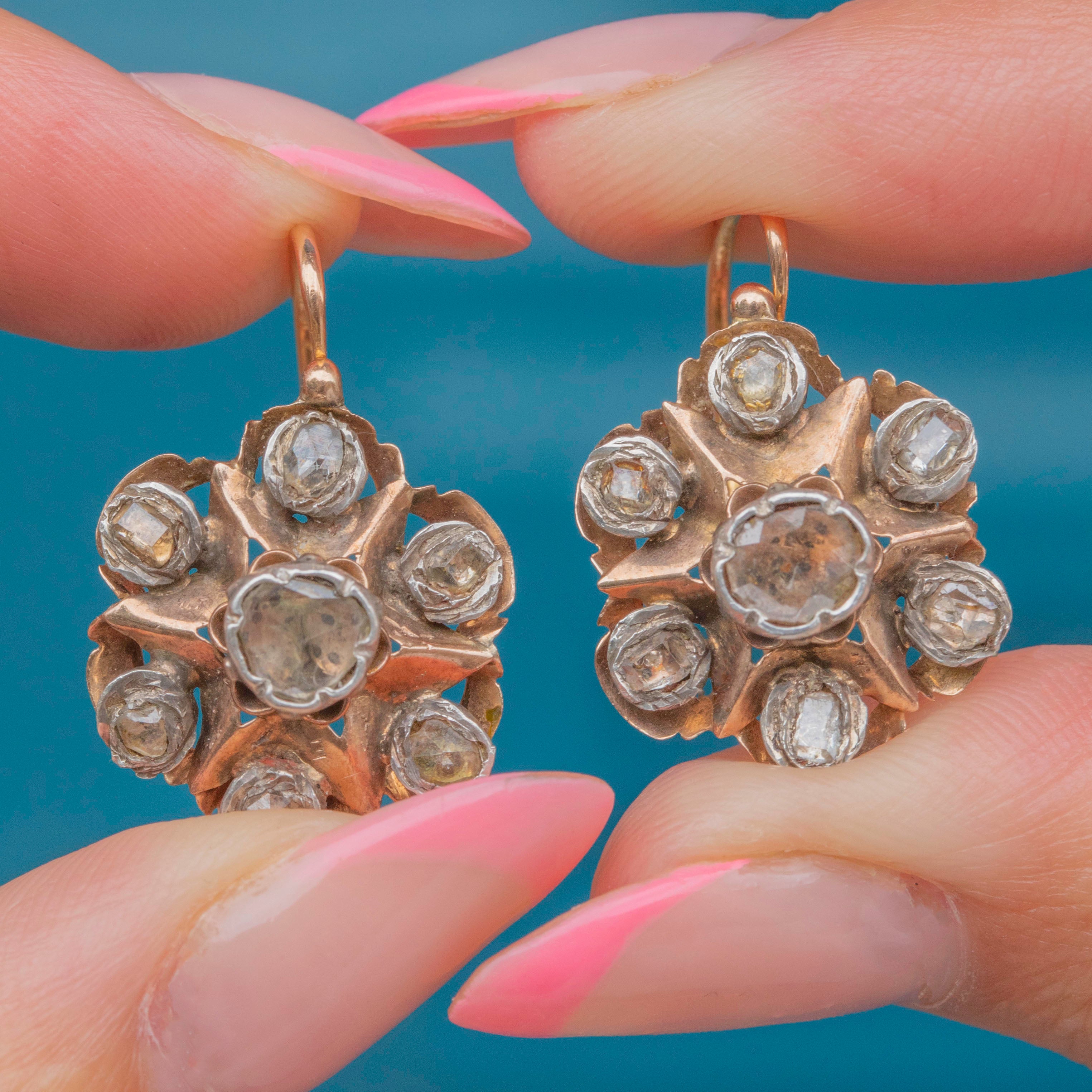 VERY GOOD: These Victorian 18ct Gold rose-cut Diamond flower cluster earrings are in very good condition. The Diamonds are all original, bright and securely set, with only minimal age-related wear noticeable under close inspection. The Gold has a lovely rosy hue, there is some patina within the details, which is to be expected given their age. The earrings have held their form well over the years, and the hooks slot into place securely, allowing you to wear them confidently!