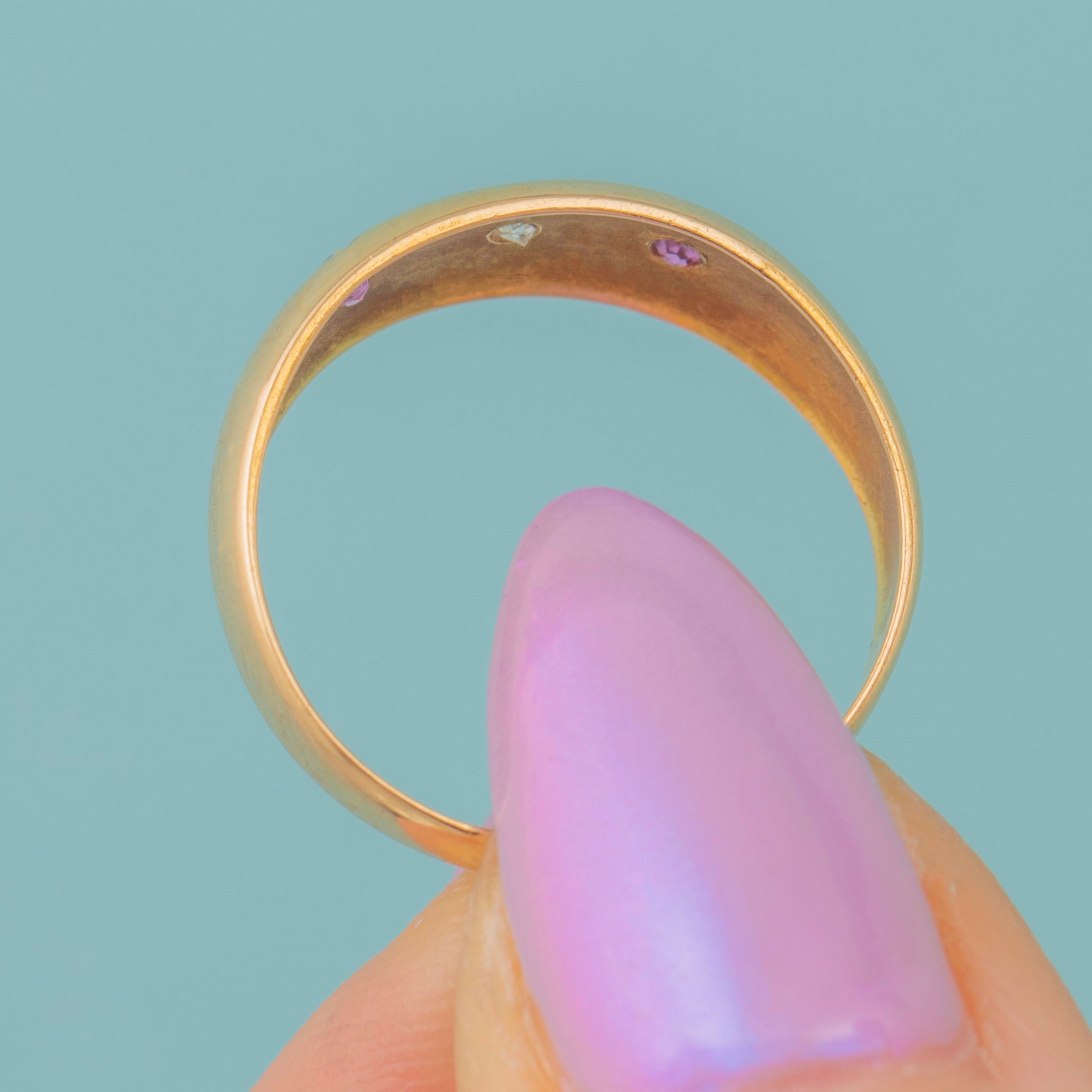 VERY GOOD-EXCELLENT: This Victorian 18ct Gold Ruby Diamond gypsy ring is in superb condition. Her gemstones are radiant and secure within their star settings. There are minor signs of wear to the Gold, including some small pinprick marks to the front, however this is difficult to spot without a jeweller's loupe. The band comes complete with a full set of English hallmarks dating to 1892, making this Victorian gypsy ring a coveted piece!