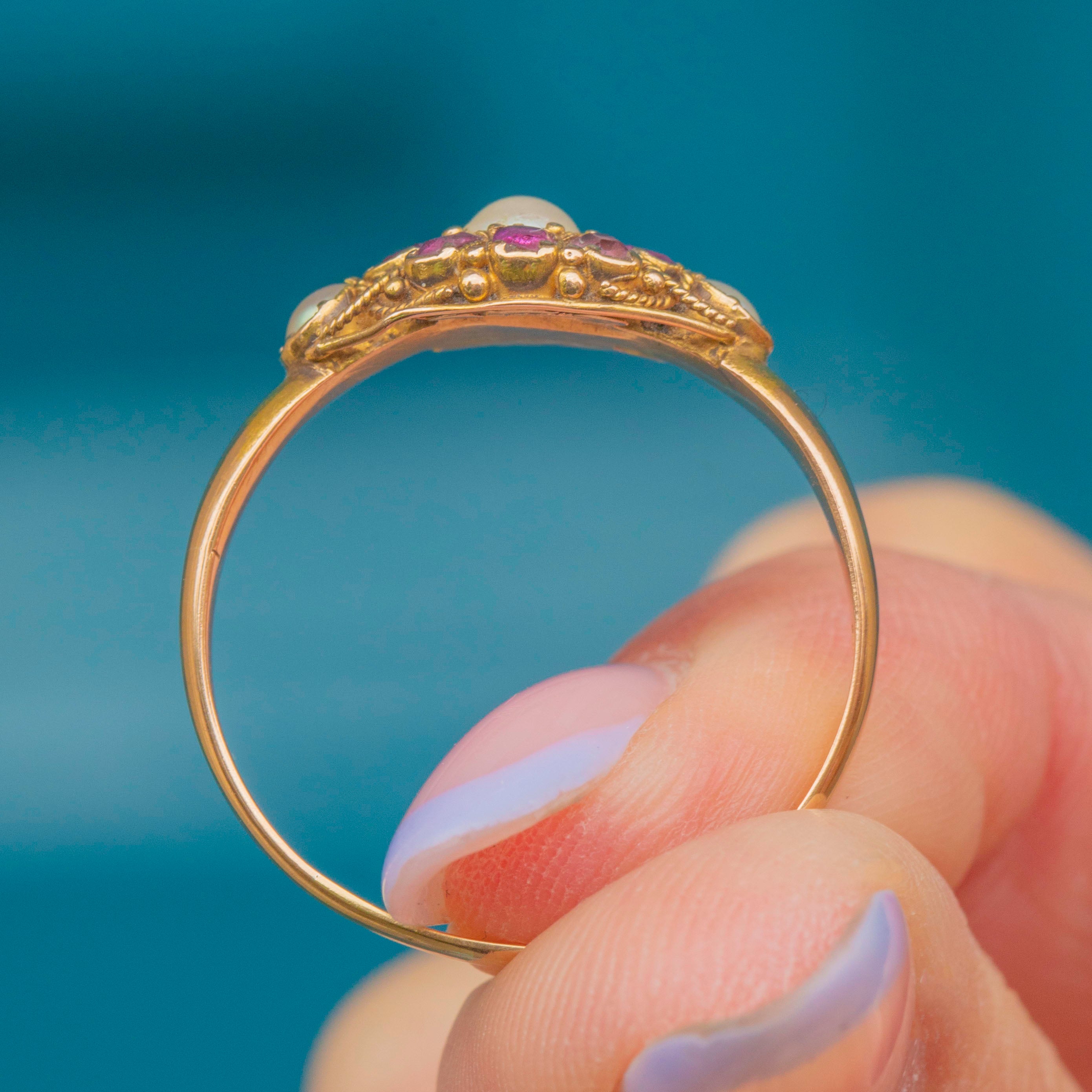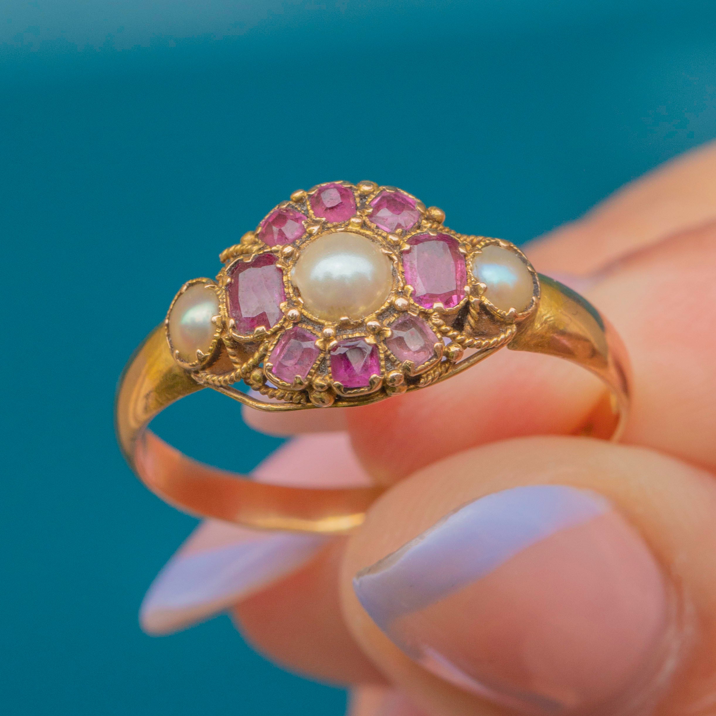 VERY GOOD: This Victorian 18ct Gold Ruby Pearl flower ring is in very good condition. The gemstones are securely set, with minimal signs of wear. There are some scratches to the back of the ring face as well as evidence of a previous resize on the back of the shank, which do not impact the integrity of the ring. Fitting comfortably and crafted meticulously, this antique ring can be worn with confidence.