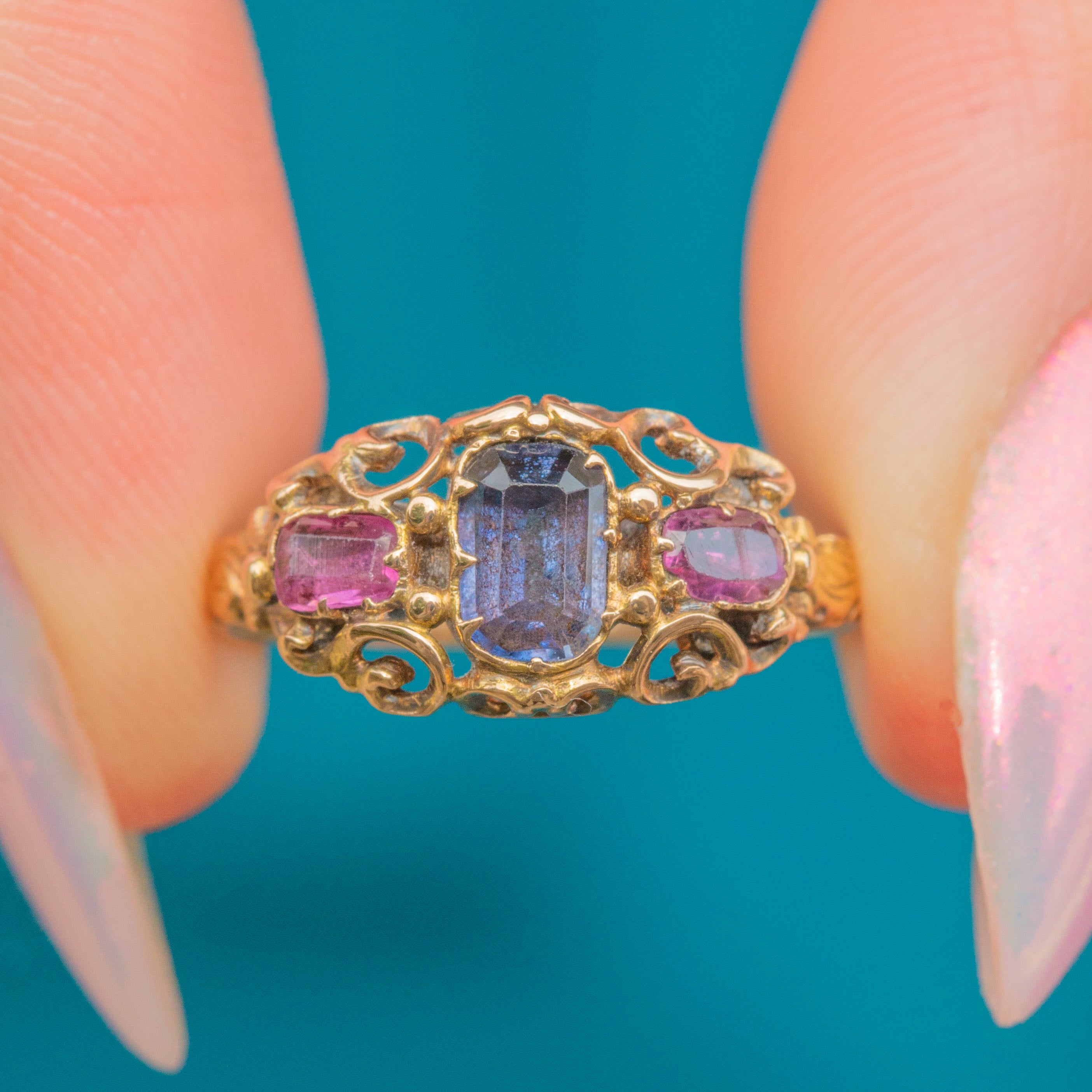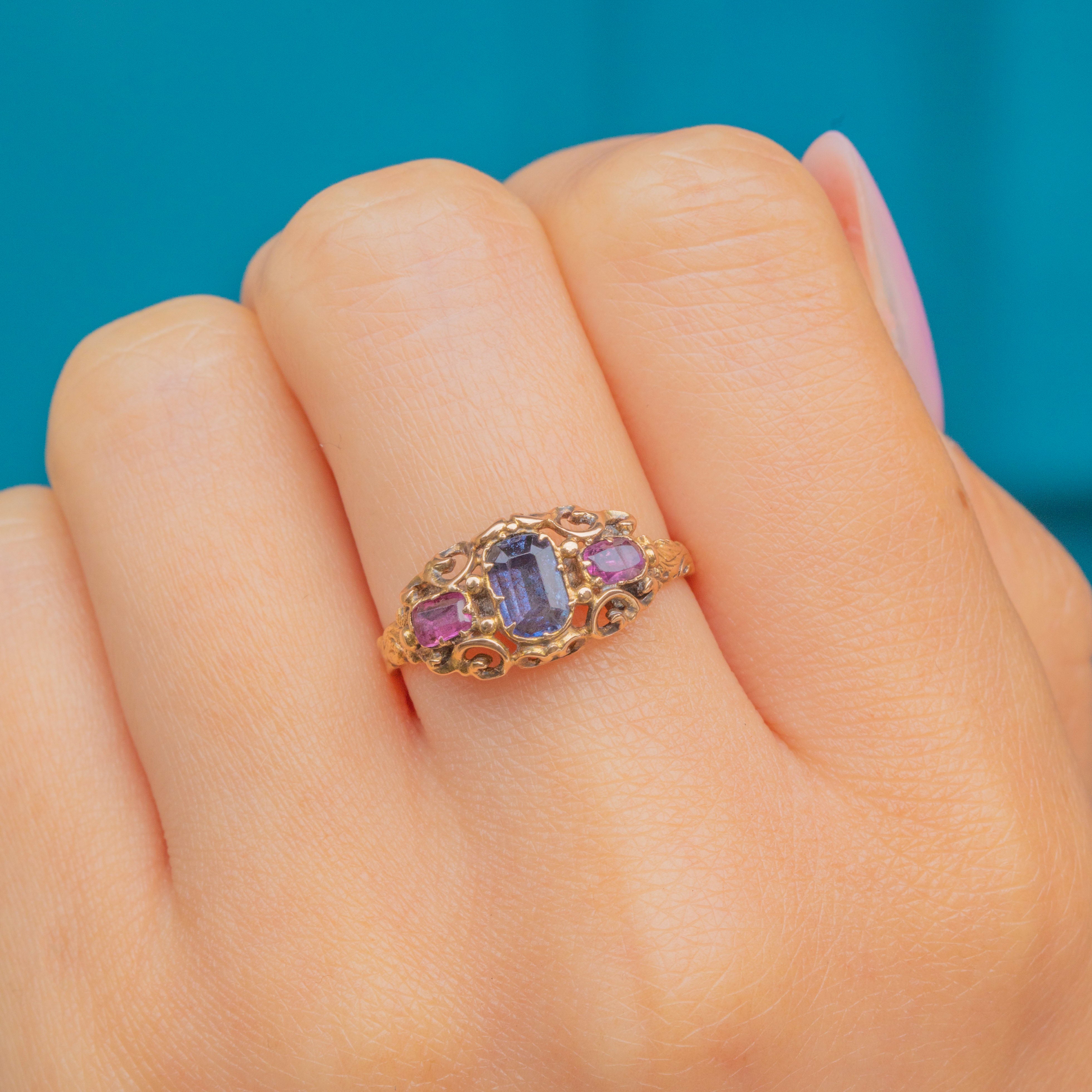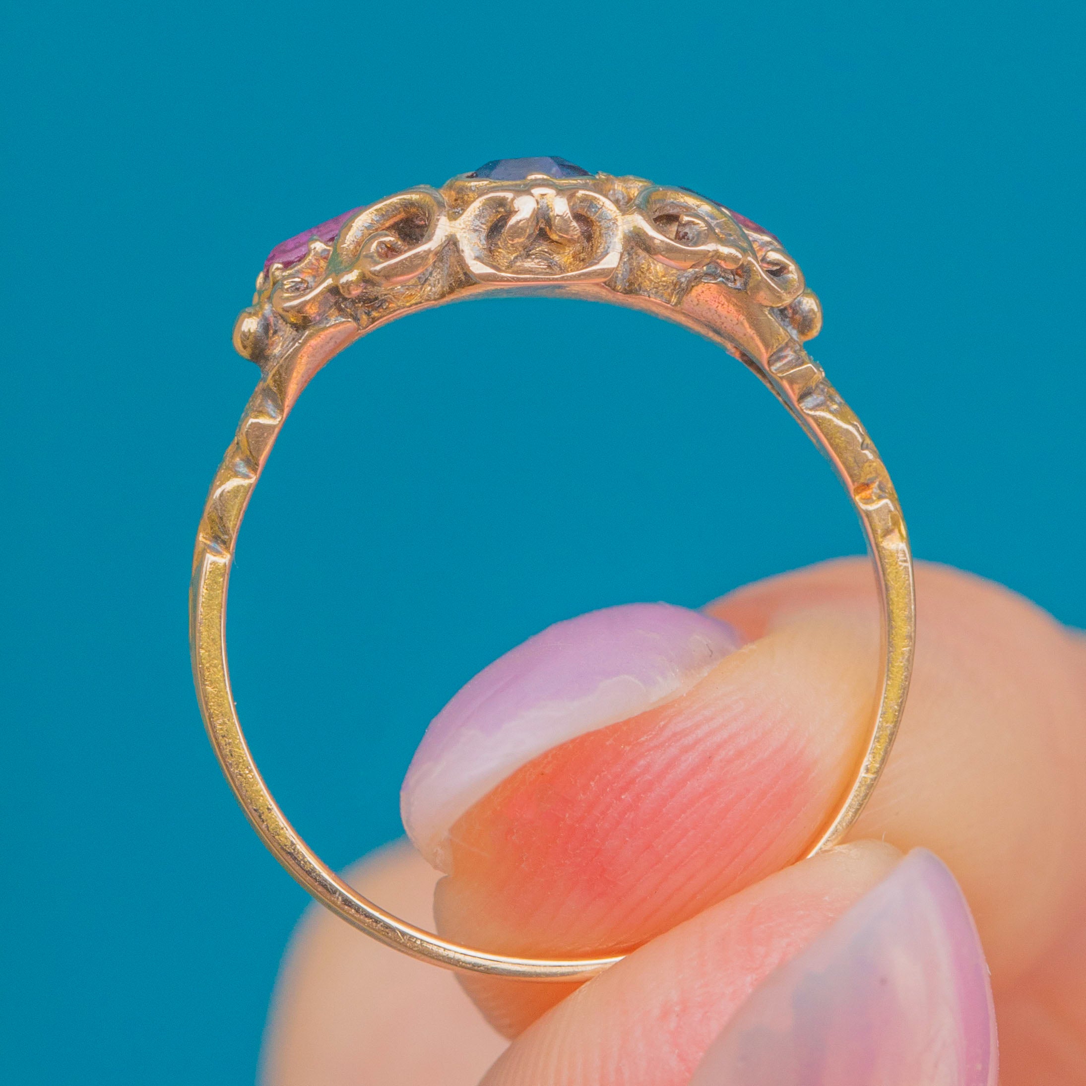 Victorian 18ct Gold Ruby Sapphire Three Stone Ring, Ornate Settings