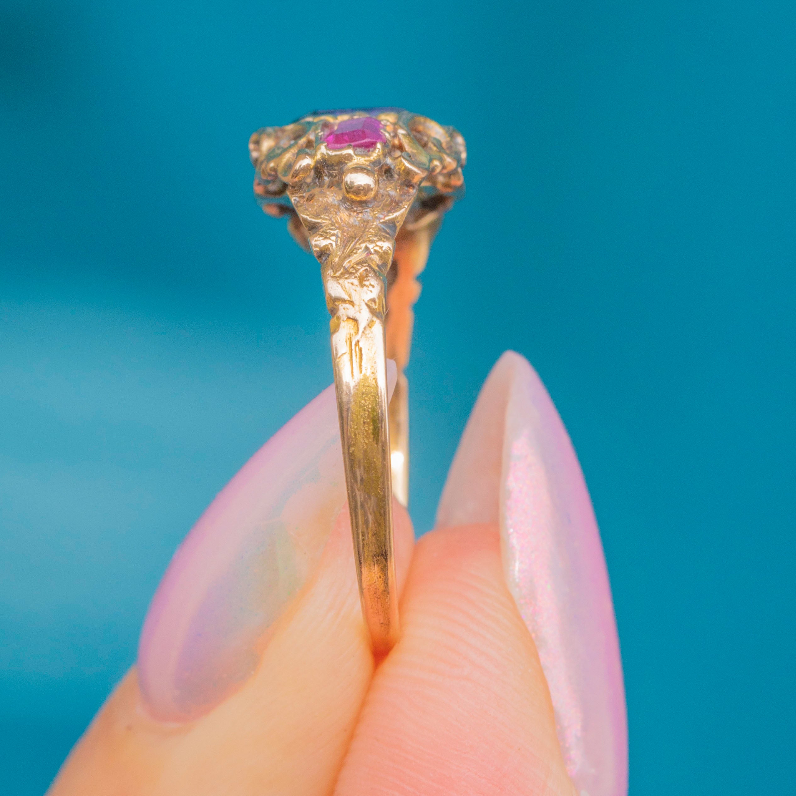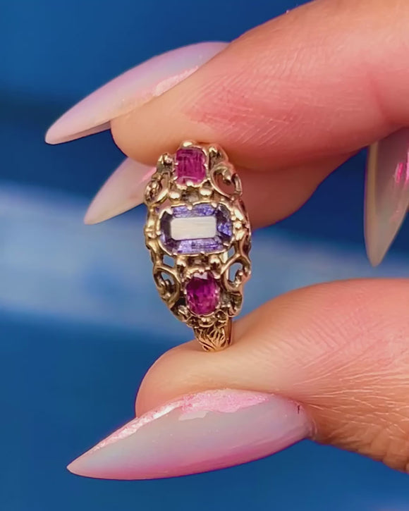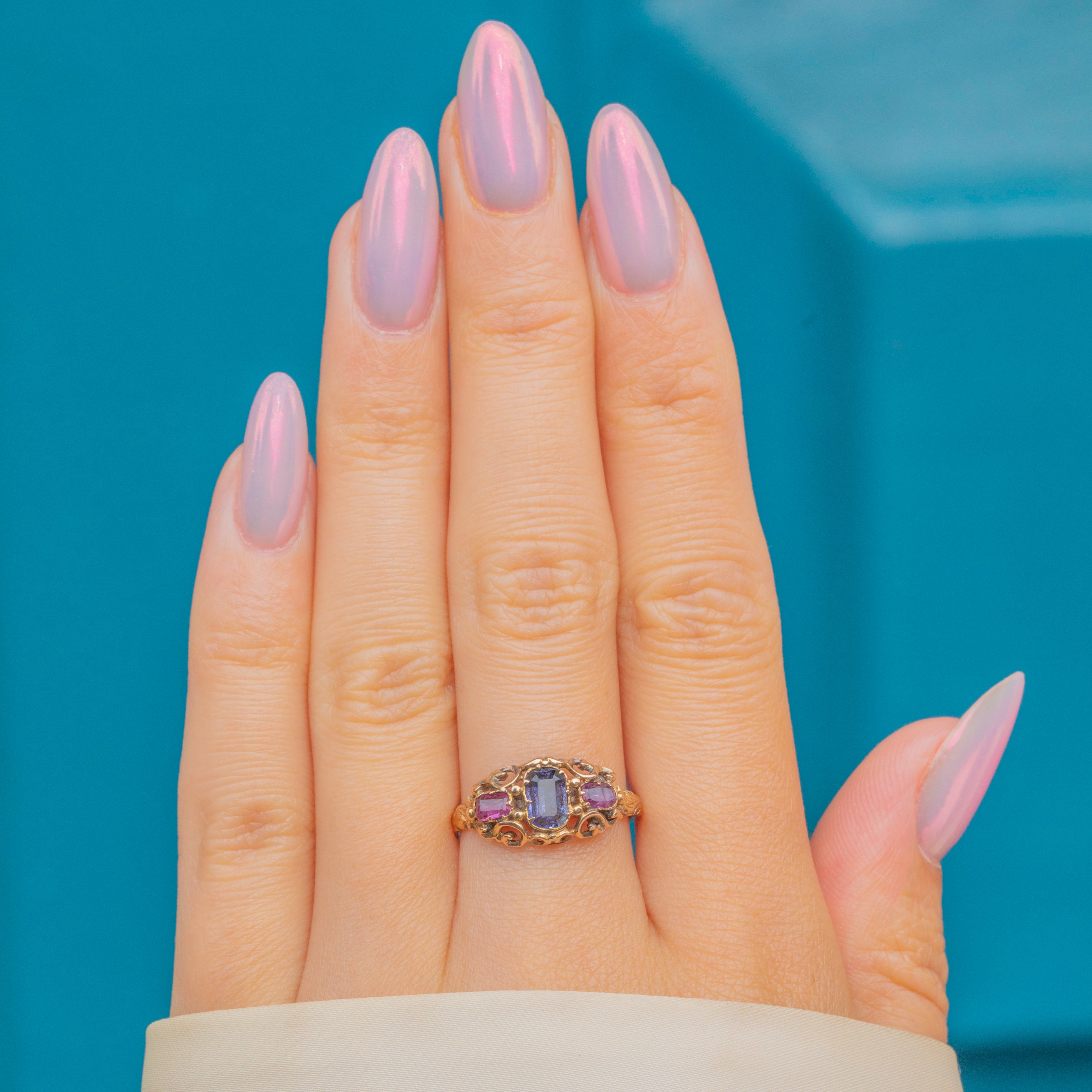 Victorian 18ct Gold Ruby Sapphire Three Stone Ring, Ornate Settings