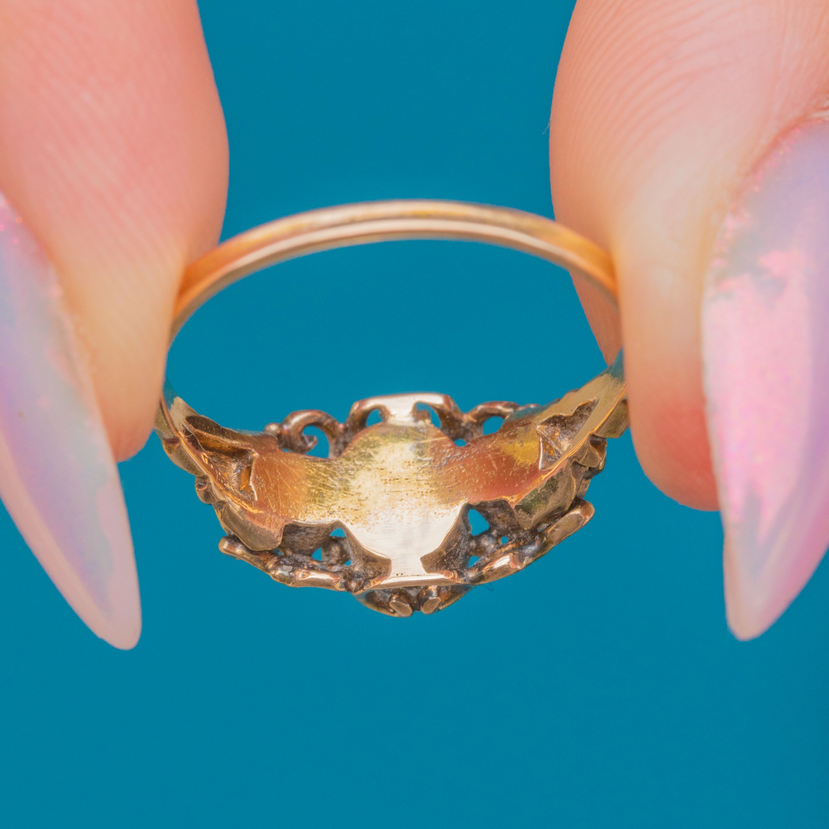Crafted from glowing, buttery 18ct Gold, the band is adorned with beautifully ornate scrolled settings, full of old-world detail and timeless elegance. A true treasure from the past, brimming with character and antique allure.