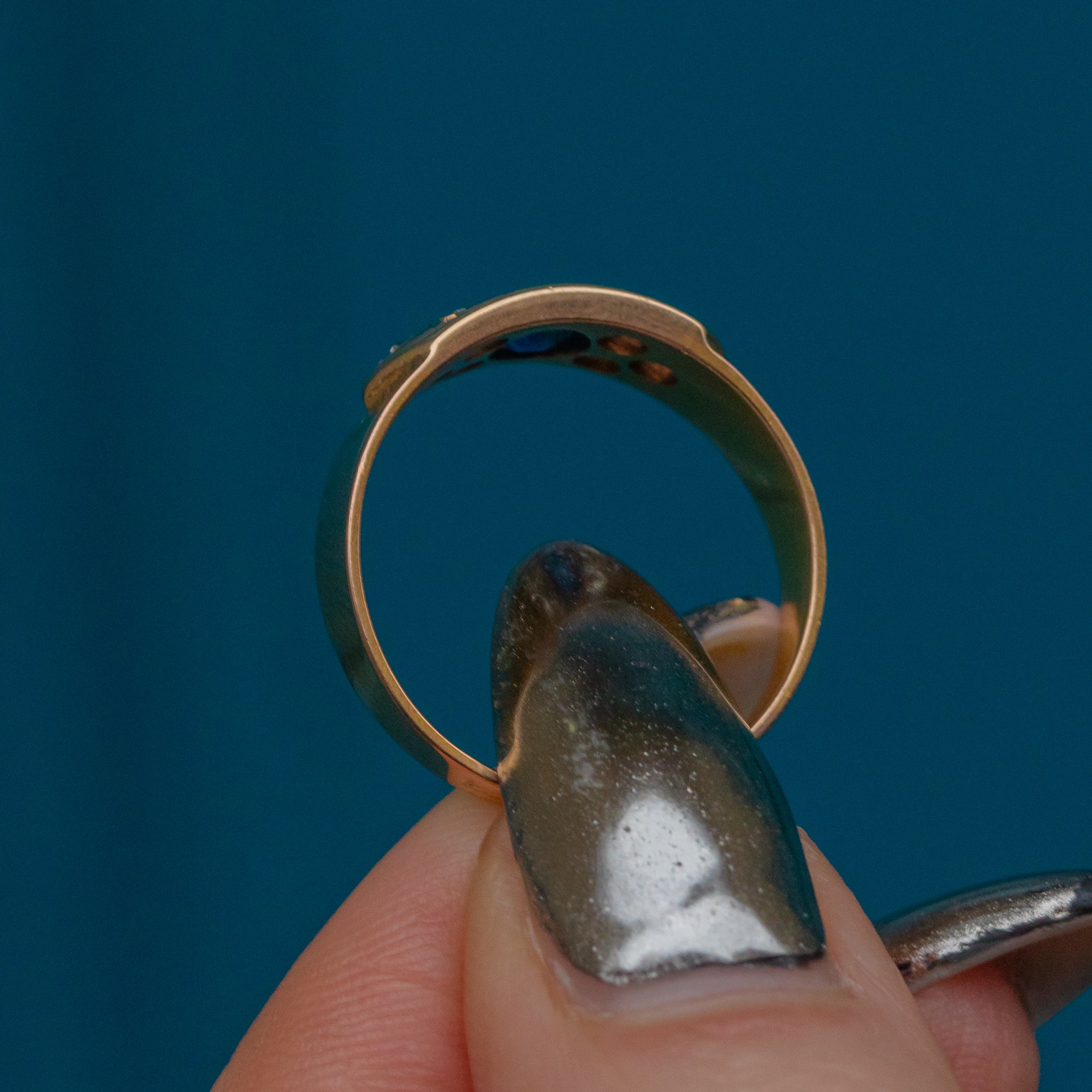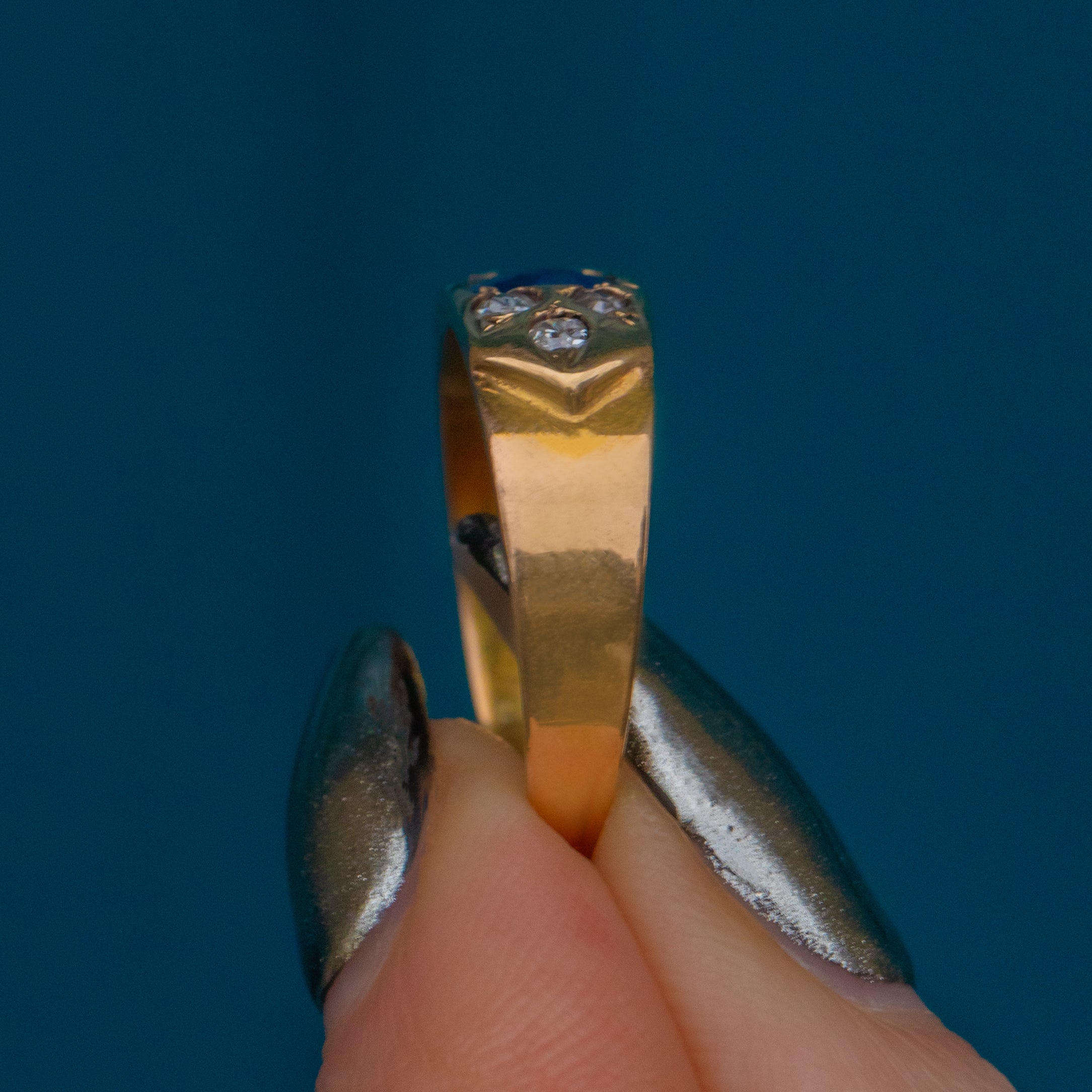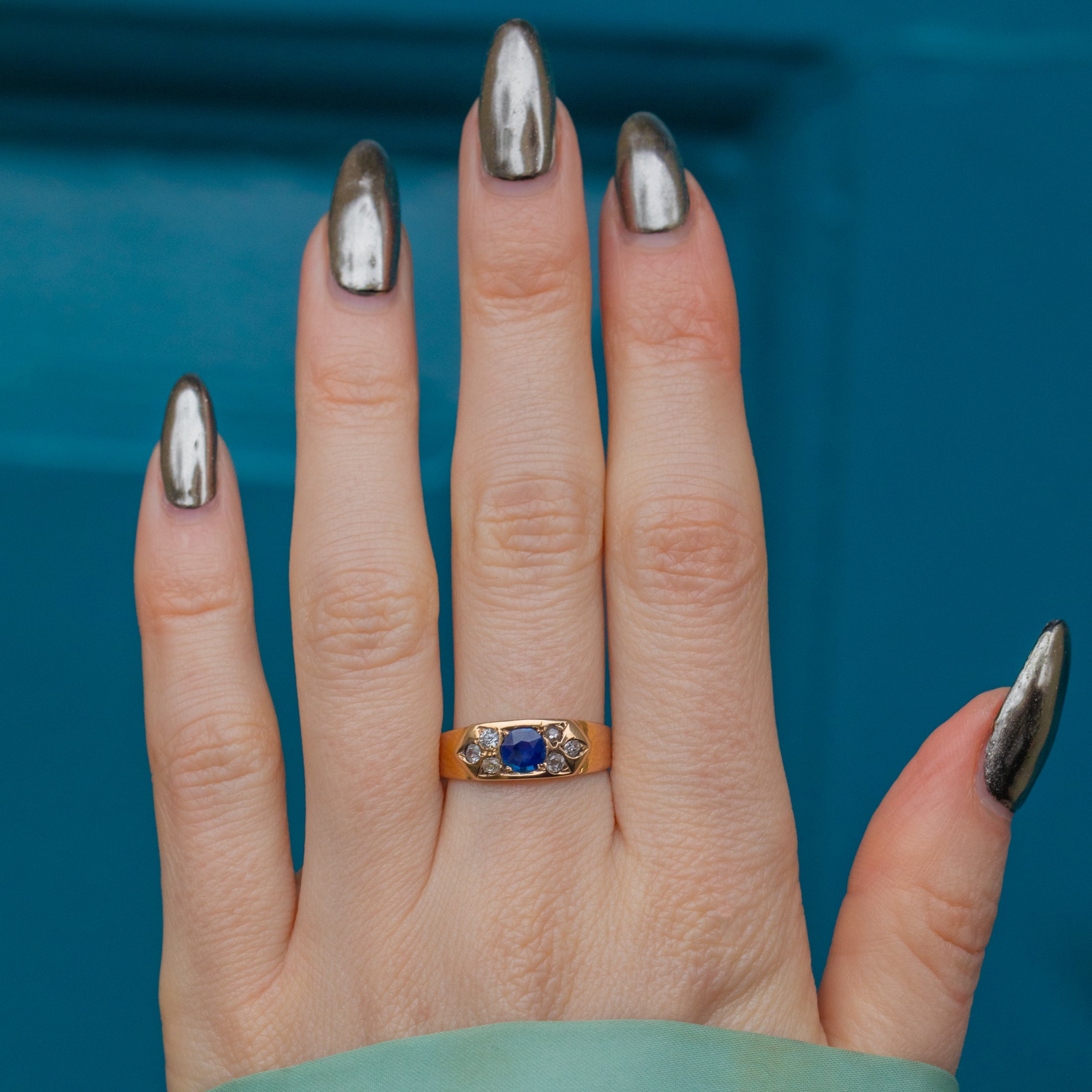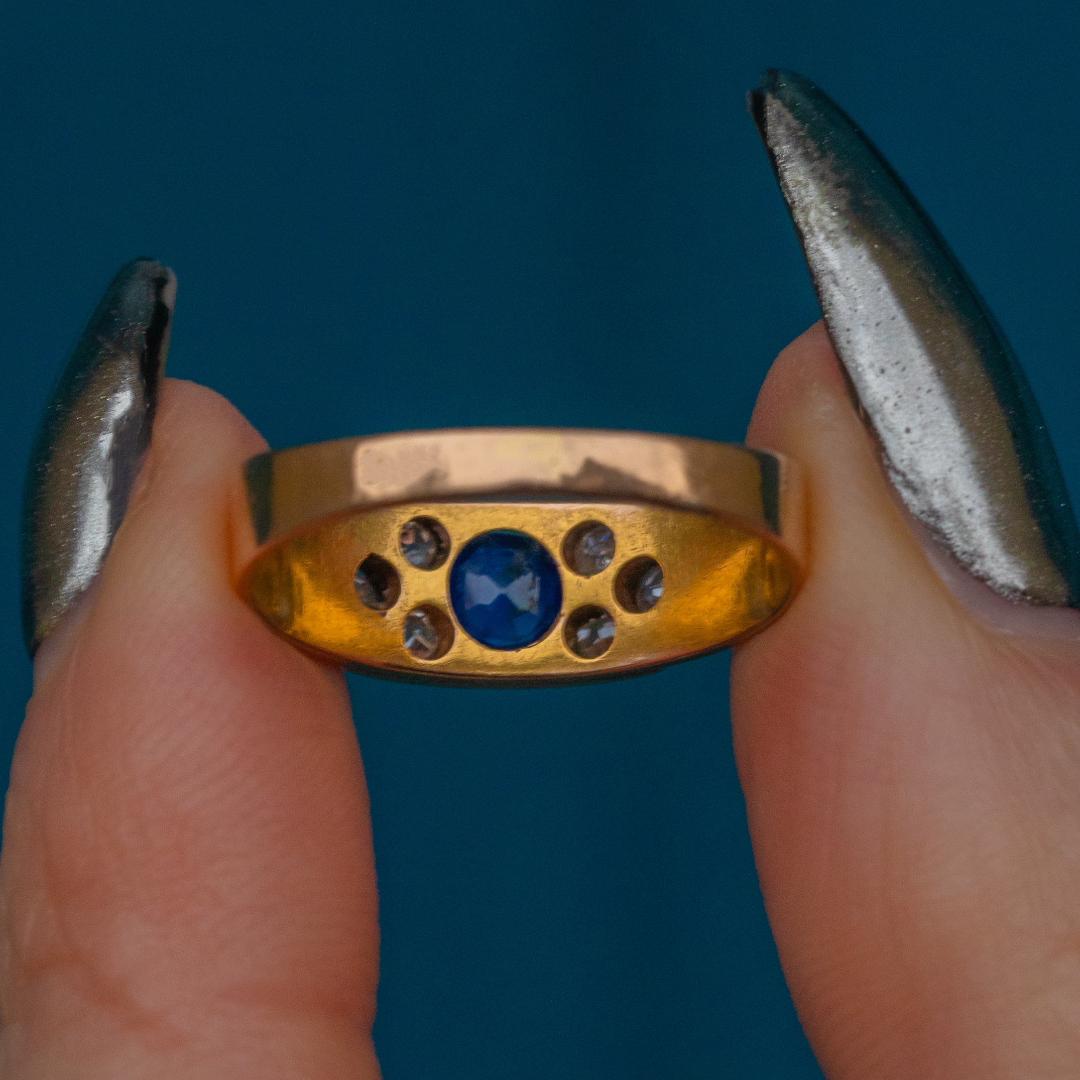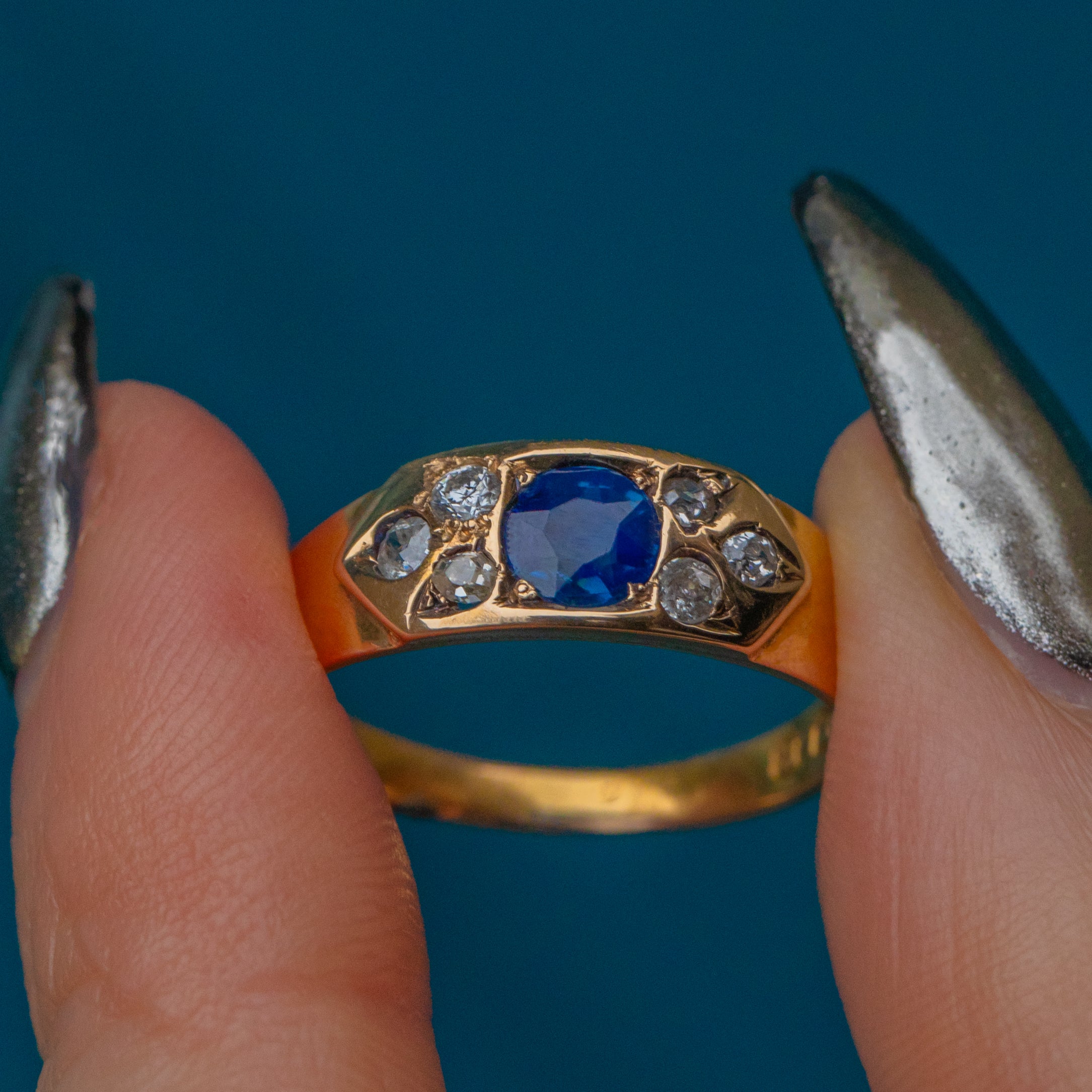 The royal blue hue of the Sapphire is perfectly complemented by the buttery Gold, framed by a sprinkling of twinkling Diamonds. With a low profile making this antique gypsy ring perfect for everyday wear, you can easily style it as a standalone piece or stacked amongst your other favourite gems!