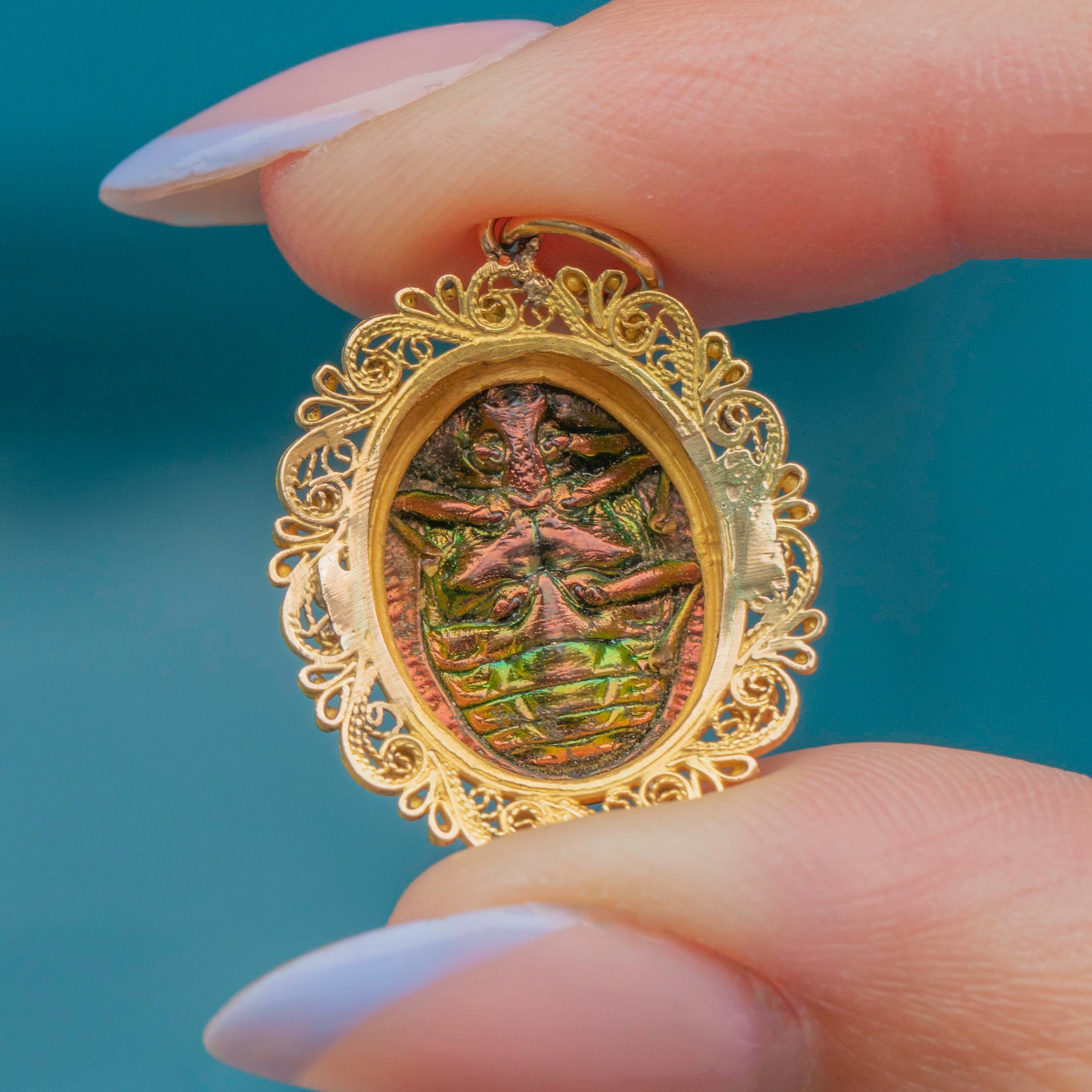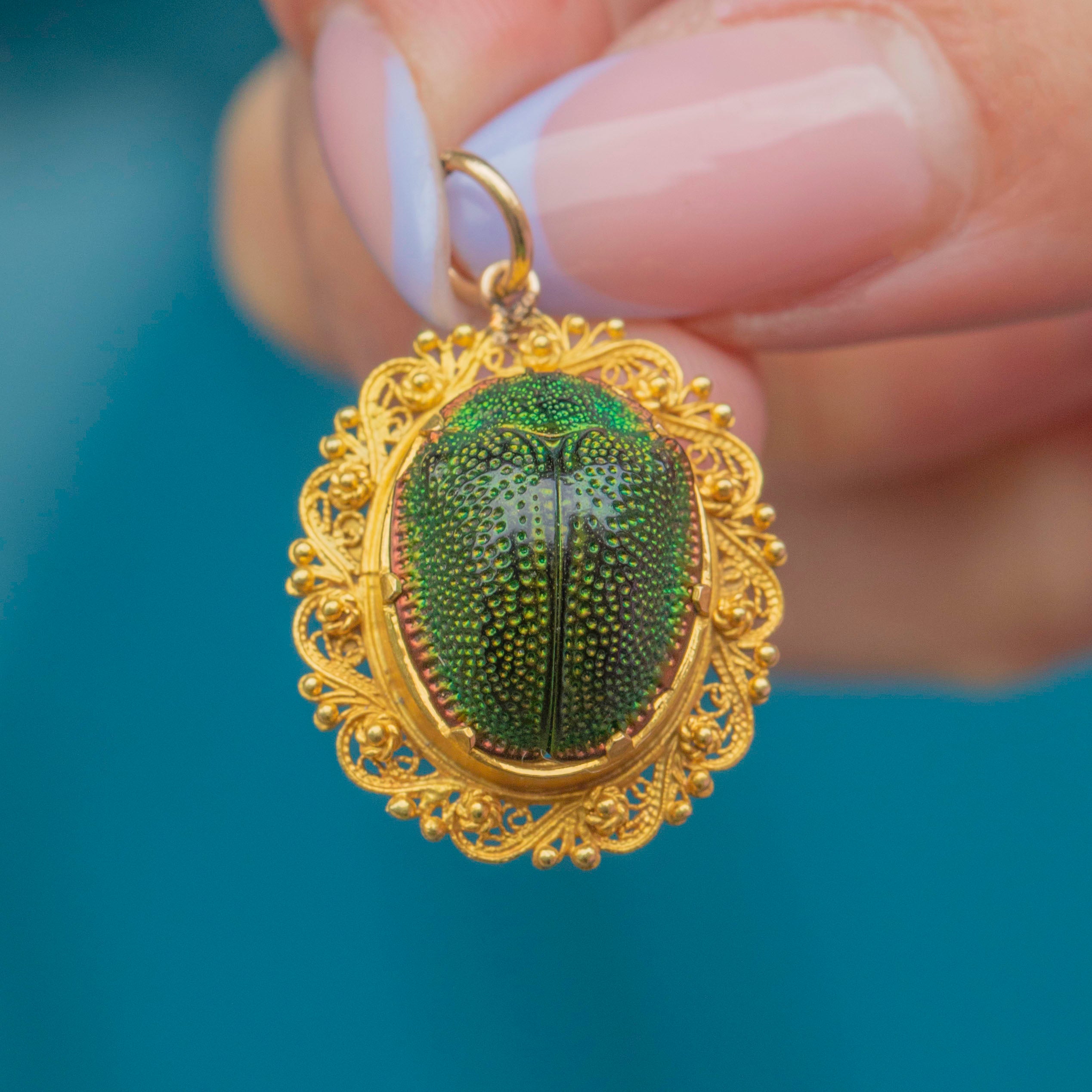 EXCELLENT: This Victorian 18ct Gold Scarab Beetle filigree pendant is in excellent antique condition. The beetle itself is in lovely condition, perfectly preserved, and free from damage. Her 18ct Gold filigree border is in pristine condition - bright and beautiful with no dings or dents. Firmly attached to the Gold jump-ring, this characterful pendant will become your new favourite item!