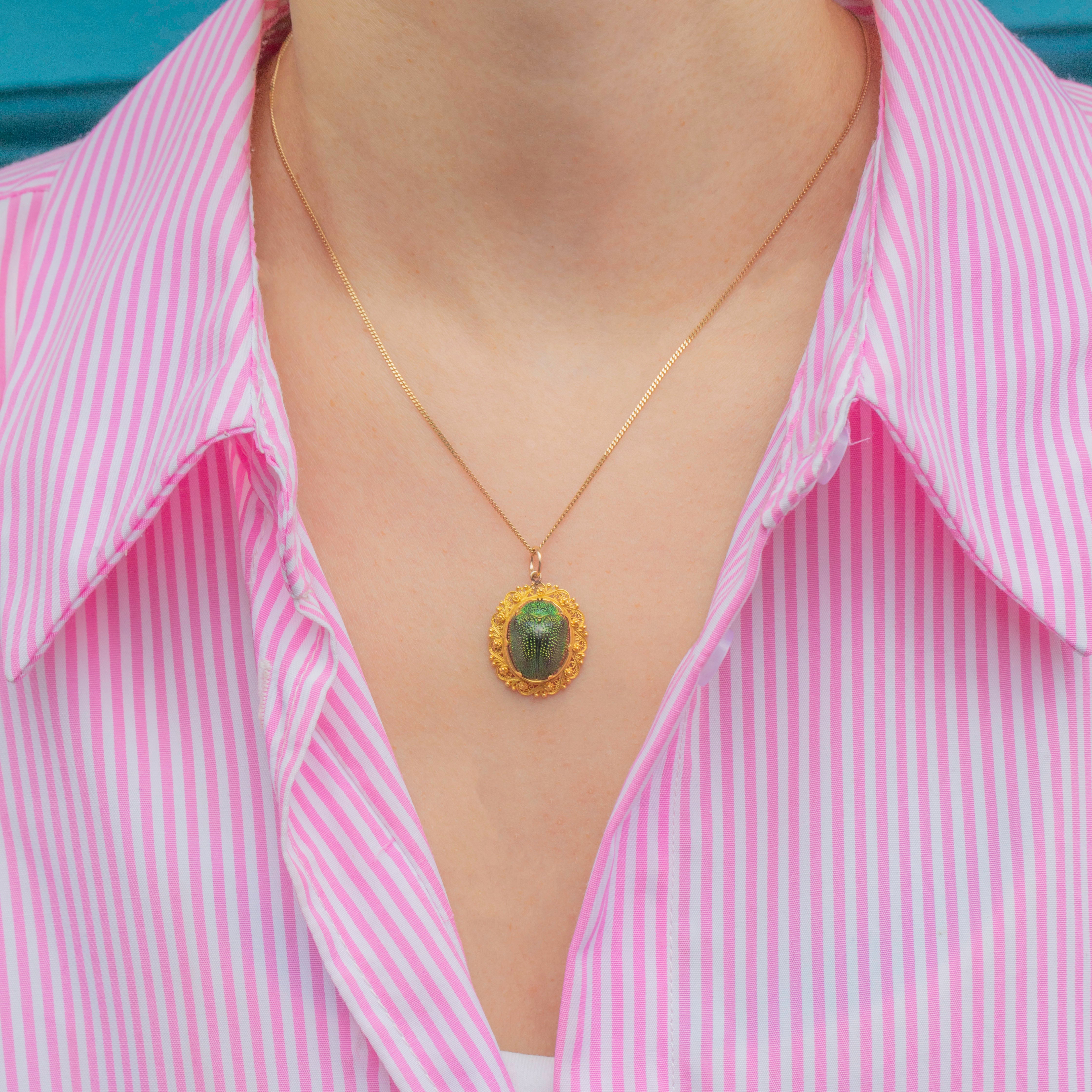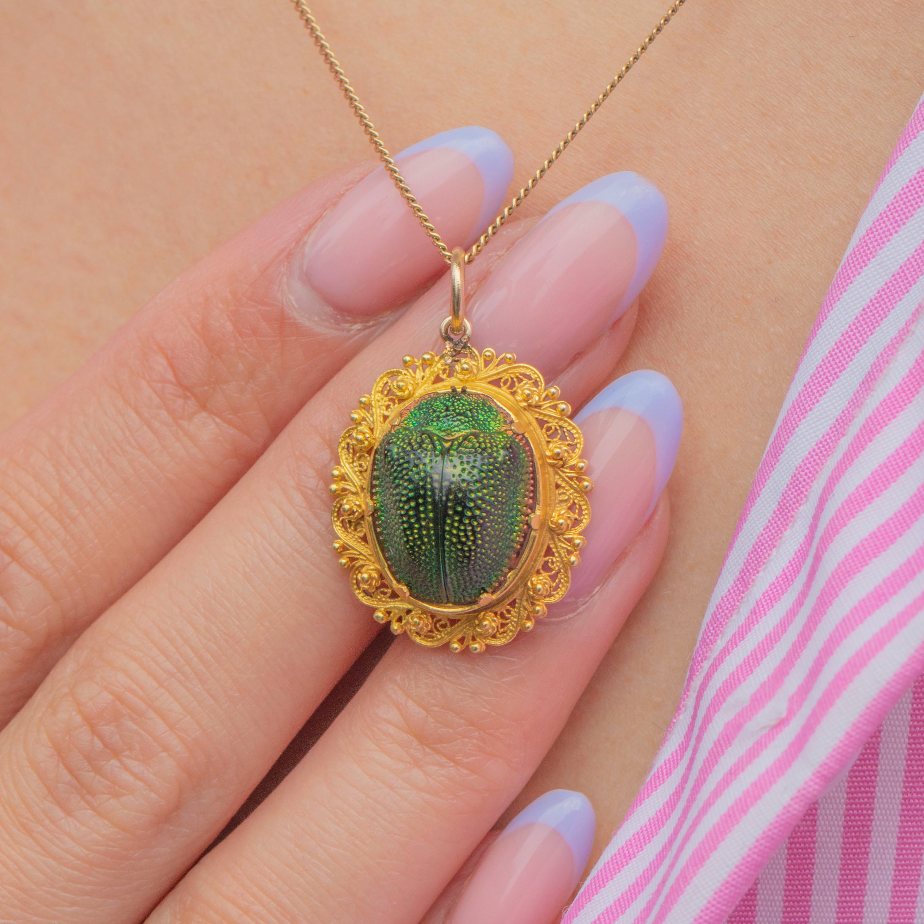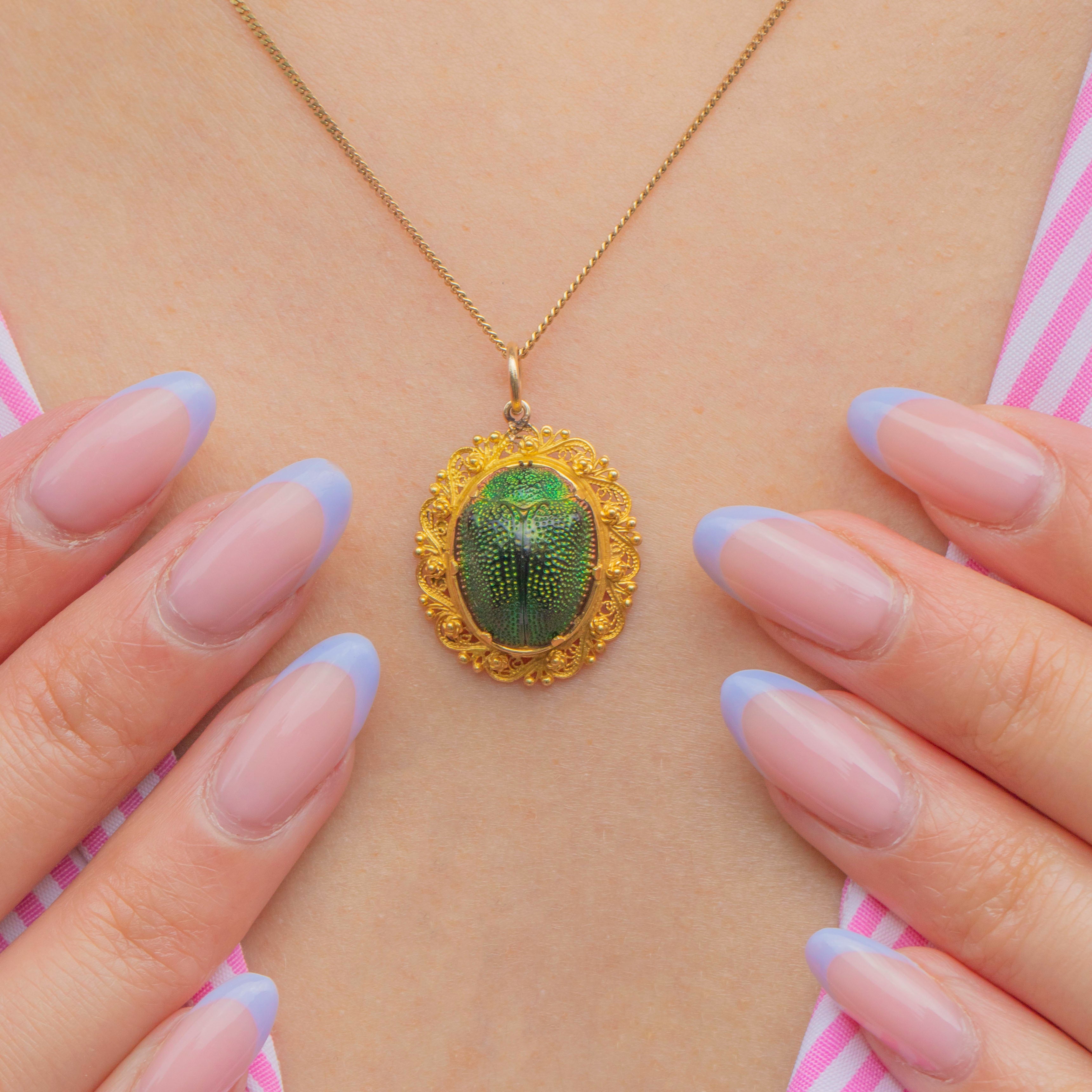 Scarab beetle jewellery peaked in popularity during the Victorian era, but has remained a symbolic token since ancient Egyptian times, symbolising the circle of life and immortality. This natural Scarab Beetle has an iridescent green shimmer, catching the light beautifully.