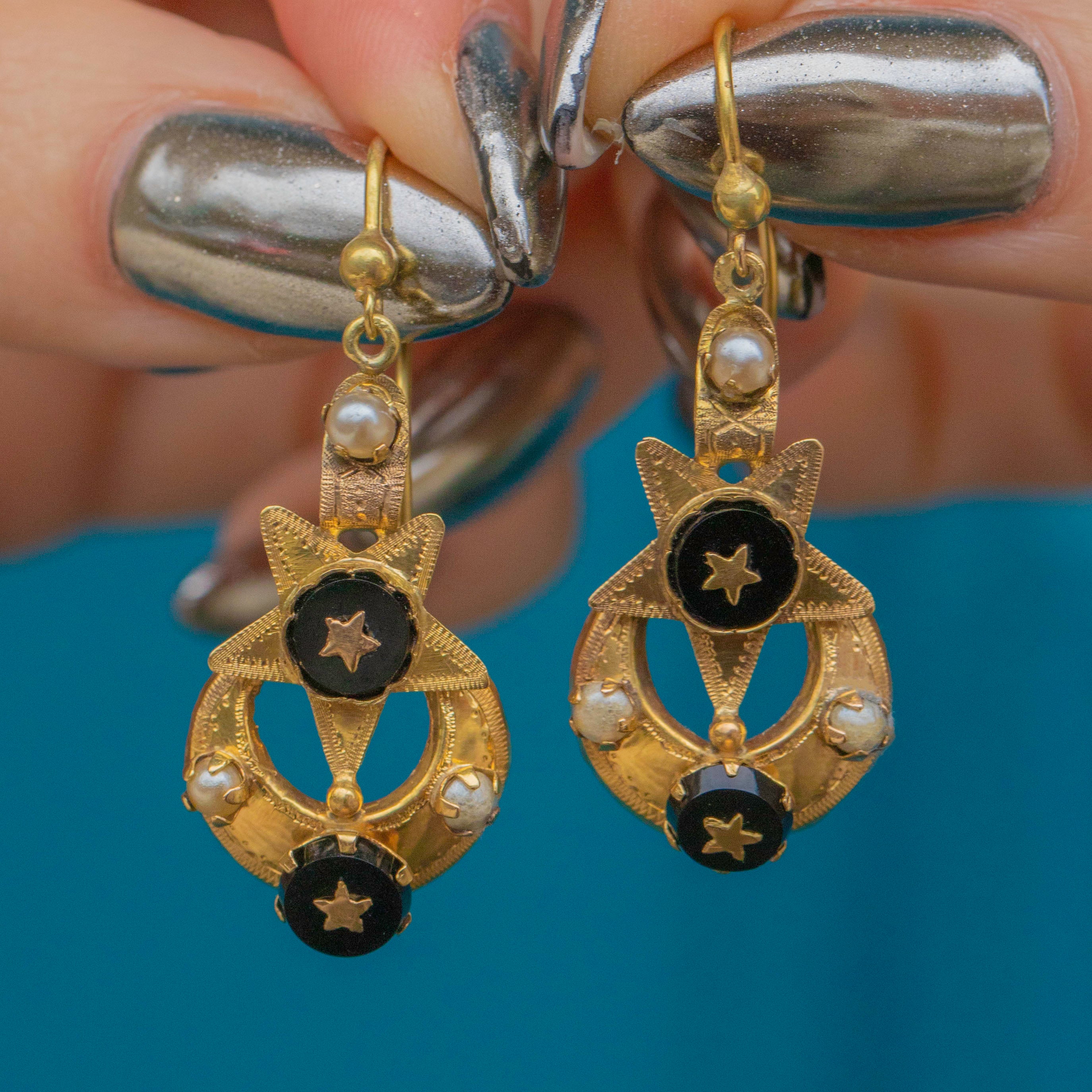 This pair of Victorian 18ct Gold star Onyx drop earrings are a celestial dream! Crafted from 18ct Gold, this unique pair of Victorian earrings have been inlaid with midnight black Onyx, and moonlit Pearls.