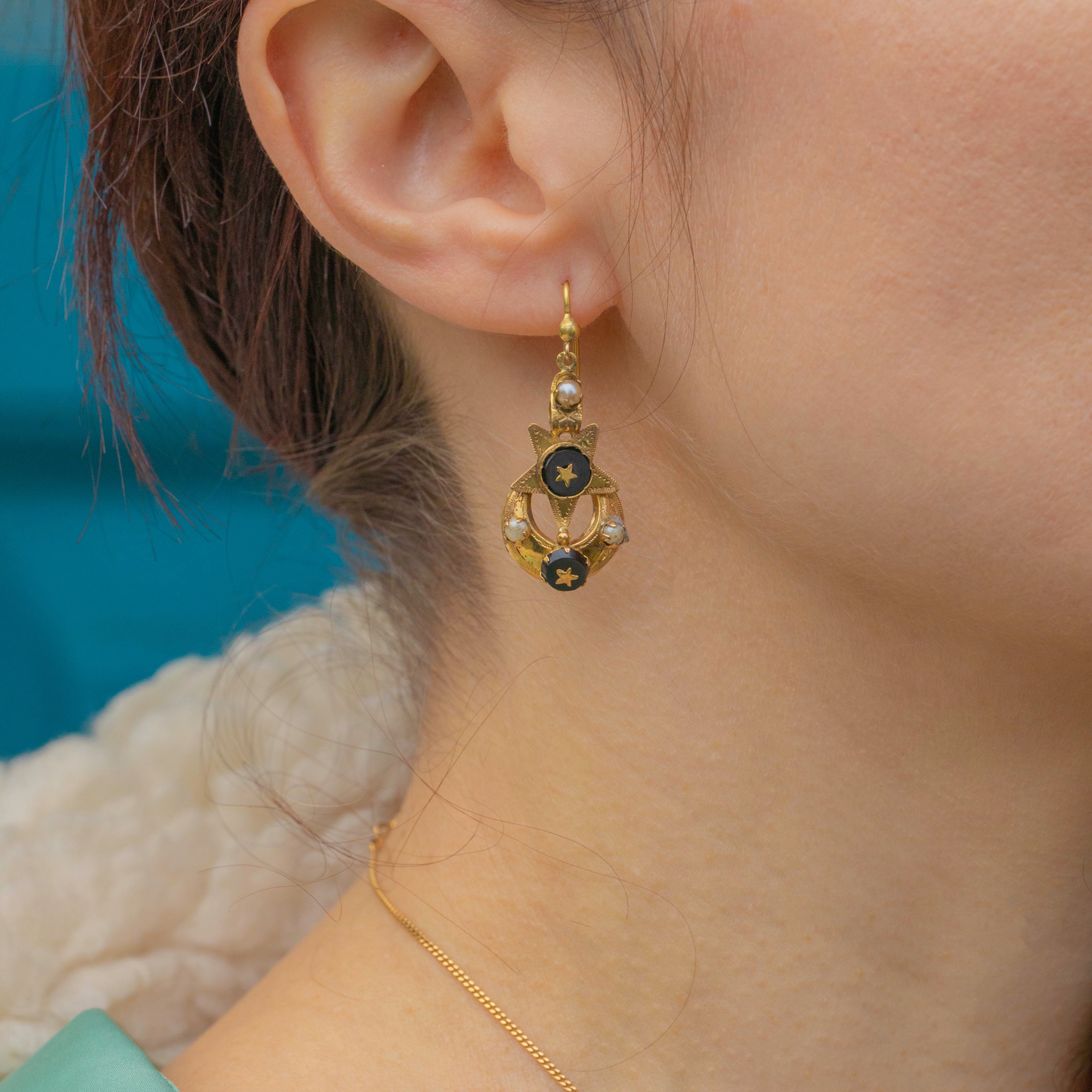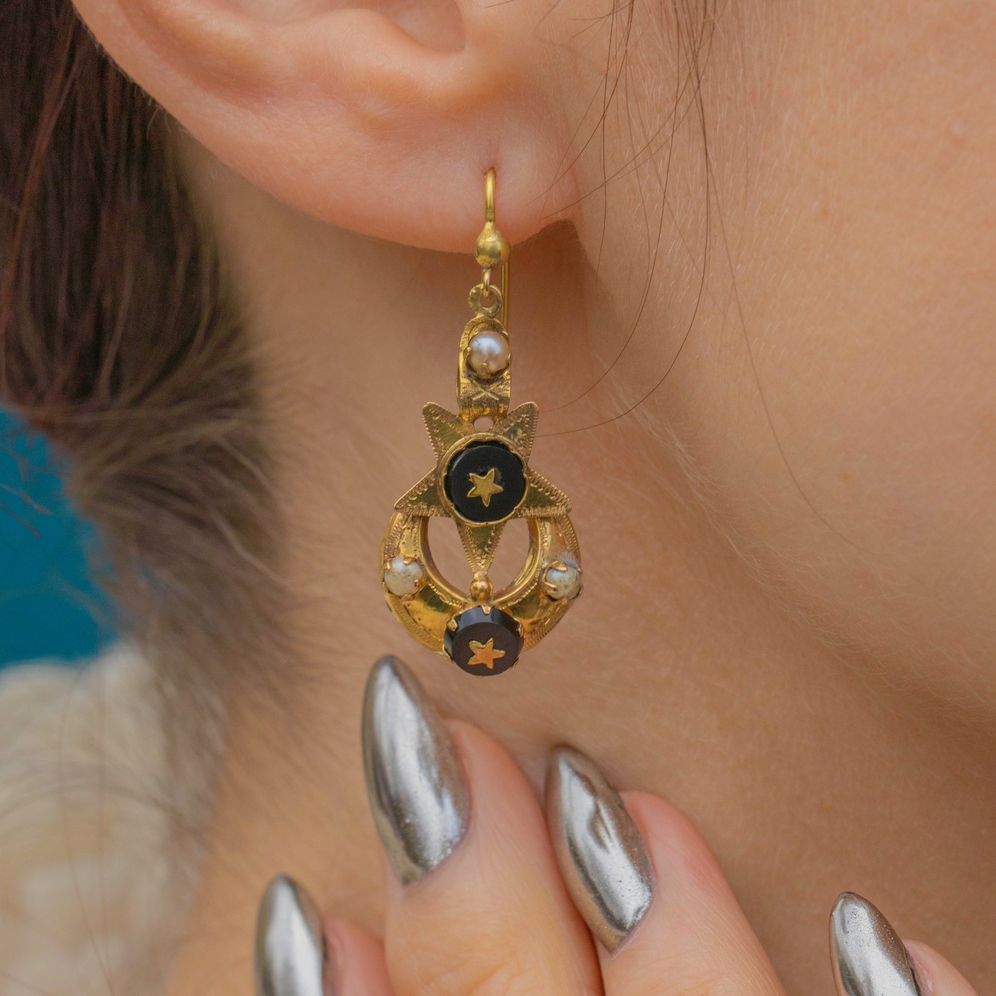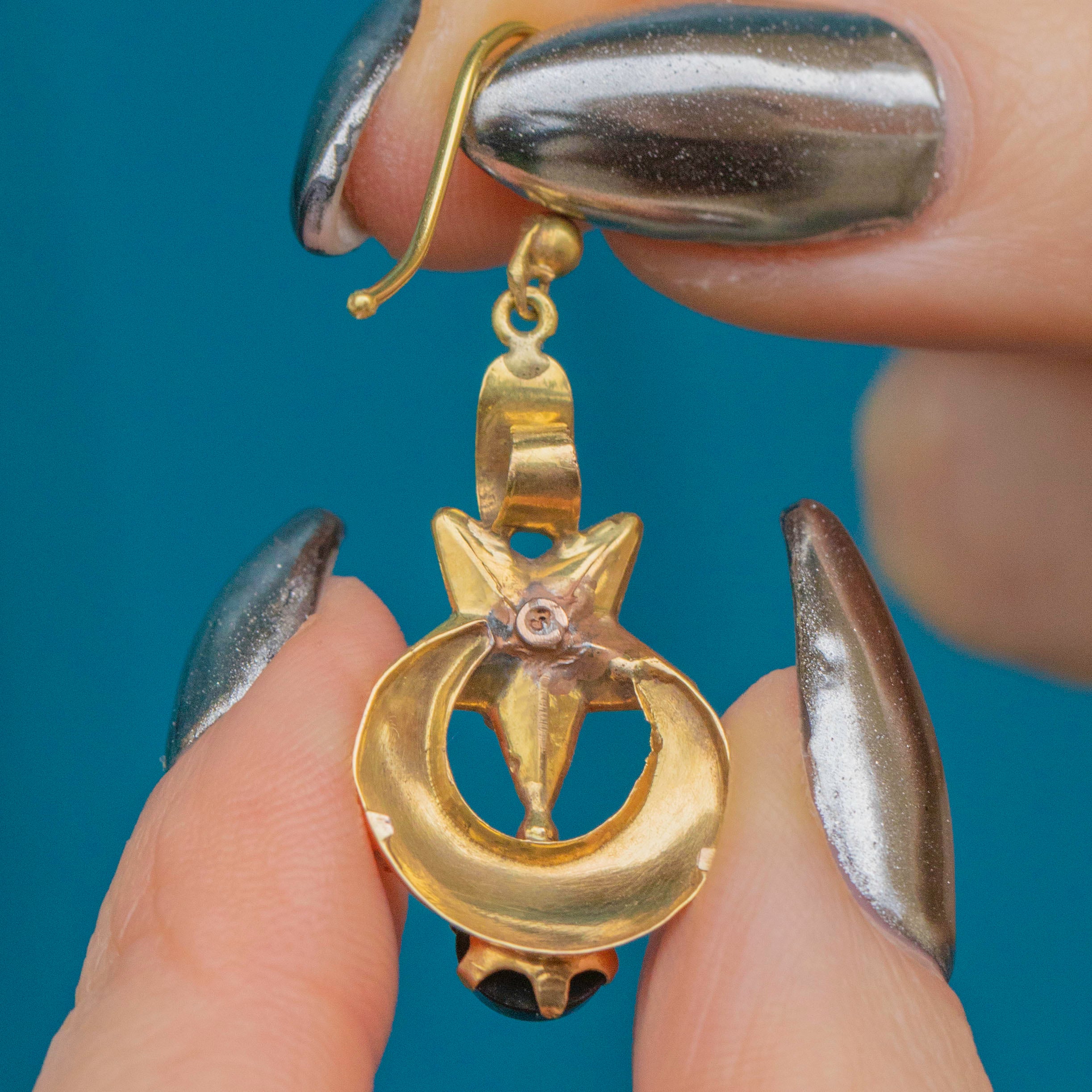 VERY GOOD. These Victorian 18ct Gold star Onyx drop earrings are divine! In very good condition, the earrings have been beautifully constructed. The earrings are set with Onyx, and plump Pearls that have retained a beautiful nacre. To the back of the pendant, there is a solder mark where the star meets the moon, but this would have been carried out by hand during the Victorian period when there weren't the same technological advances as there are today! A splendid pair of earrings.