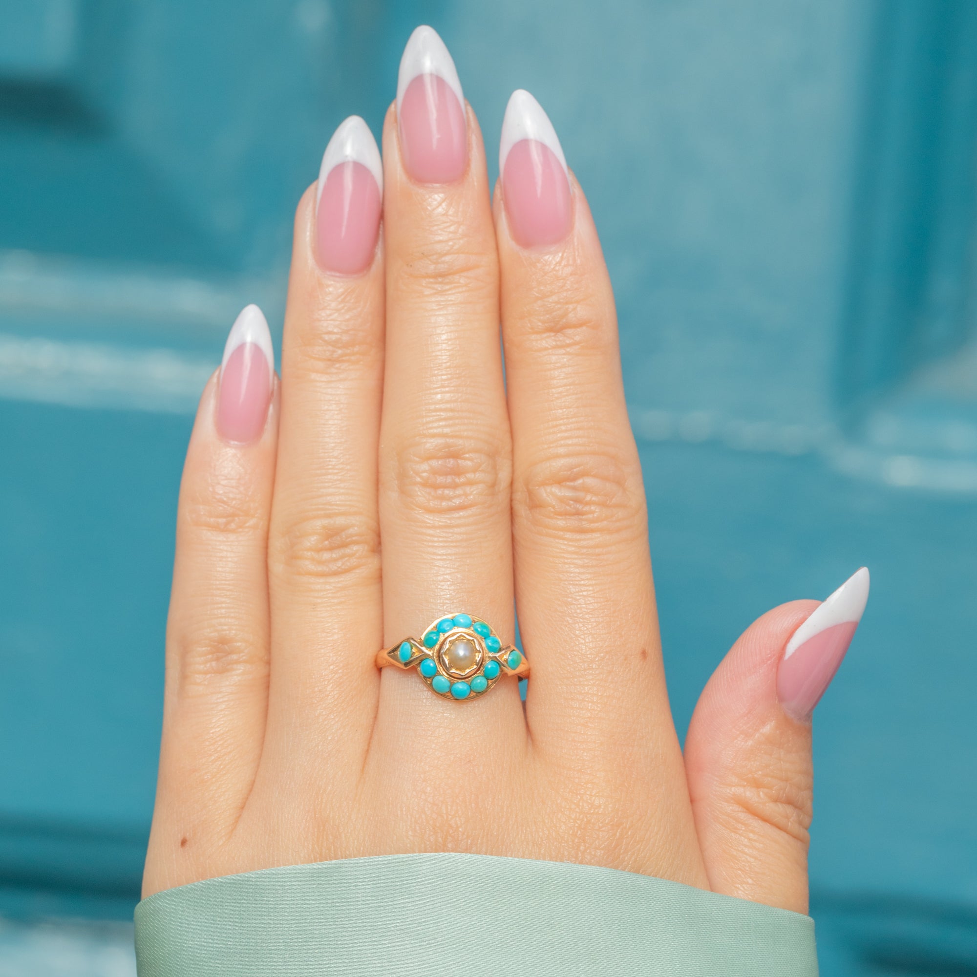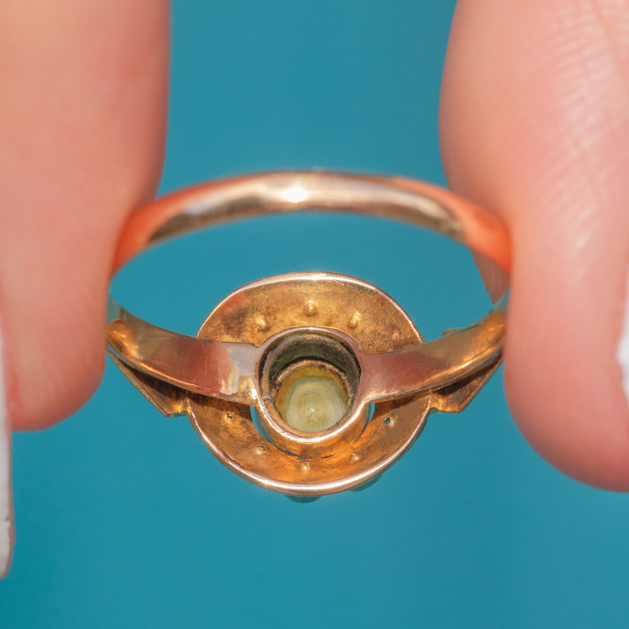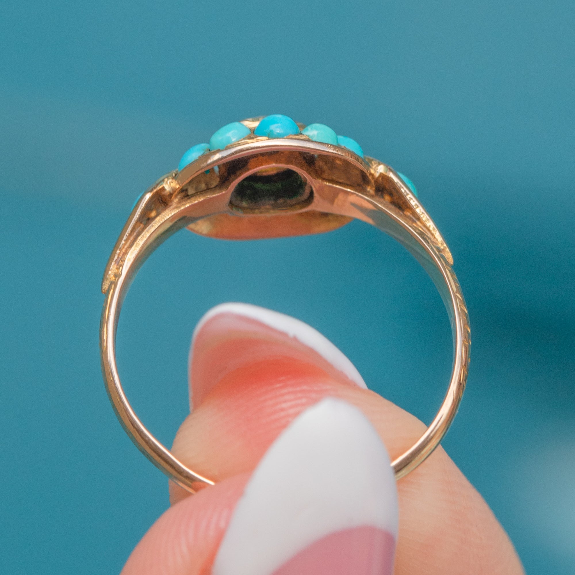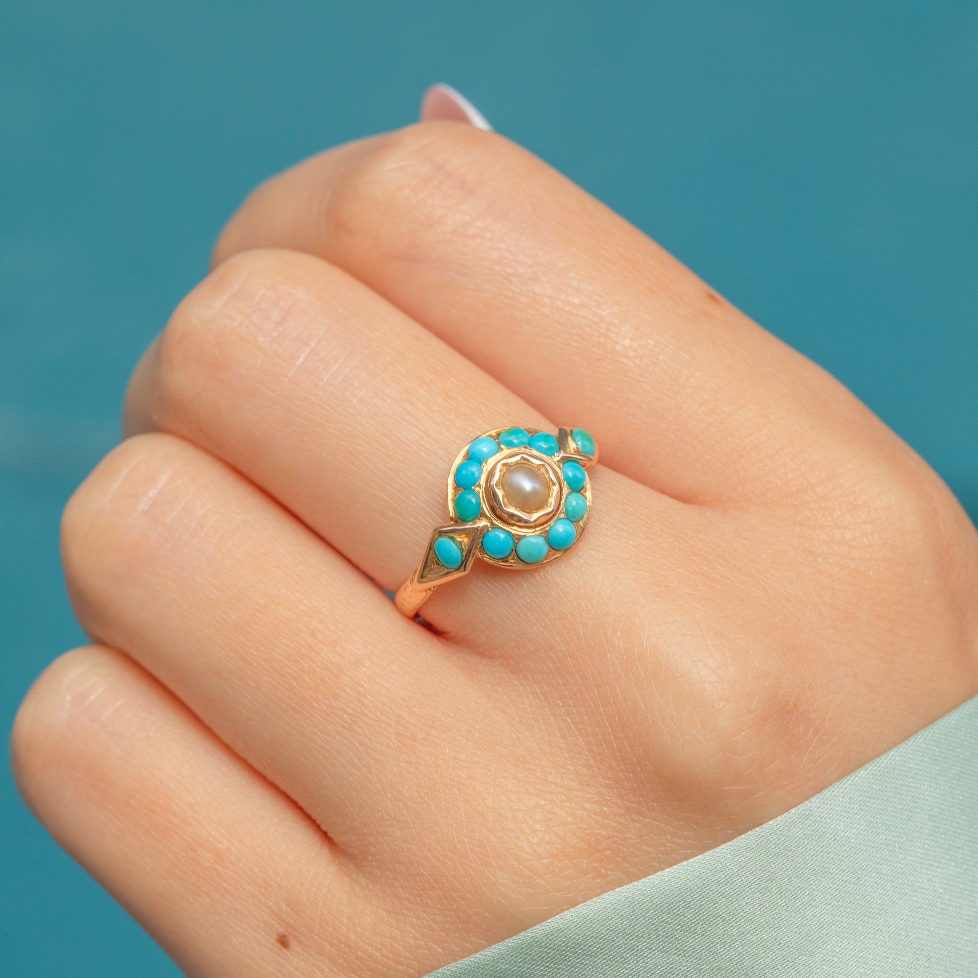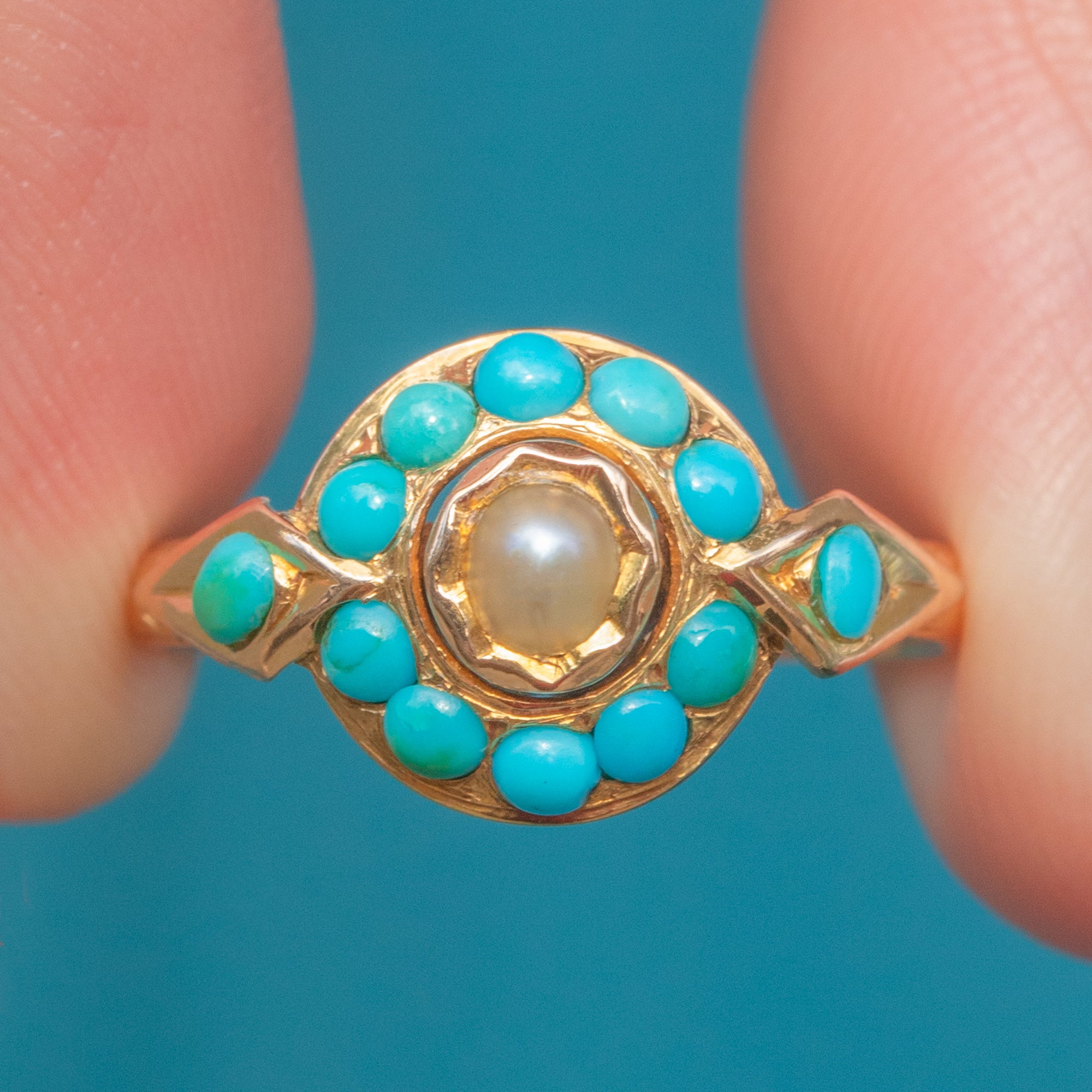 The Pearl is encircled by a halo of Turquoise gemstones, each with a distinct blue-green hue that complements the iridescence of the Pearl perfectly. Complete with engraved shoulders, this Victorian cluster ring simply radiates antique charm.